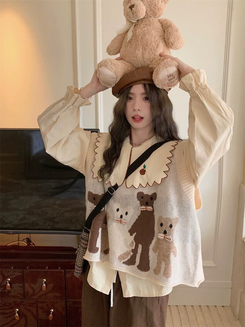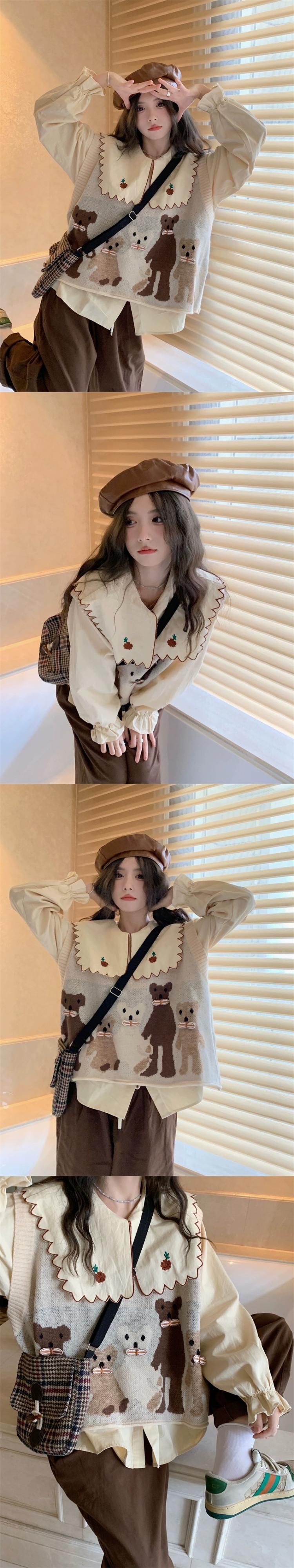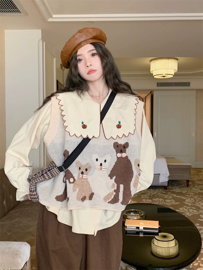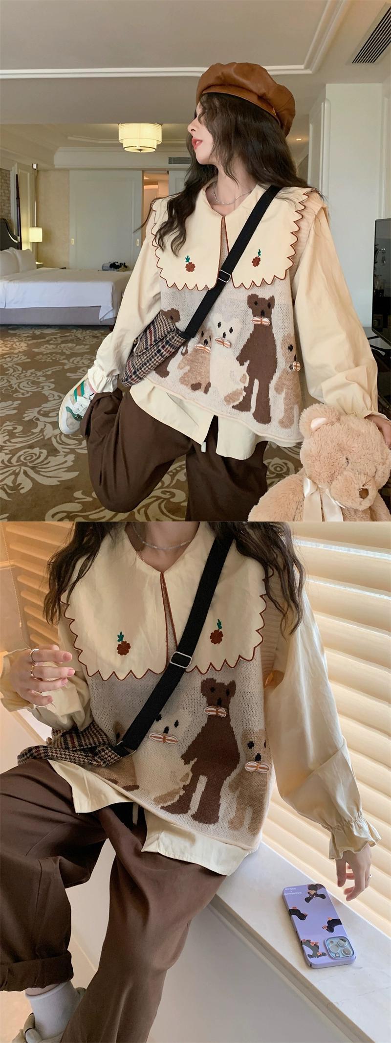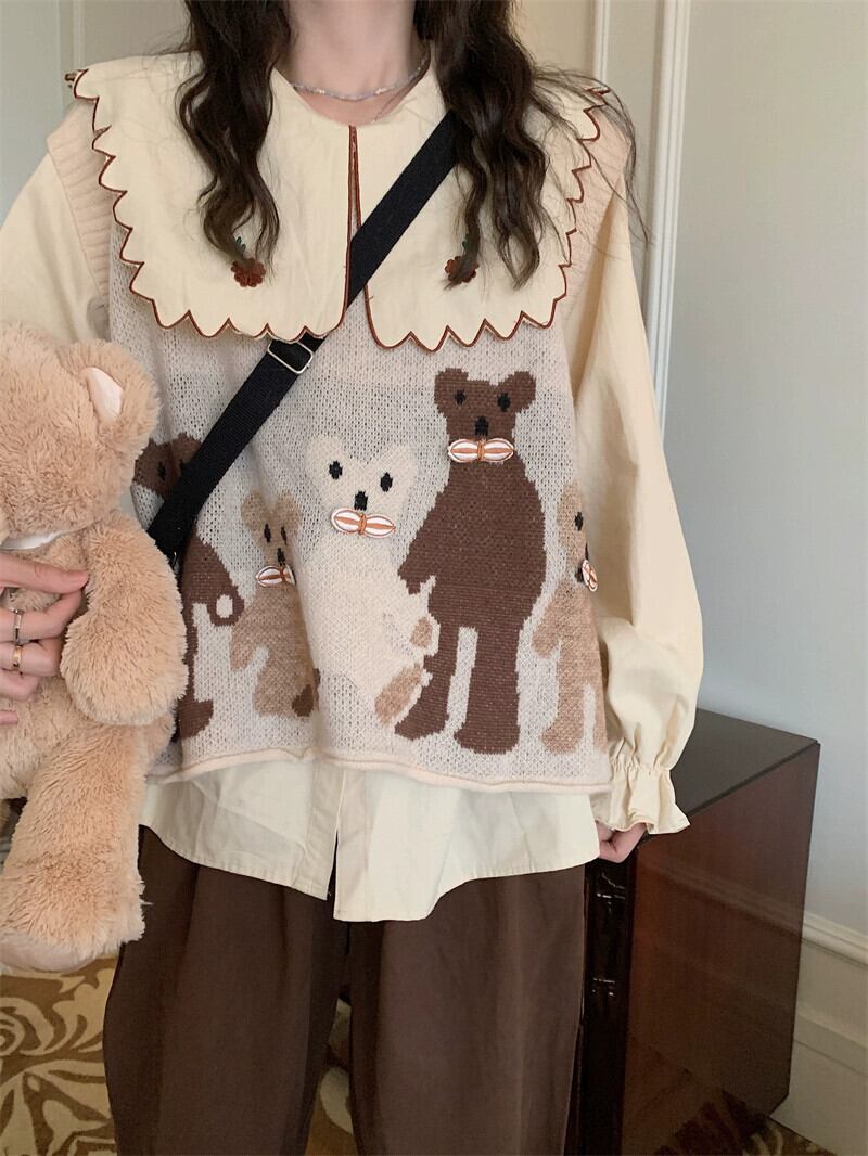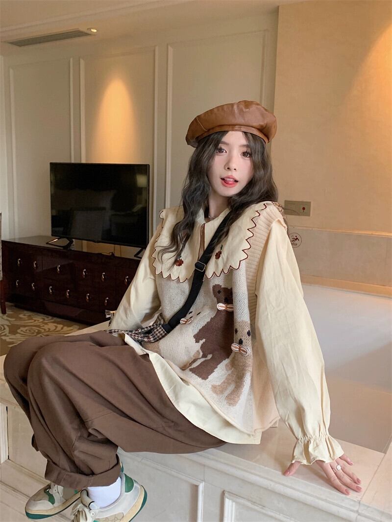色:コーヒーカラーパンツ,刺繍入りシャツ,猫ベスト