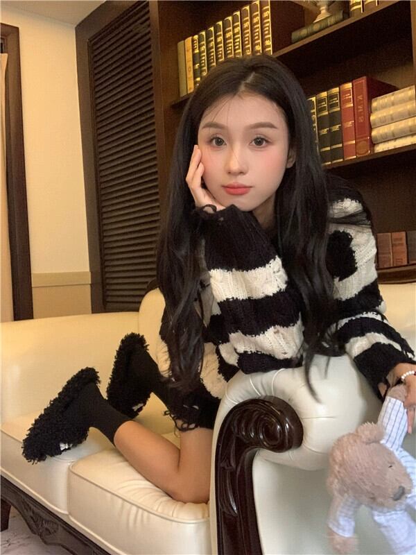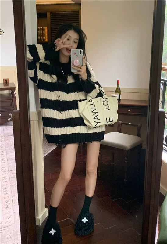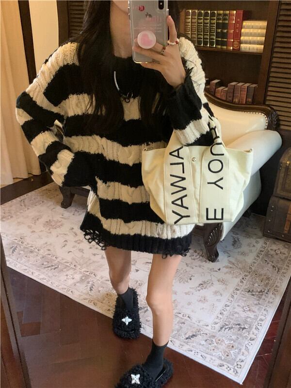 ユーズド加工ストライプセーター女性の秋 2023 ニットセータールーズレイジーニッチ長袖トップ ロング オータム 秋物 8571689980029167