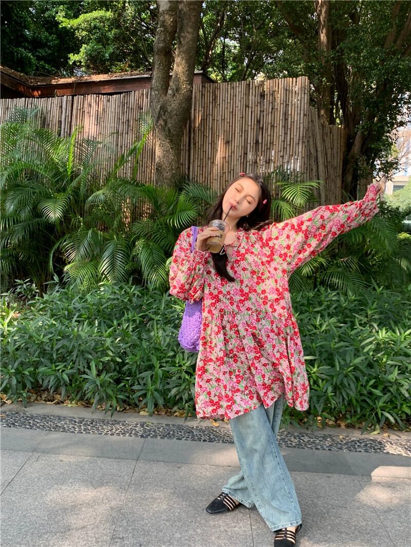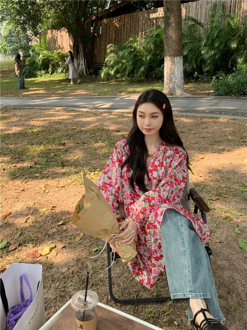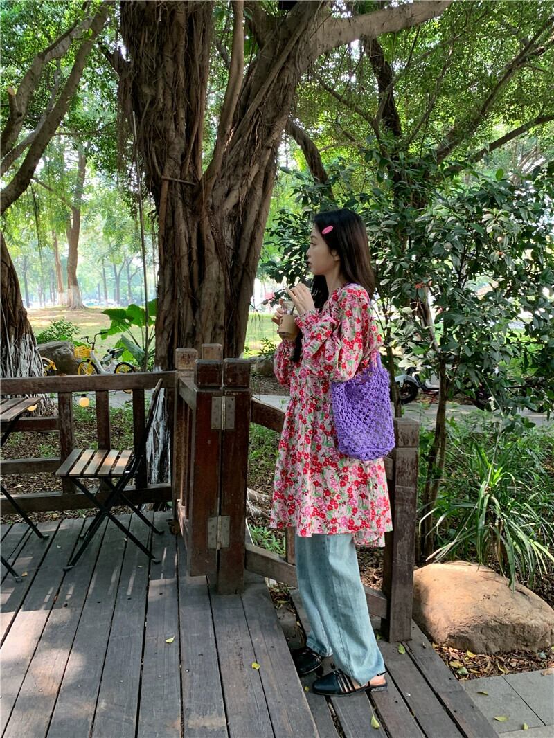 2023年秋の長袖花柄ドレス女性、美乳の新スタイル、ふふ、今年の人気スタイル、ゆったりとしたショートスカート ロング オータム 秋物 857169170204258