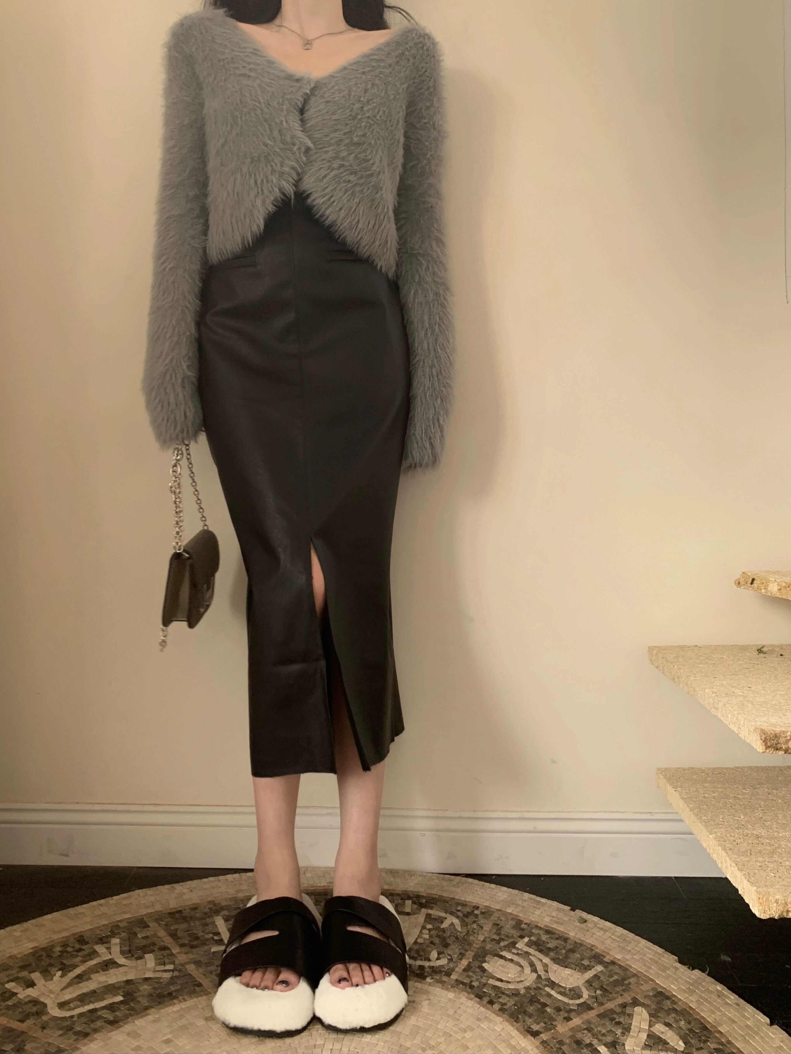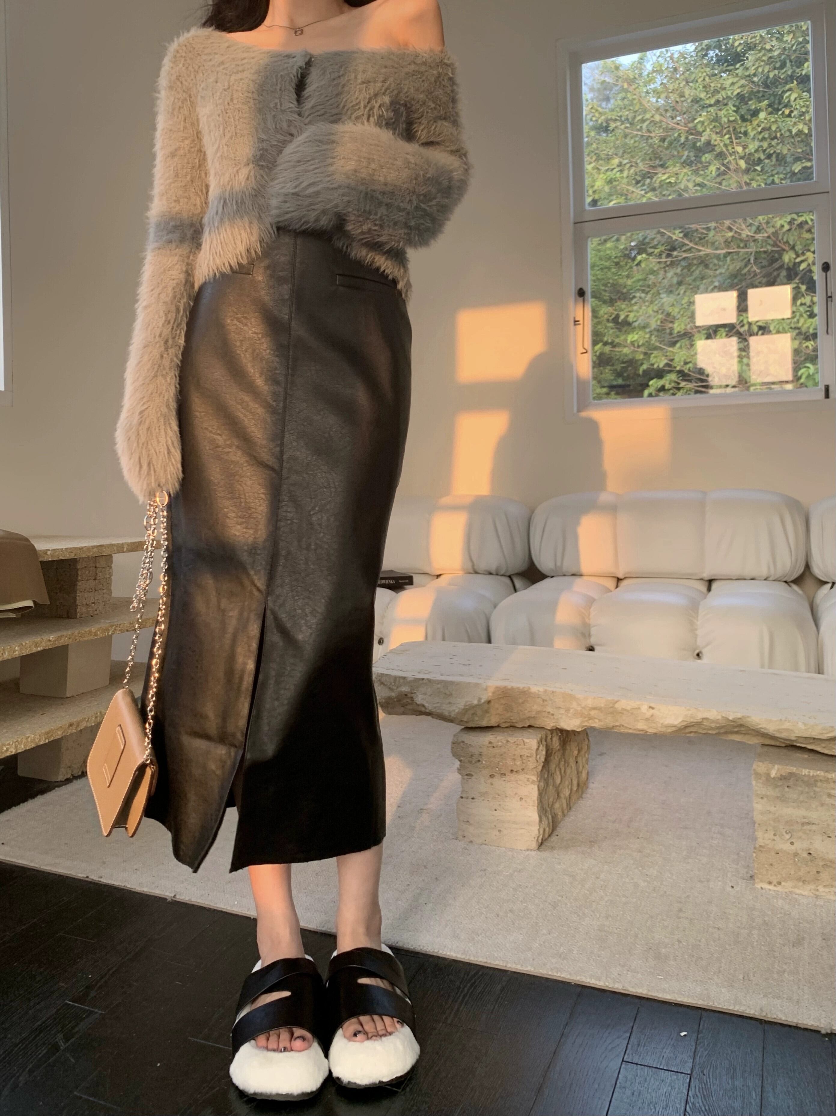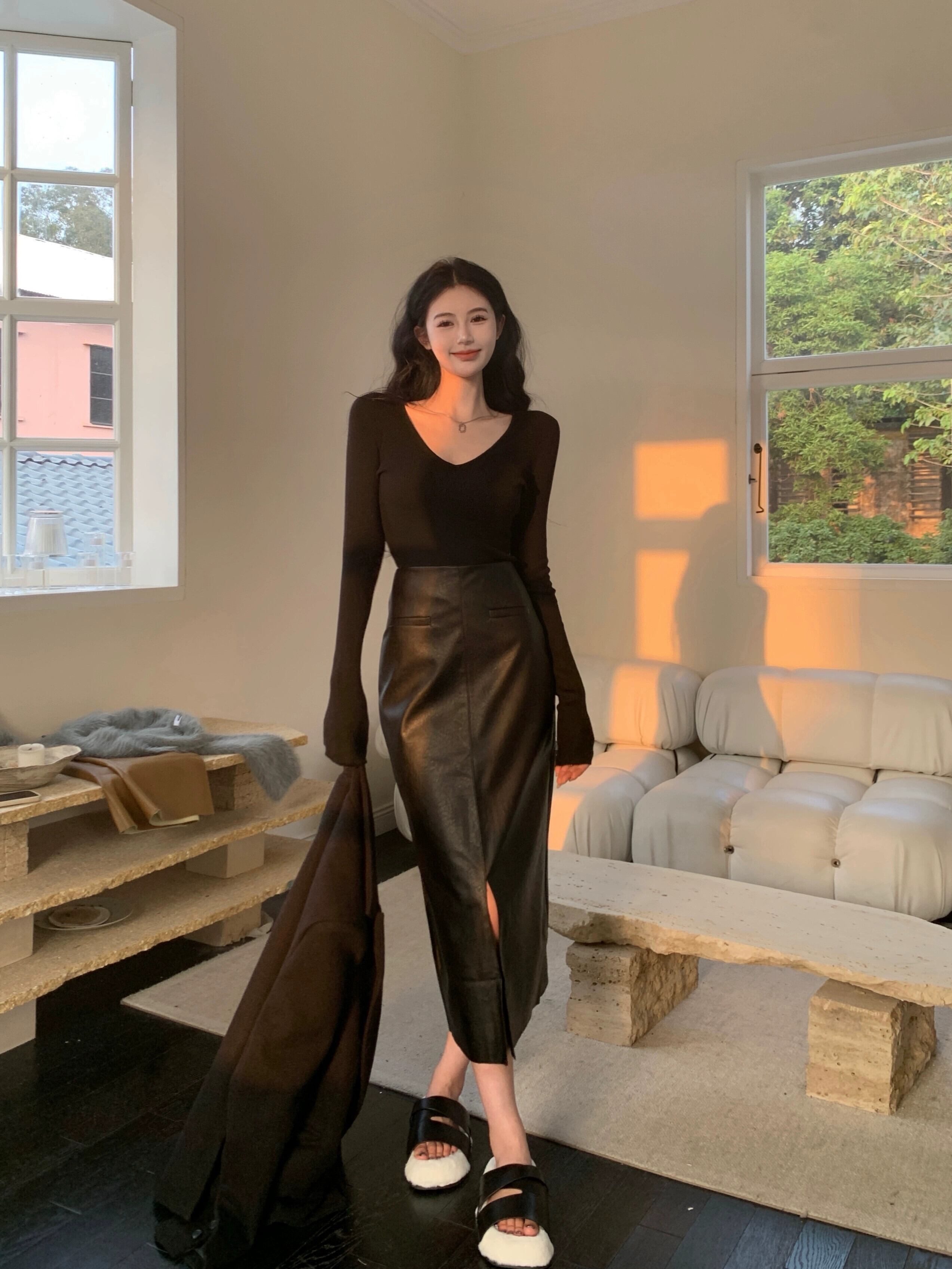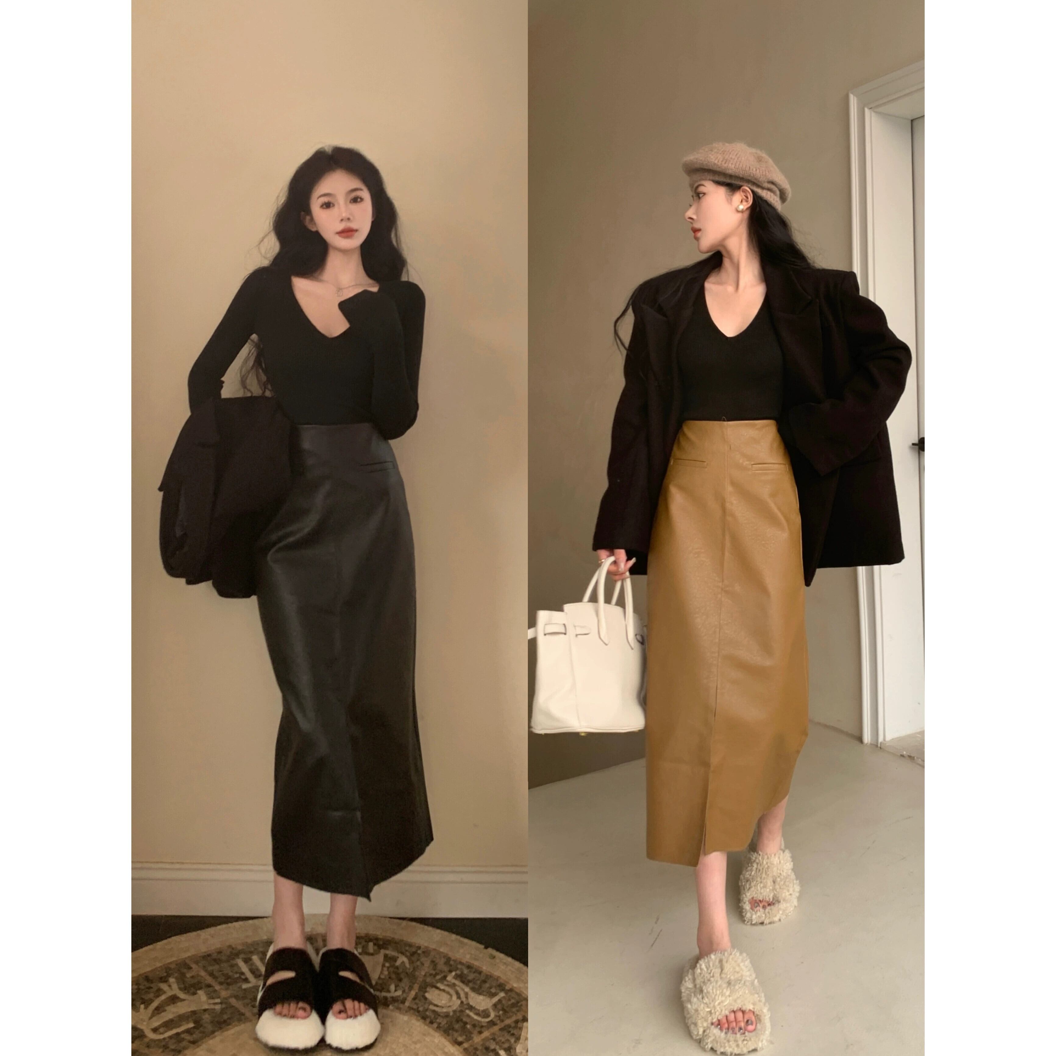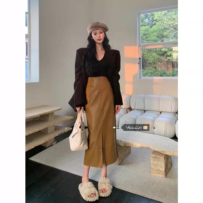 ブラウンスリットレザースカートレディース秋ミドル丈2023ウエストスリムカバーヒップAロングスカート オータム 秋物 8571652939499982