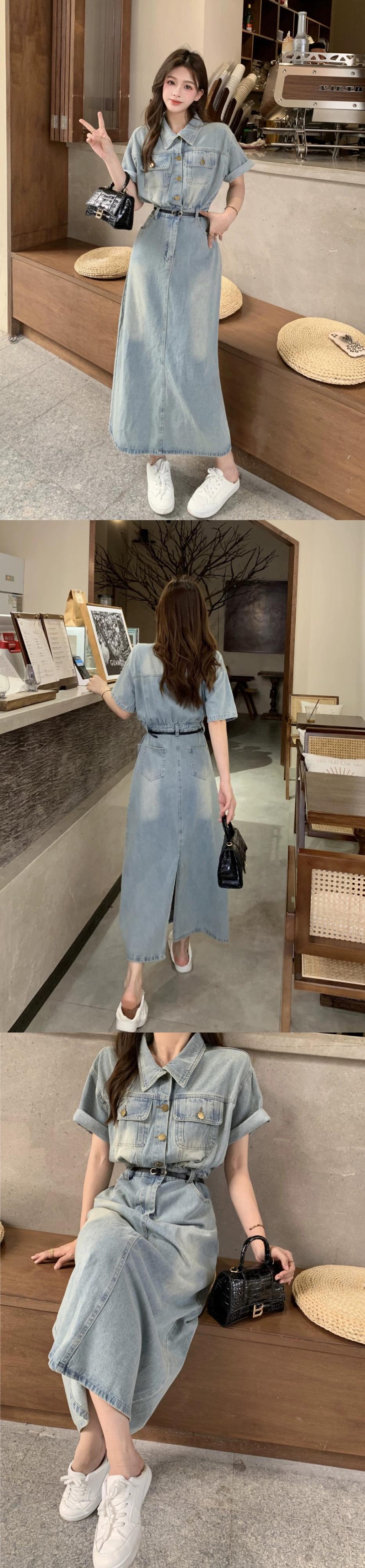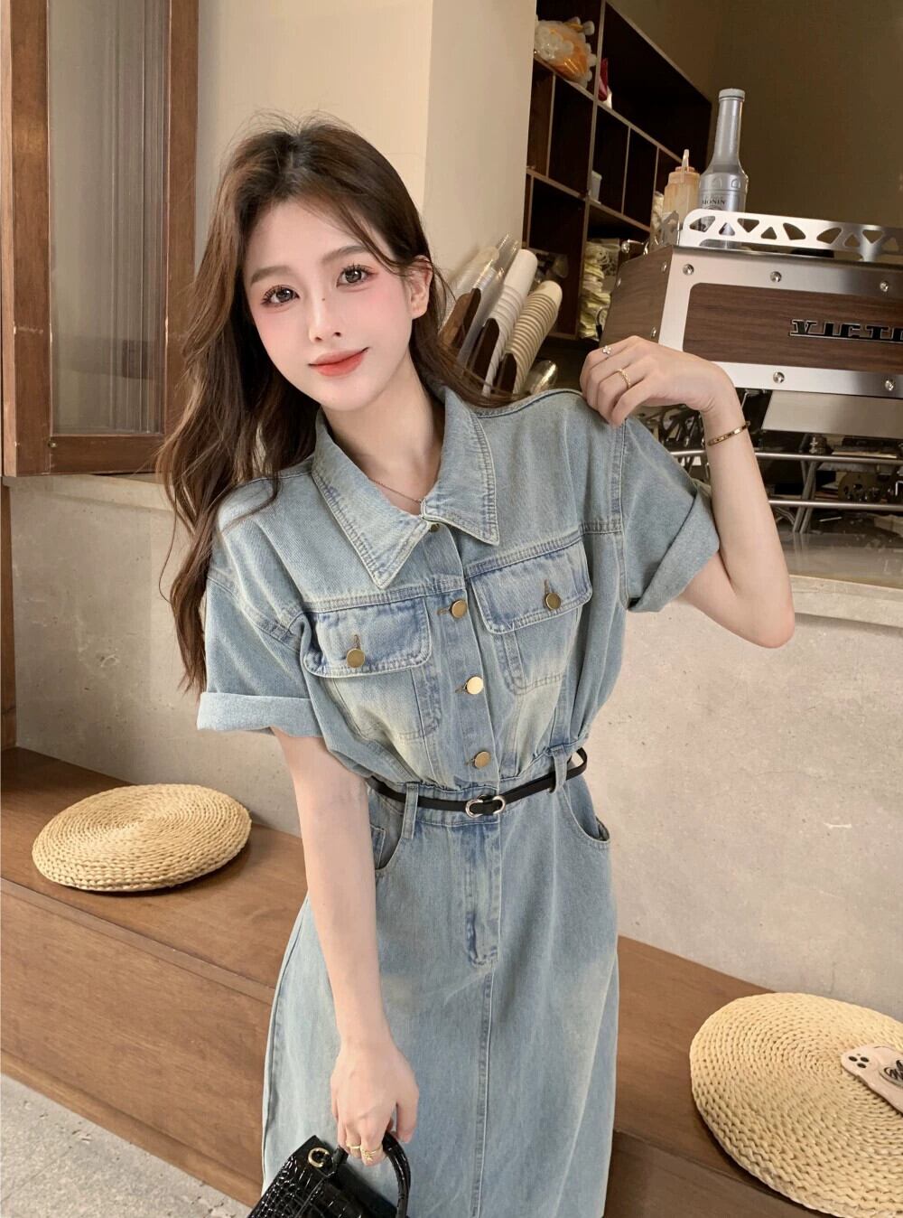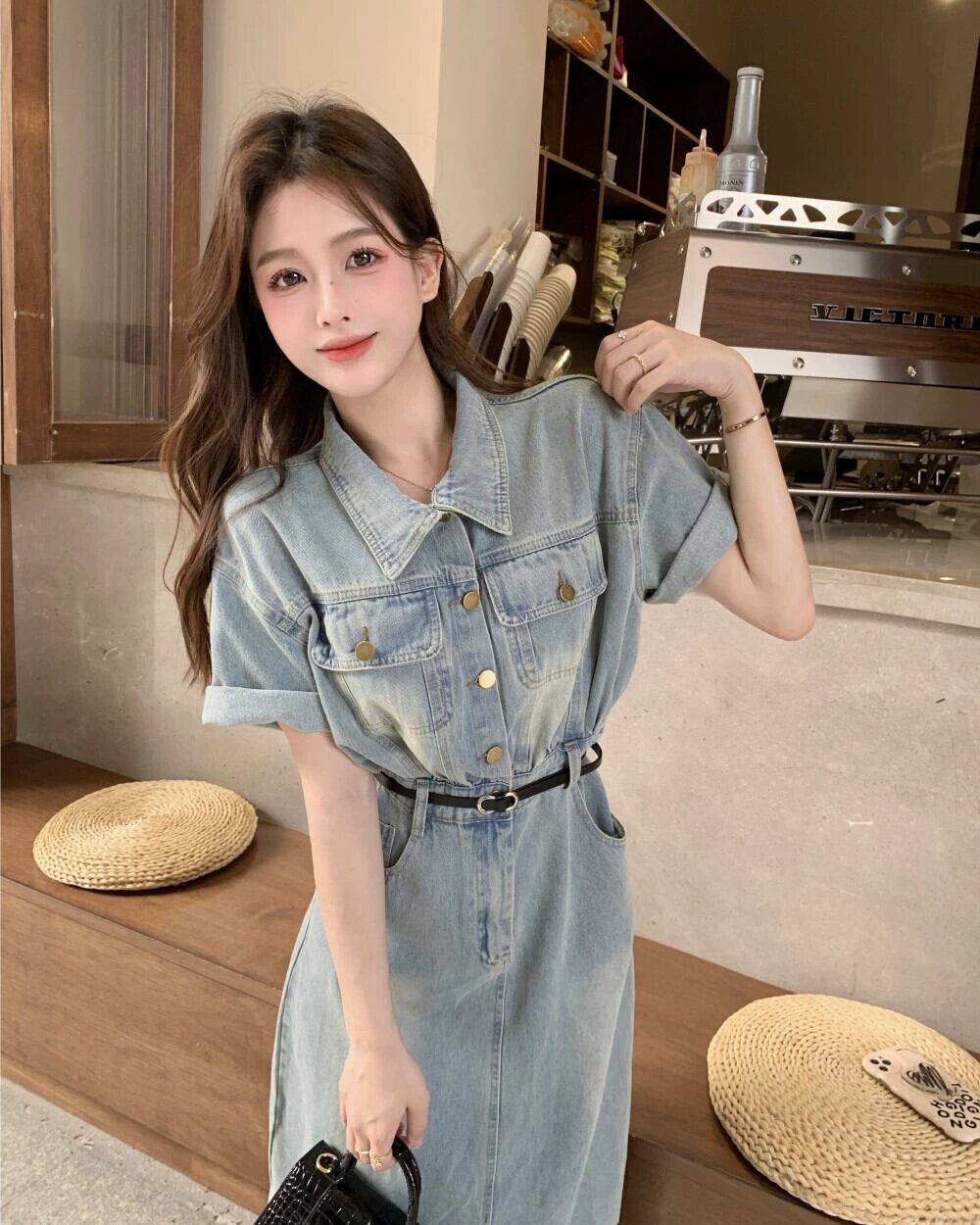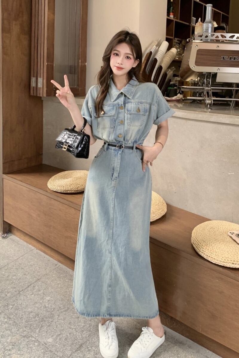 ライトブルー半袖デニムドレス女性の夏 2023 新しい香港スタイルのレトロシックなウエスト痩身ロングスカート サマー 夏物 8571697898505139