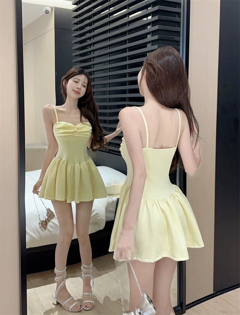 黄色のサスペンダードレスの女性の夏 2023 新しい純粋な欲望セクシーな小さな身長美しいウエストショートスカート サマー 夏物 ピュア 8571618438138588