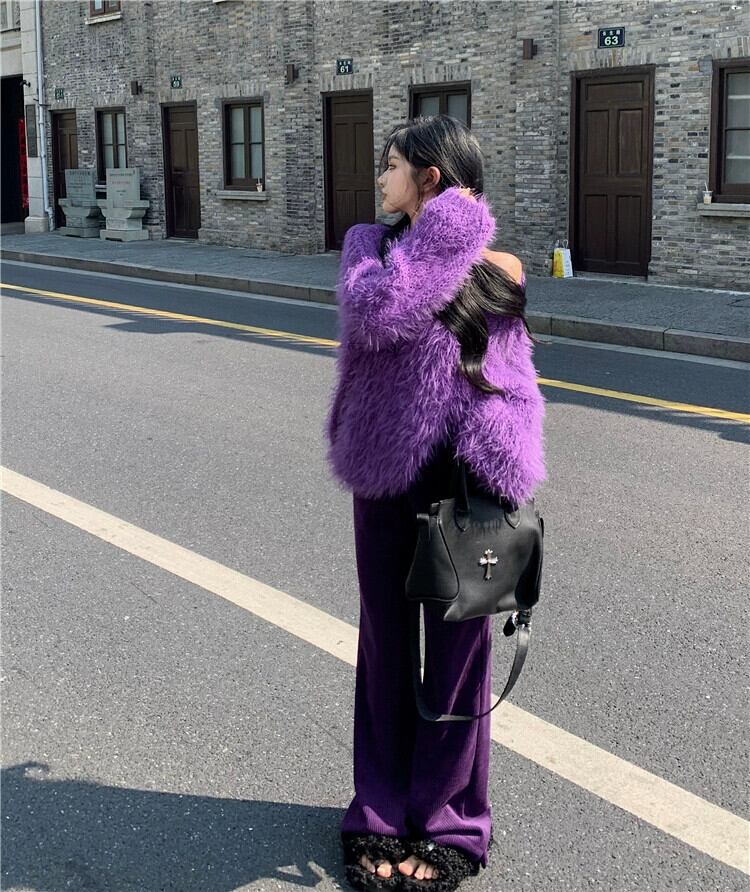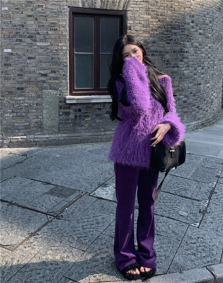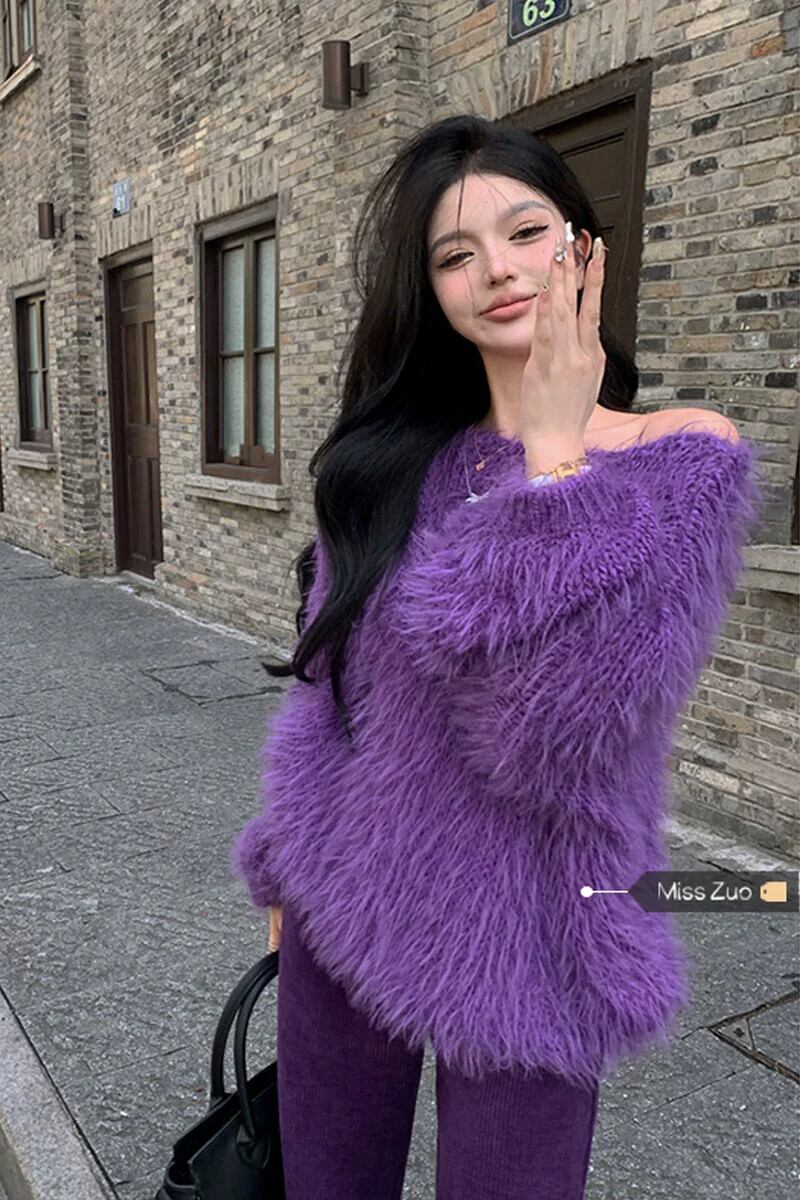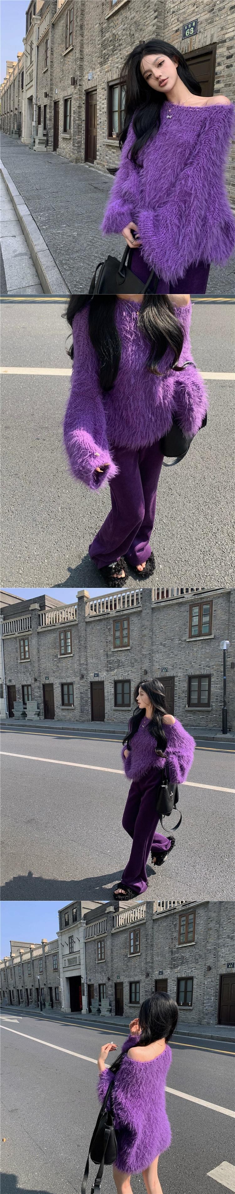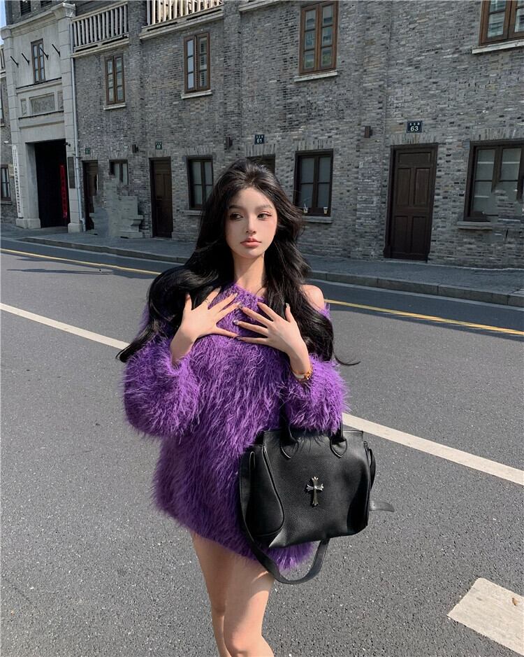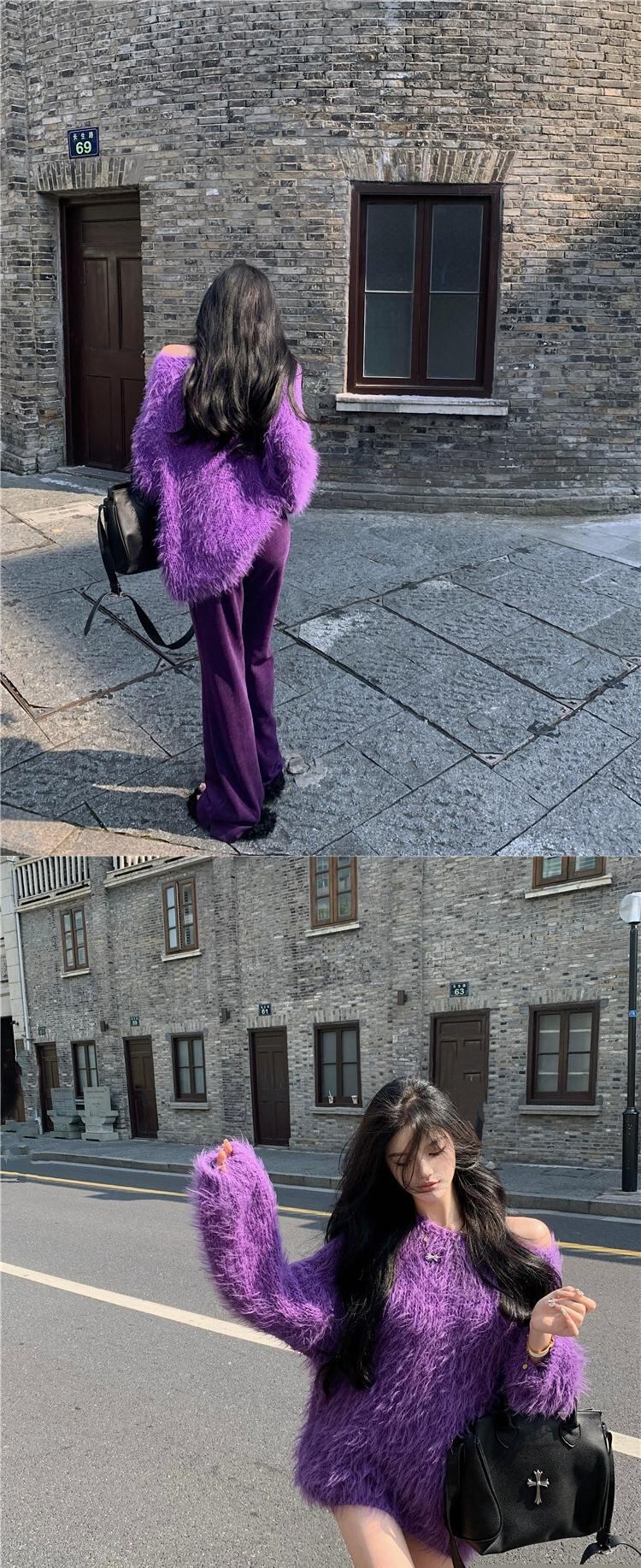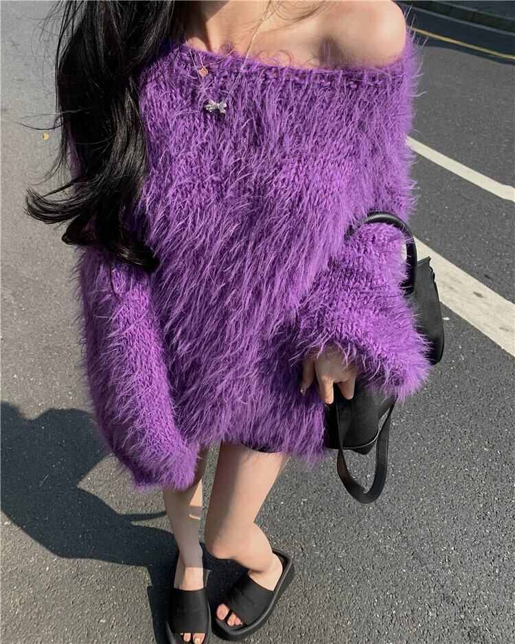 イミテーションミンクベルベットプルオーバーセーターレディース、ルーズ、レイジー、ハイエンド、秋冬デザイン、ニッチパープルオフショルダーセーター オータム 秋物 ウィンター 冬物 8571657783559692