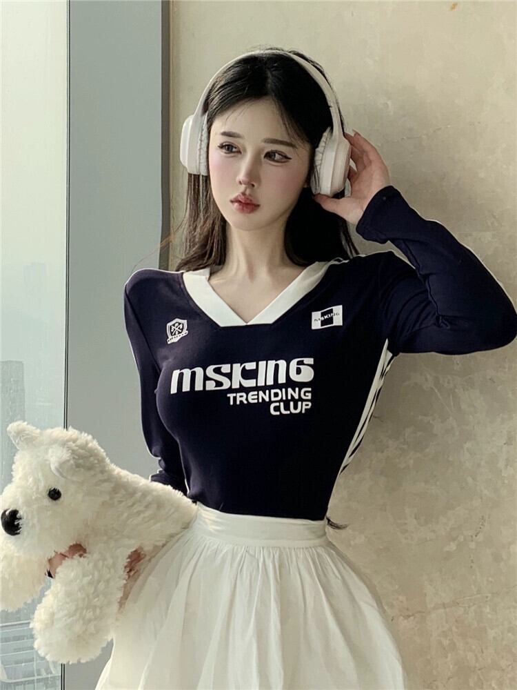アメリカンレトロ長袖Tシャツレディースデザインニッチ2023秋新作純粋な欲望ネクタイVネックショートトップ ロング オータム 秋物 ピュア 857166533626129