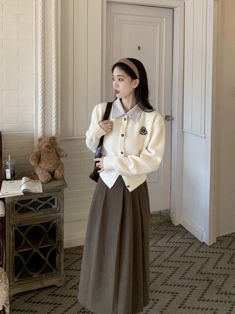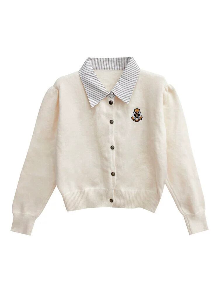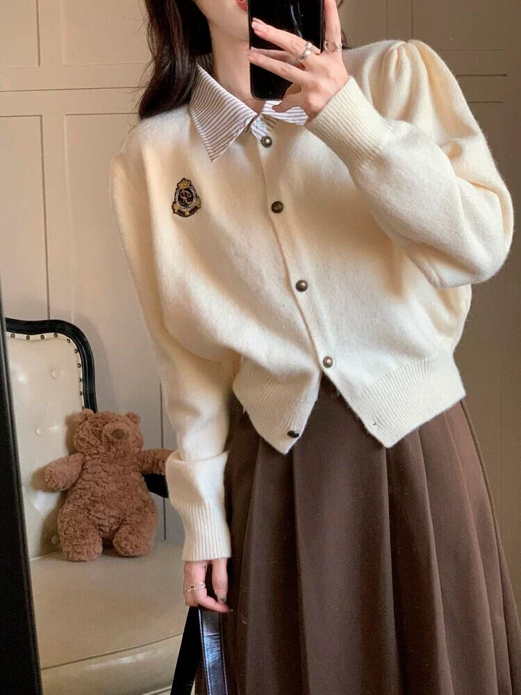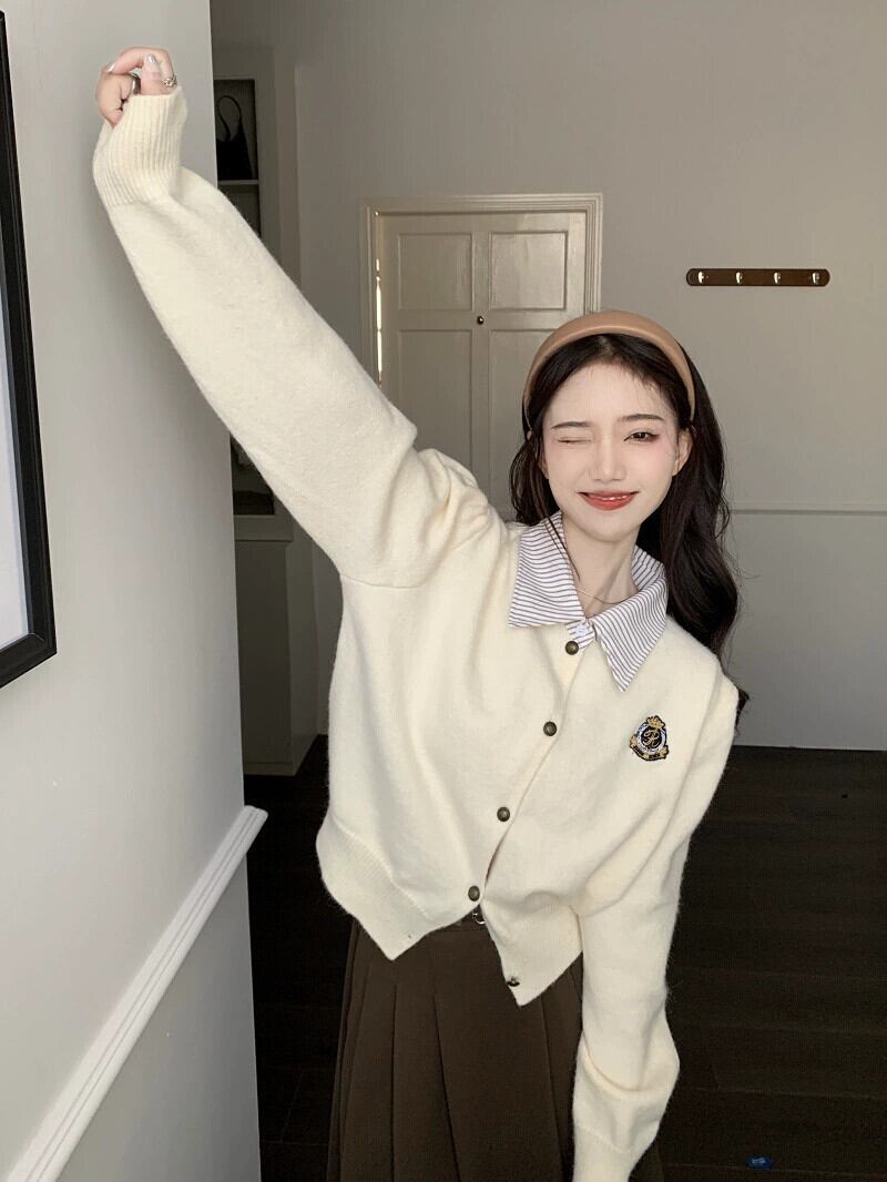 偽ツーピースポロカラーセータージャケット女性秋の新しいカレッジスタイルシックなショートニットカーディガントップ オータム 秋物 8571676995547625