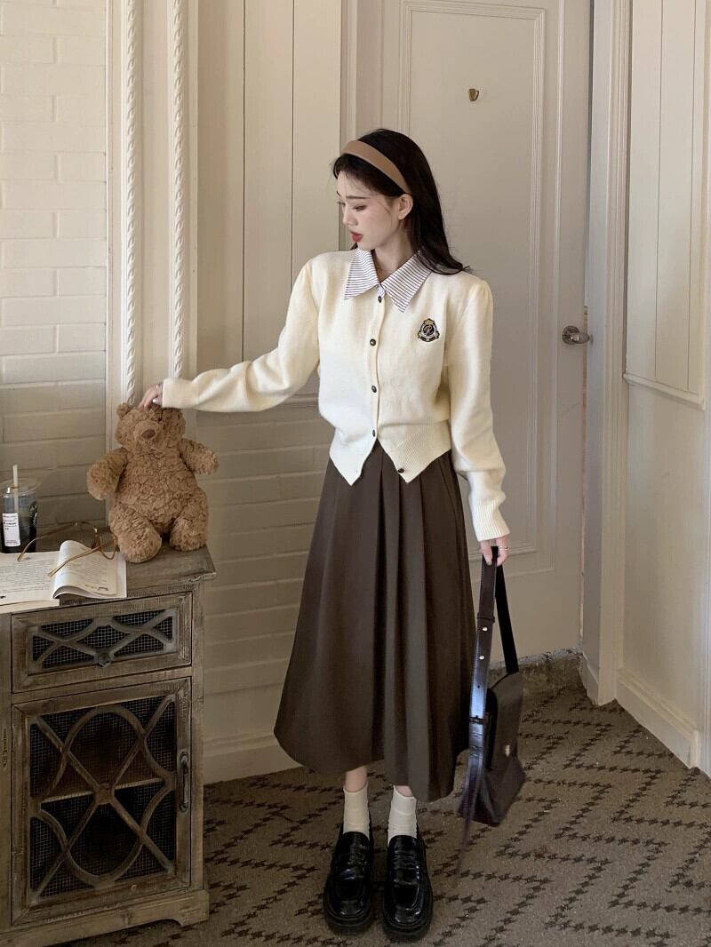 色:アプリコットトップ,茶色のスカート