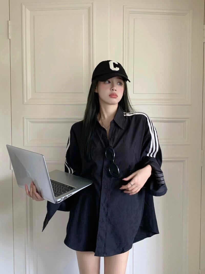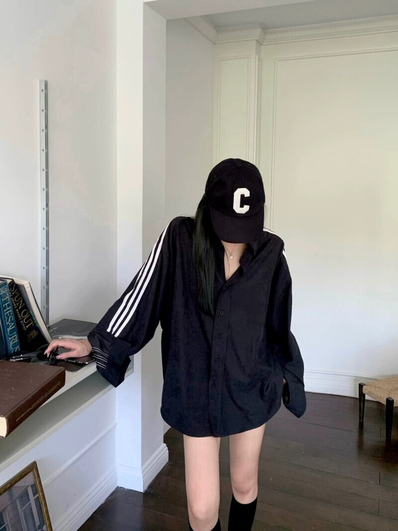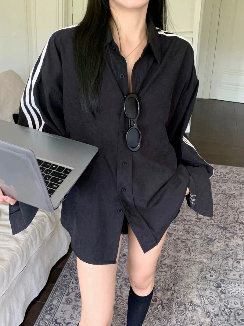 黒のシャツジャケットの女性の 2023 初秋の新しい長袖トップ 3 ストライプ緩い怠惰なスタイルカジュアルシャツ ロング ブラック オータム 秋物 8571662102089153