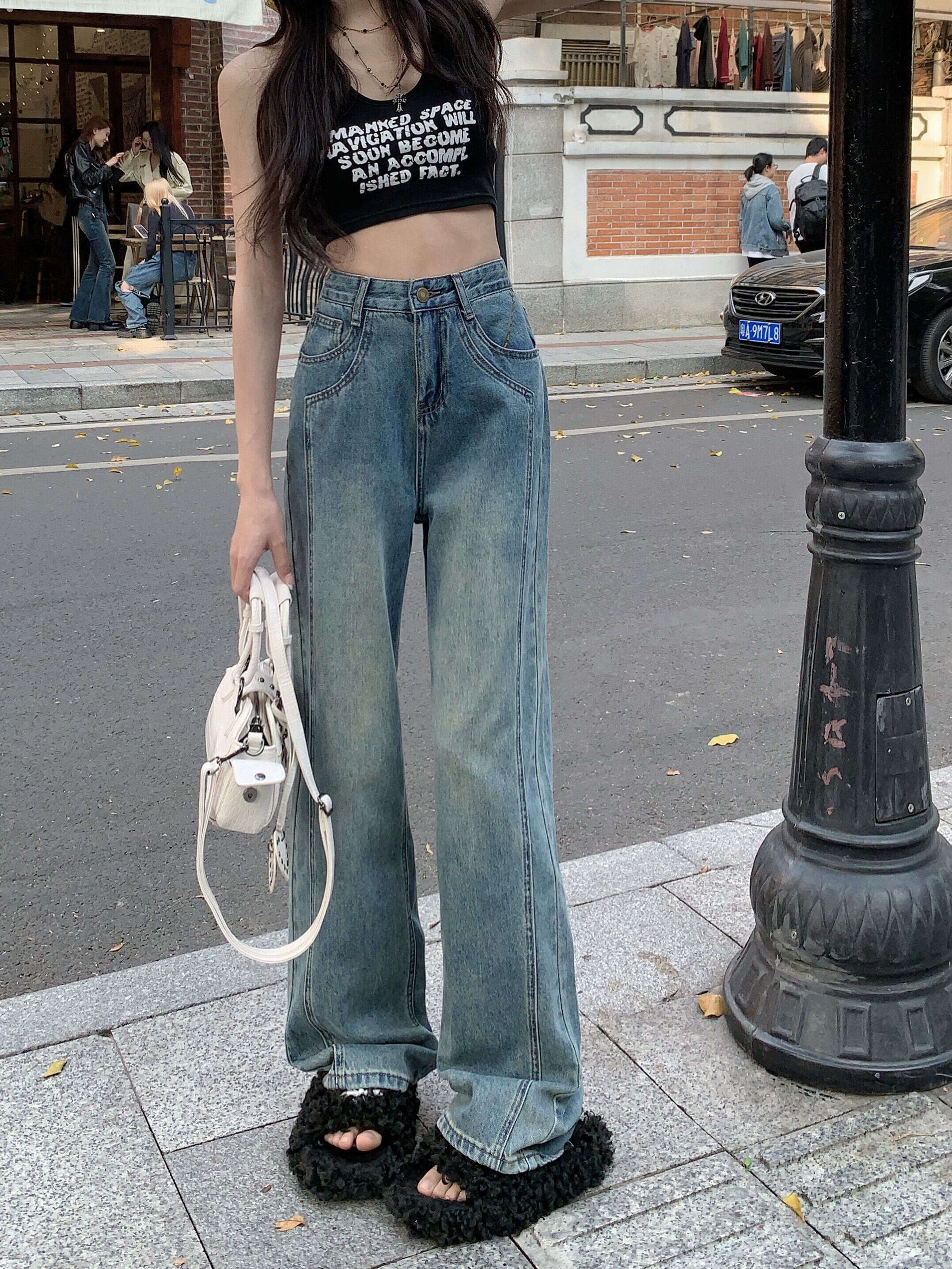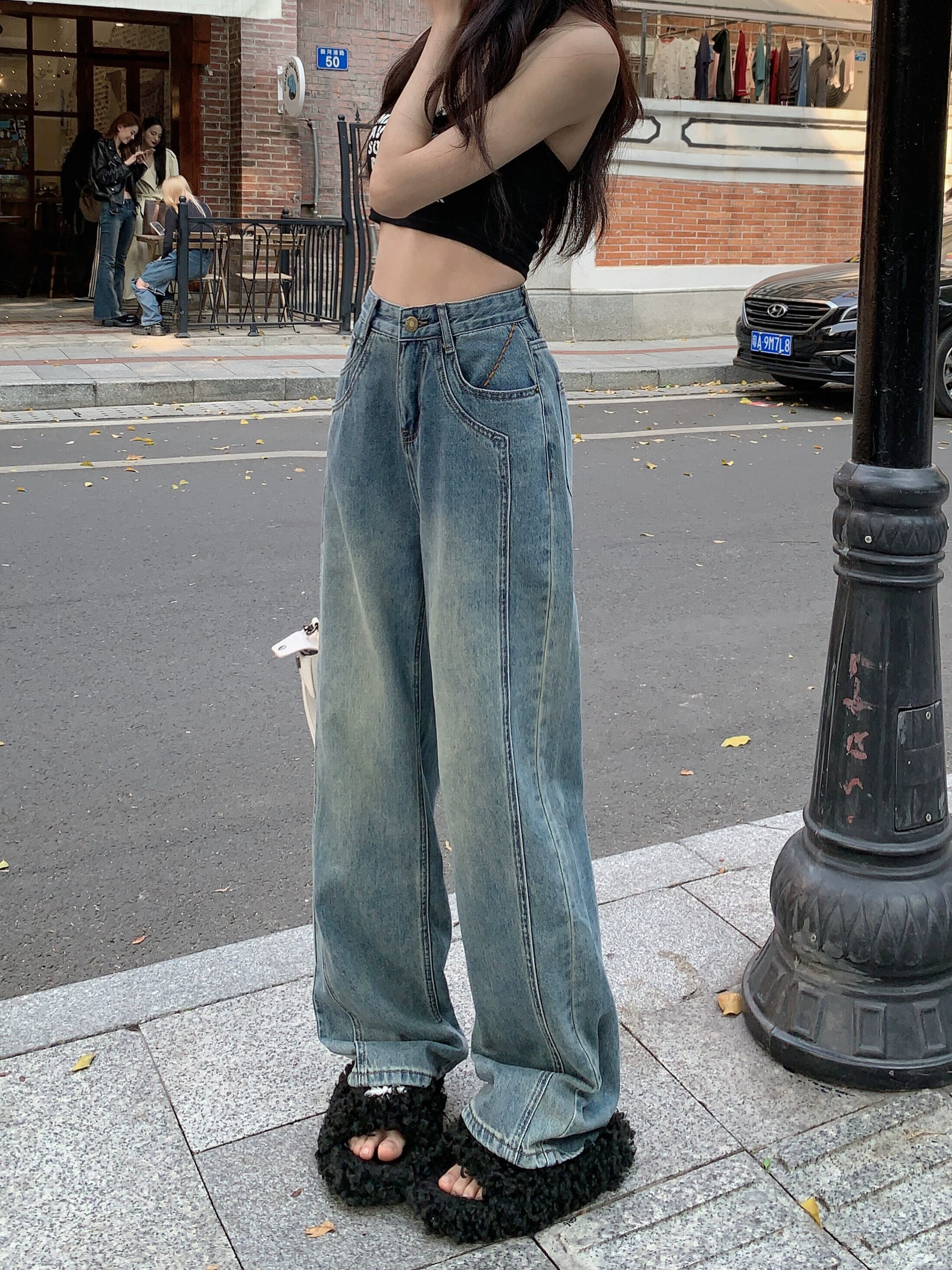 レトロジーンズレディース、ゆったりストレートレッグフロアレングスパンツ、人気の秋デザイン、ニッチハイウエストナローワイドレッグパンツ オータム 秋物 8571615003661404