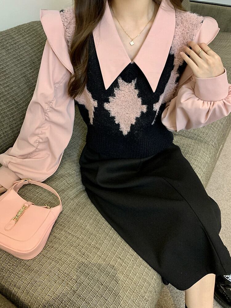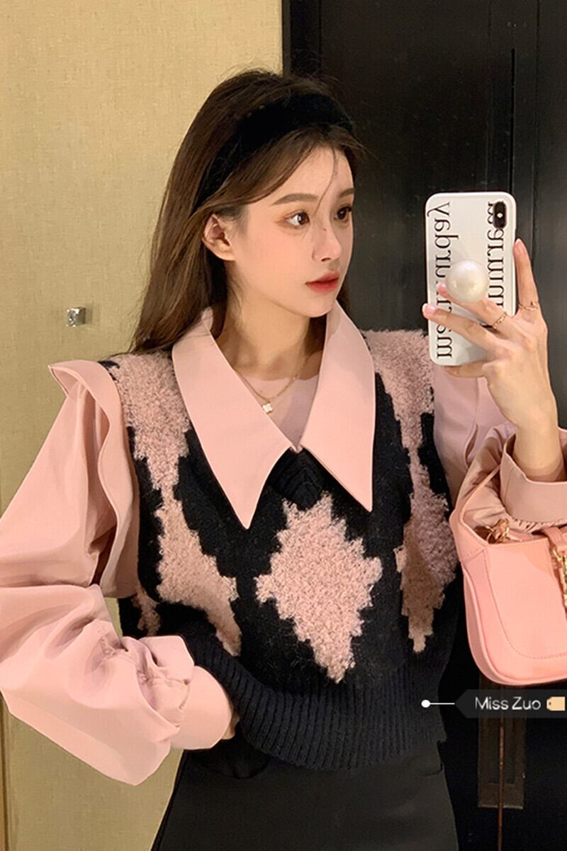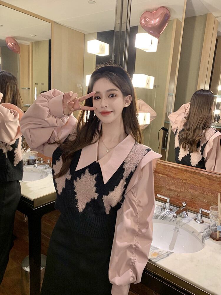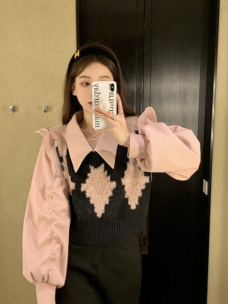 フェイクツーピースショートトップレディースデザインニッチ2023秋新作スイートシック長袖シャツ ロング 大人ガーリー スウィート キュート カジュアル オータム 秋物 8571666276893940