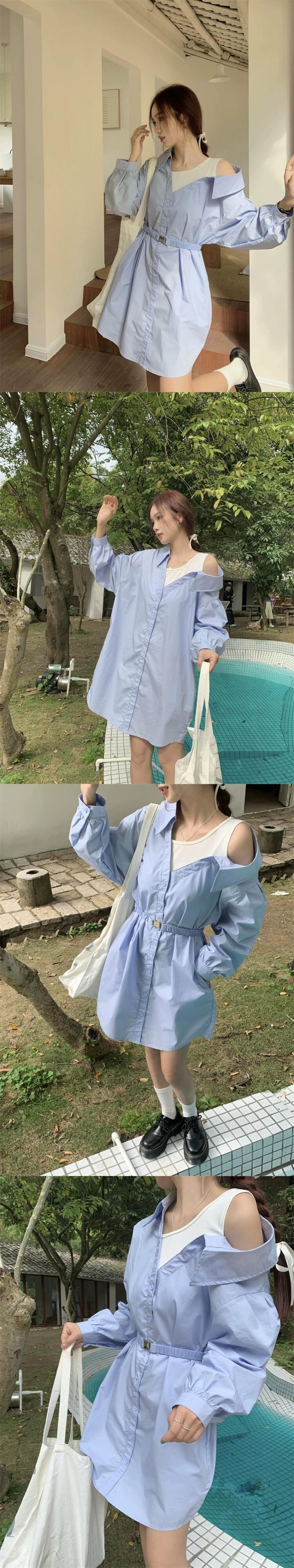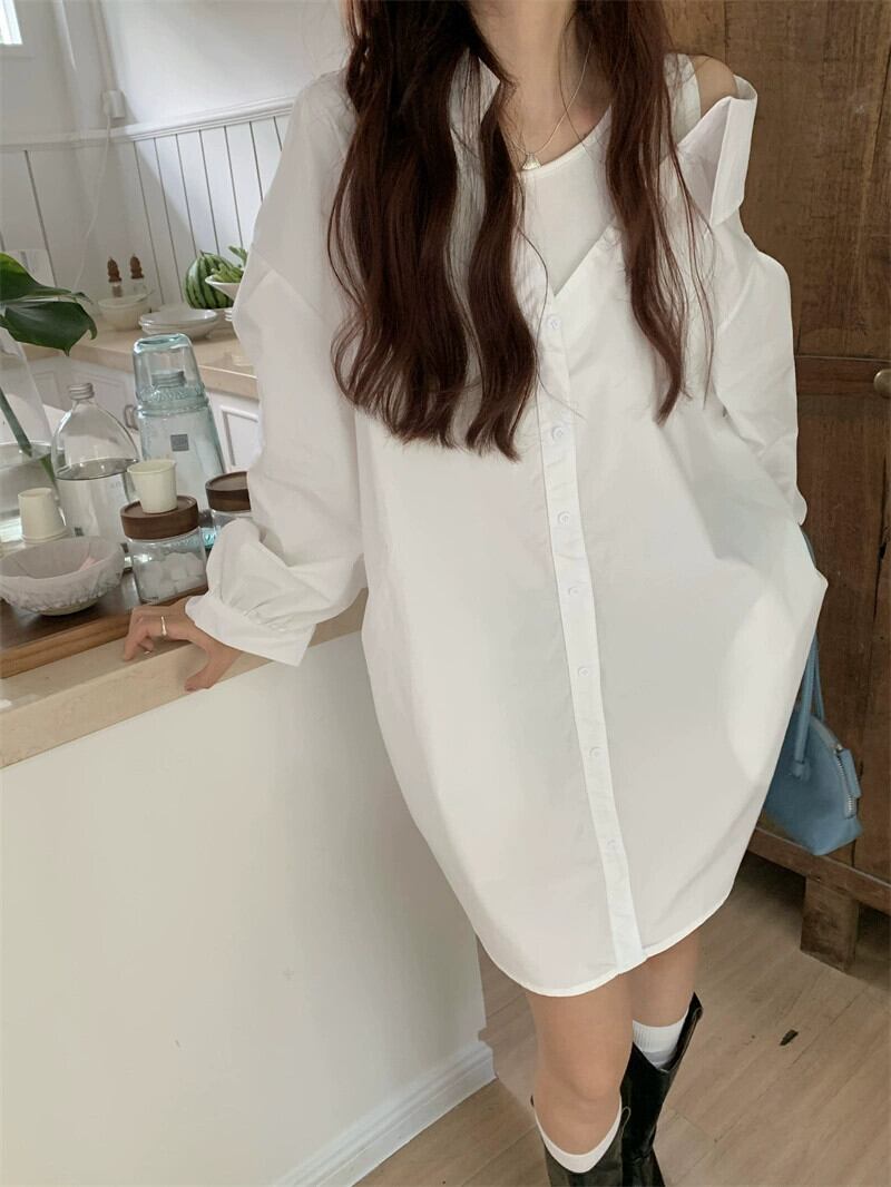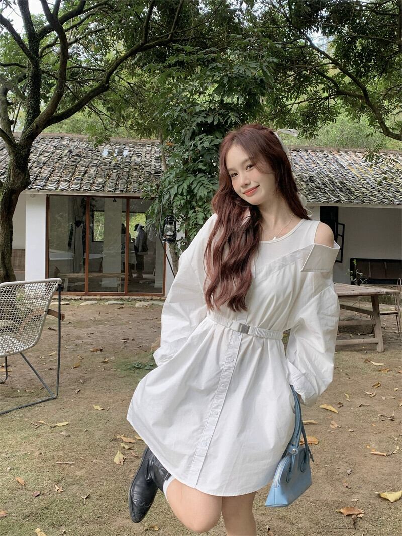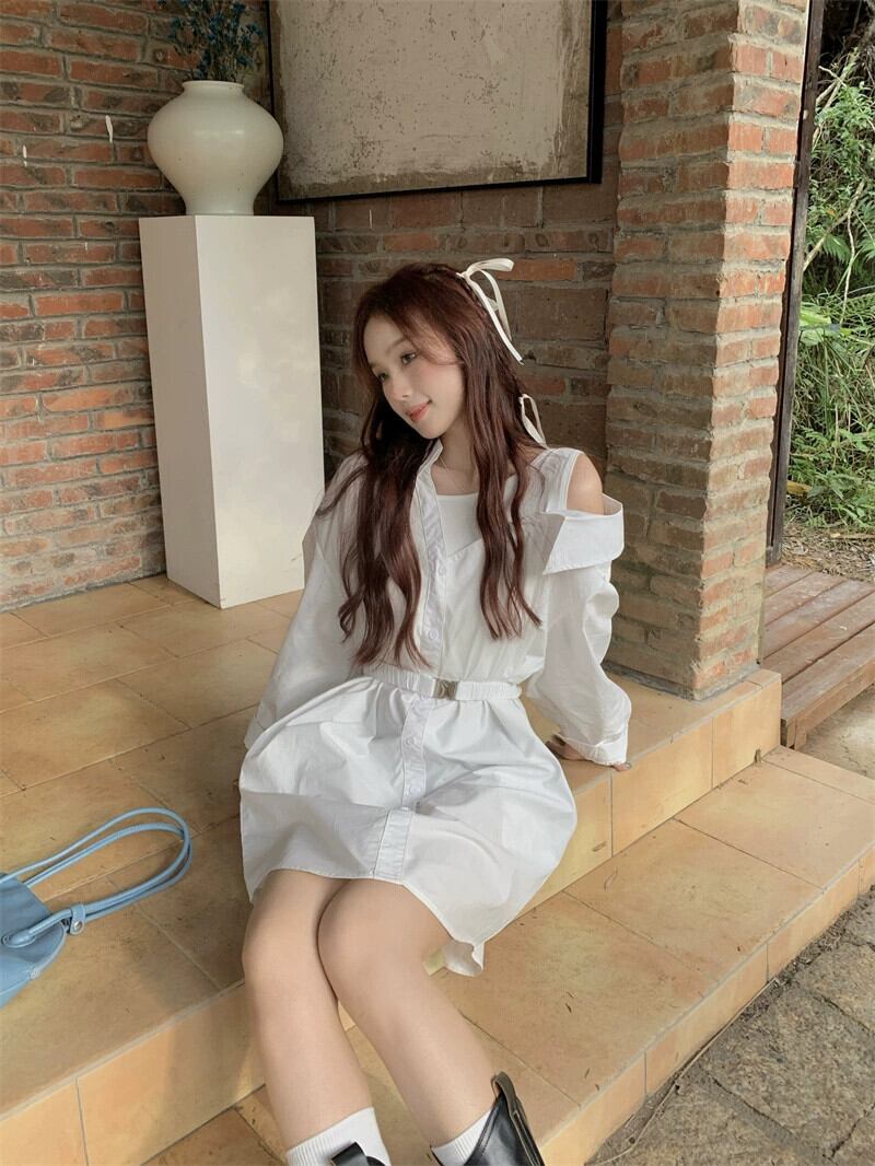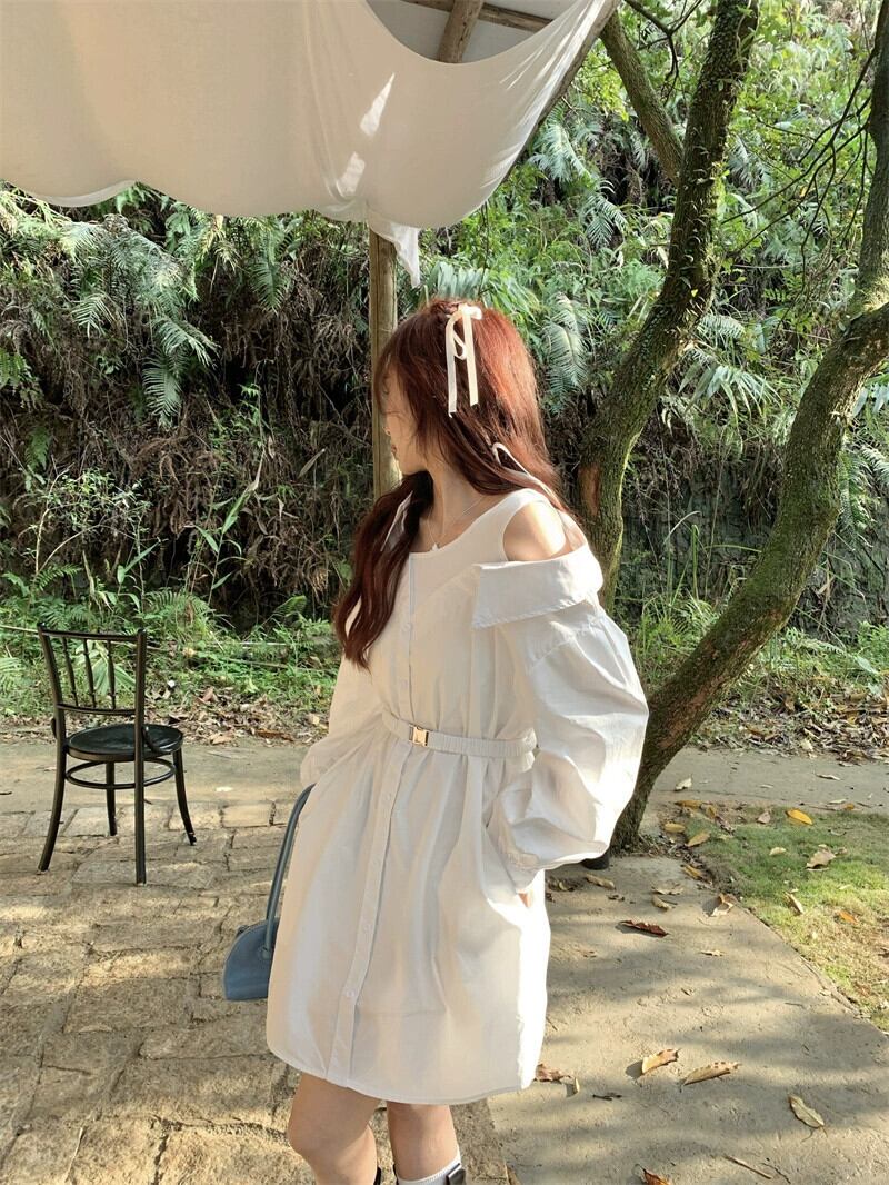 白いオフショルダーシャツドレスの女性の2023年秋の新しいニッチデザイン気質のユニークなユニークなスカート ホワイト オータム 秋物 857167368282499