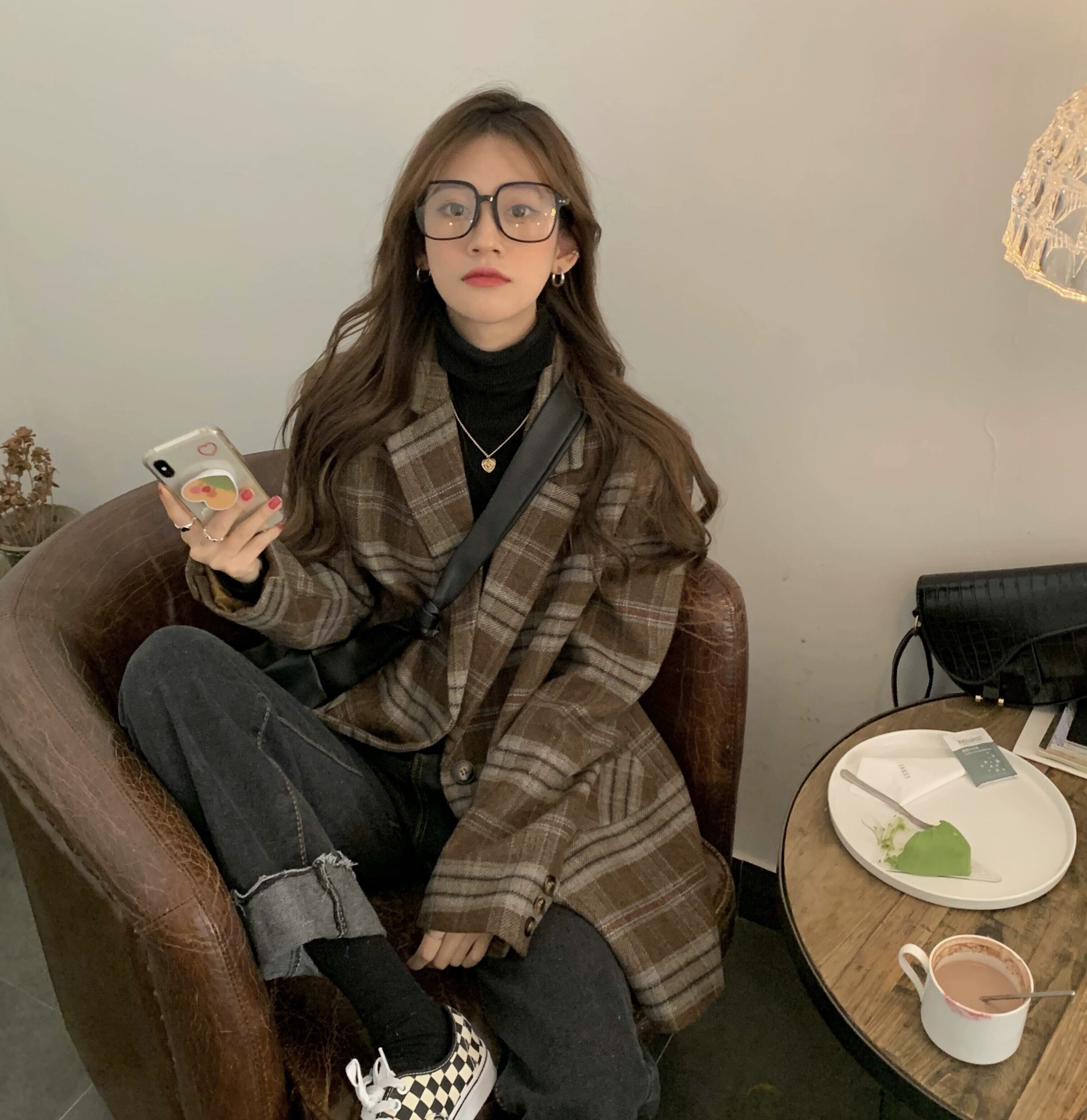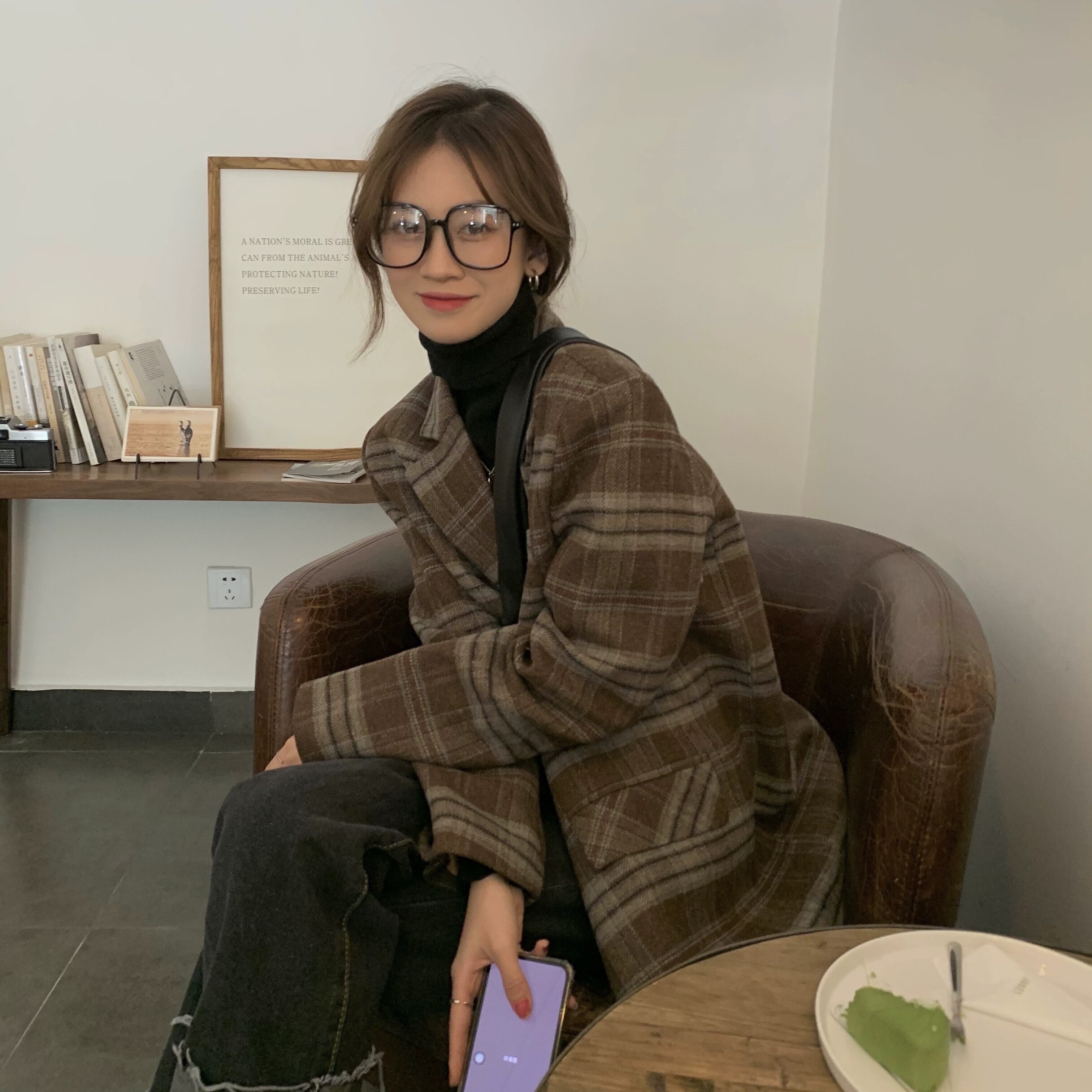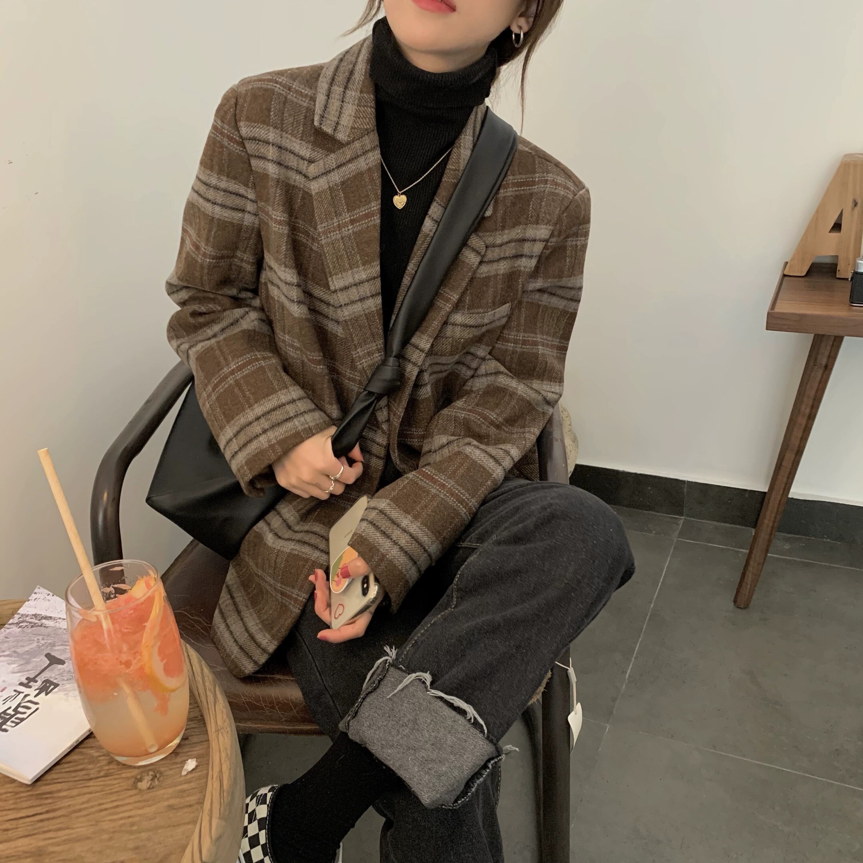 チェック柄ミドル丈ウールジャケットレディース2023年初秋新作高級ウールトップス小柄な人向け オータム 秋物 8571617373285417