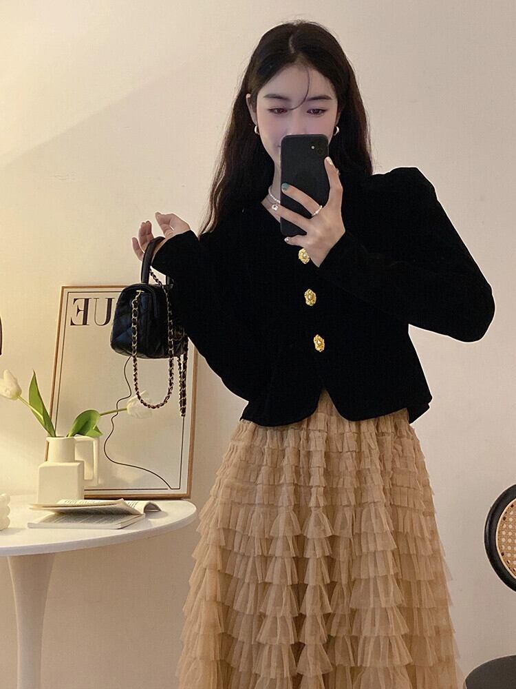 フレンチシックなショートトップ女性のデザインニッチ2023初秋の新しい黒のVネックベルベット長袖シャツ ロング ブラック オータム 秋物 8571631368329396