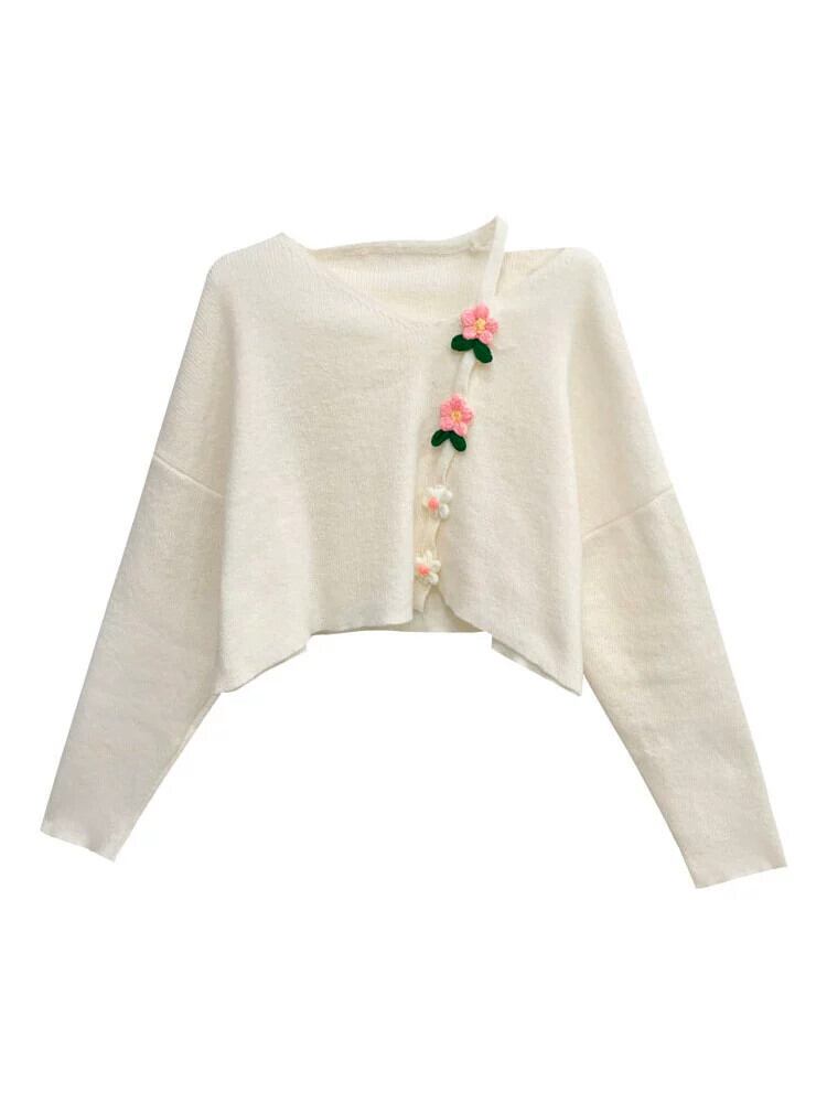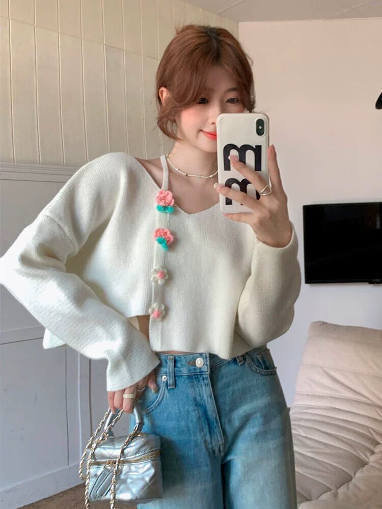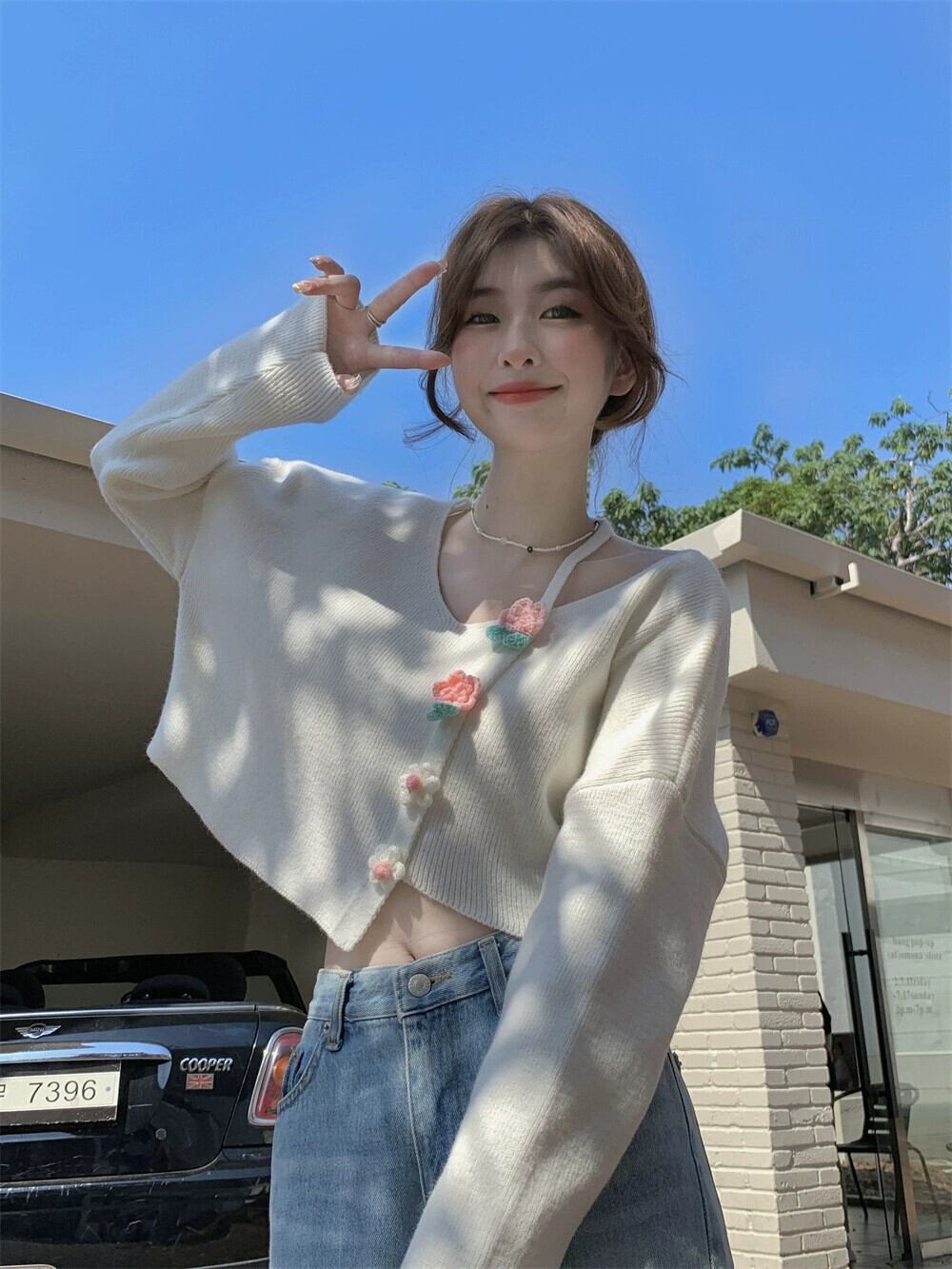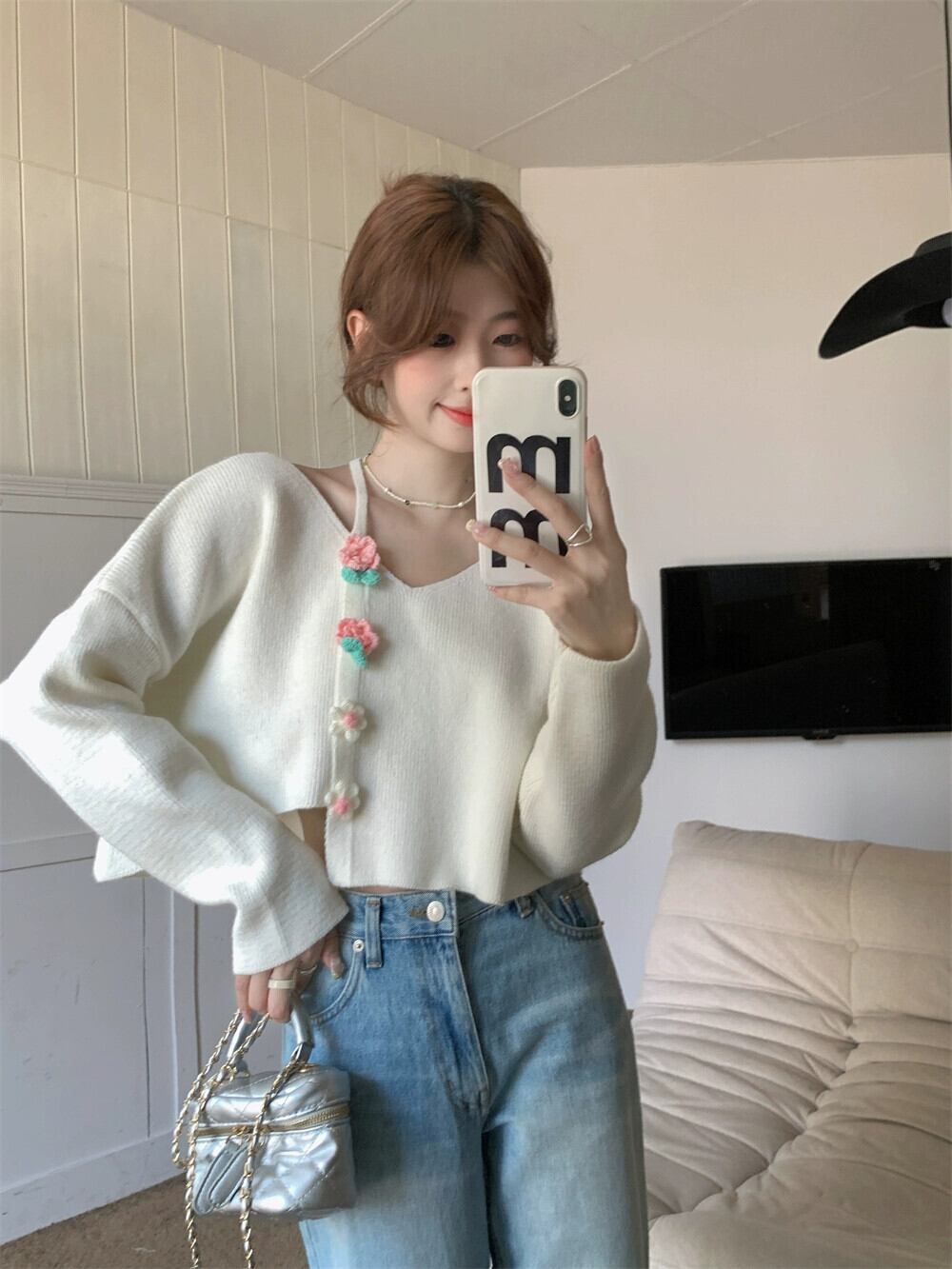 クリーム色の白いショートトップの女性の春先の新しいセーター、ハイエンド、超素敵、優しいスタイル、Vネック長袖セーター ロング ホワイト スプリング 春物 8571697591320438