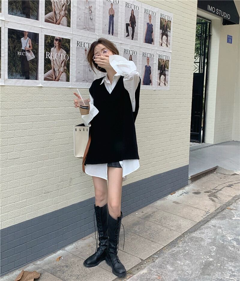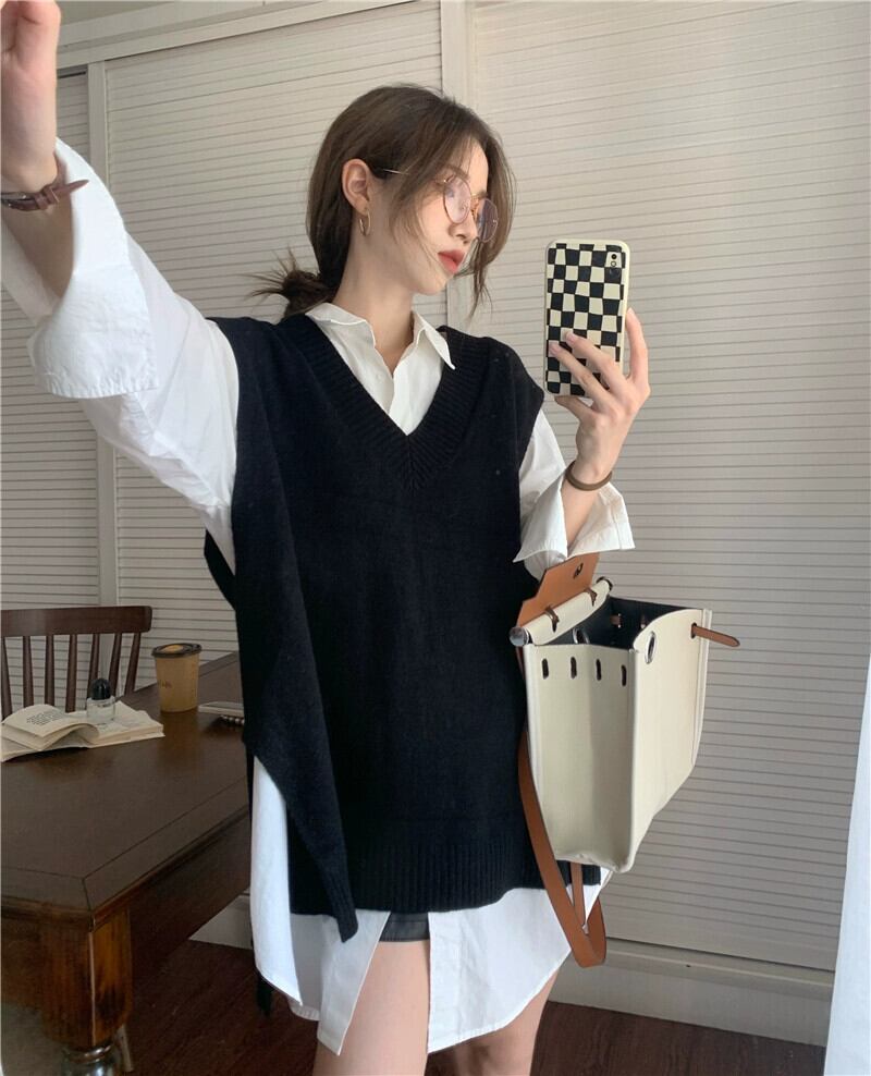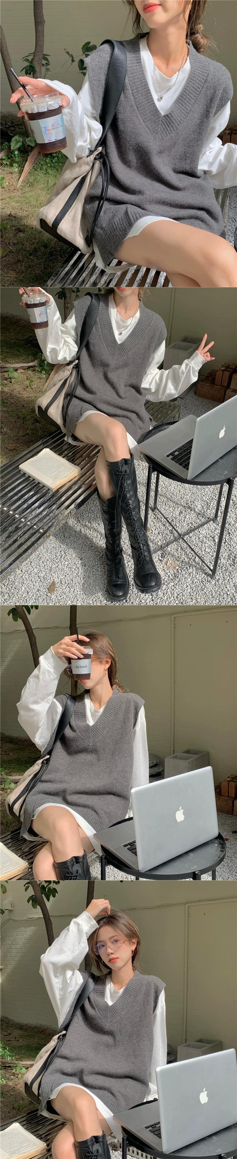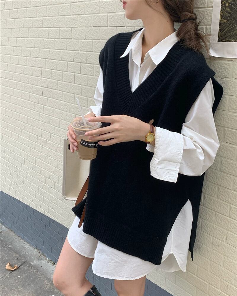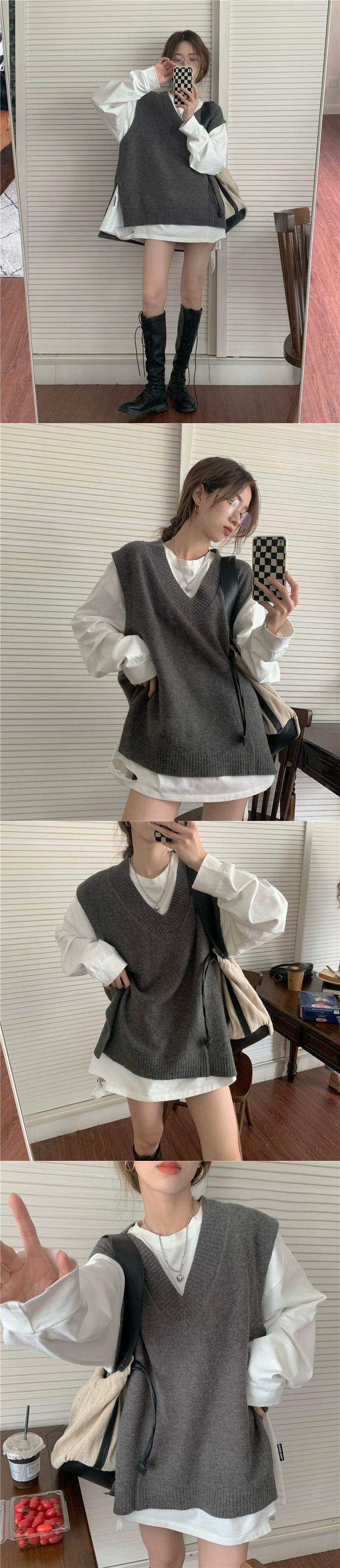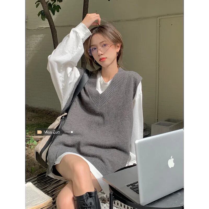 グレー V ネックニットベスト女性の 2023 秋の新作シャツレイヤードベストネットレッドセーターベスト オータム 秋物 Vネック 8571643711825357