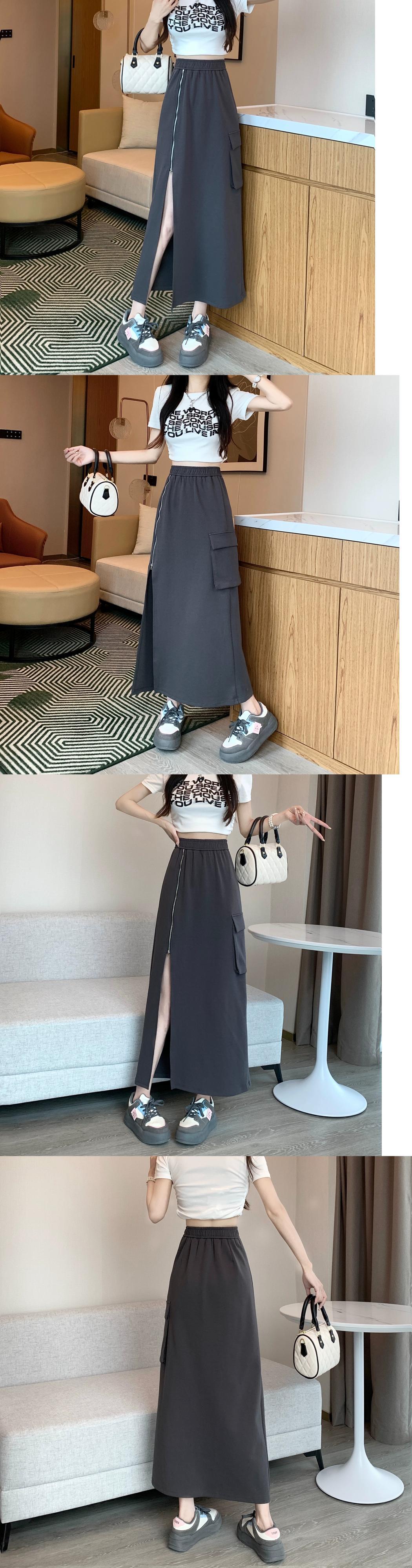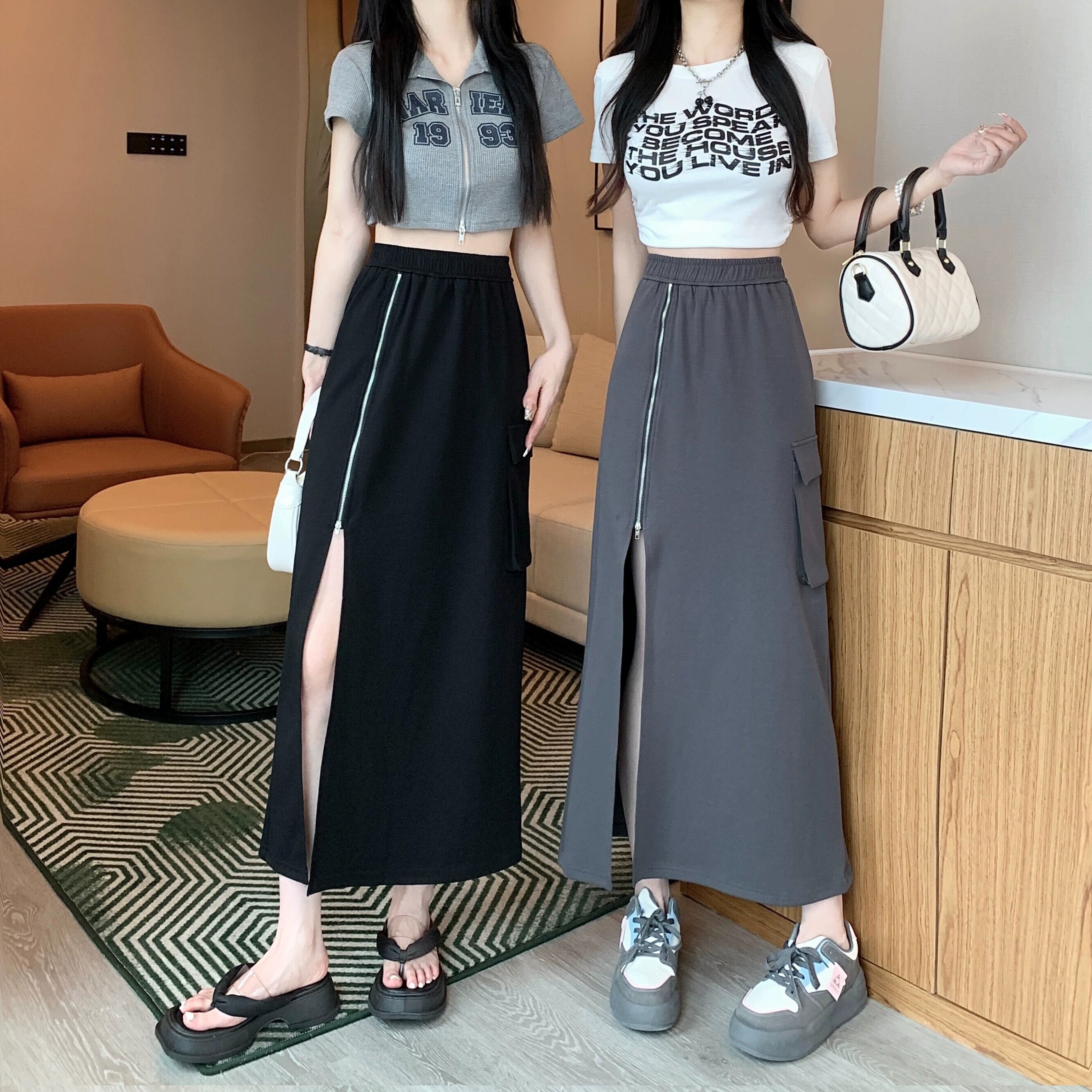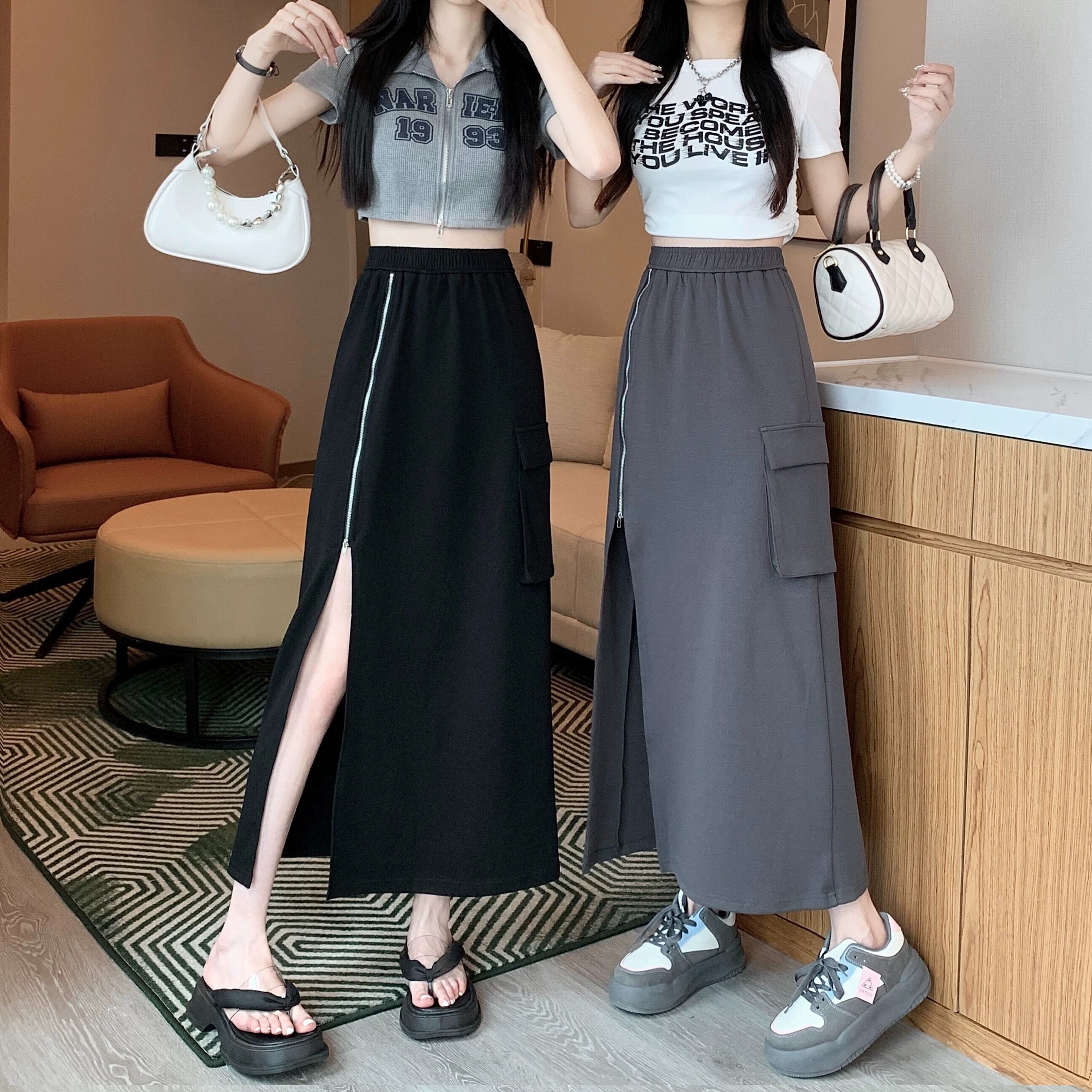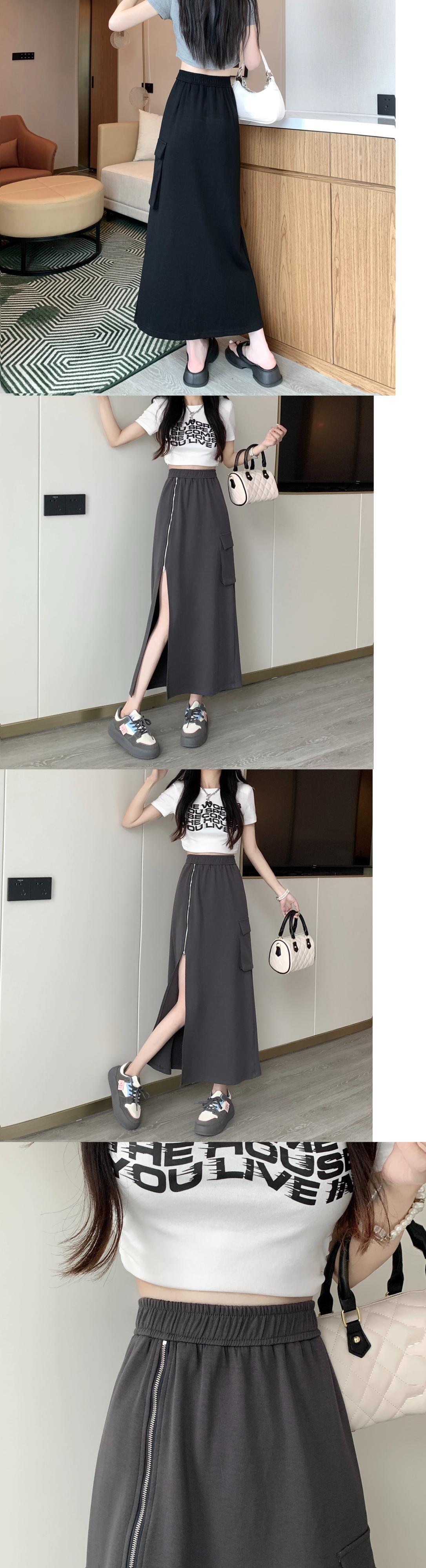 黒のジッパー スリット スカート レディース、夏デザイン、ニッチ ハイウエスト A ライン スカート、ミッドレングスヒップハグ ロング スカート ブラック サマー 夏物 Aライン 8571615214100919