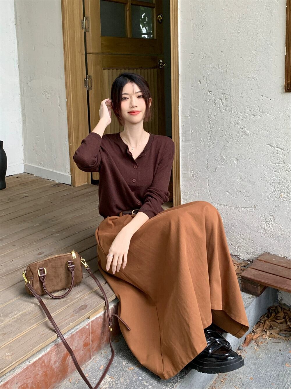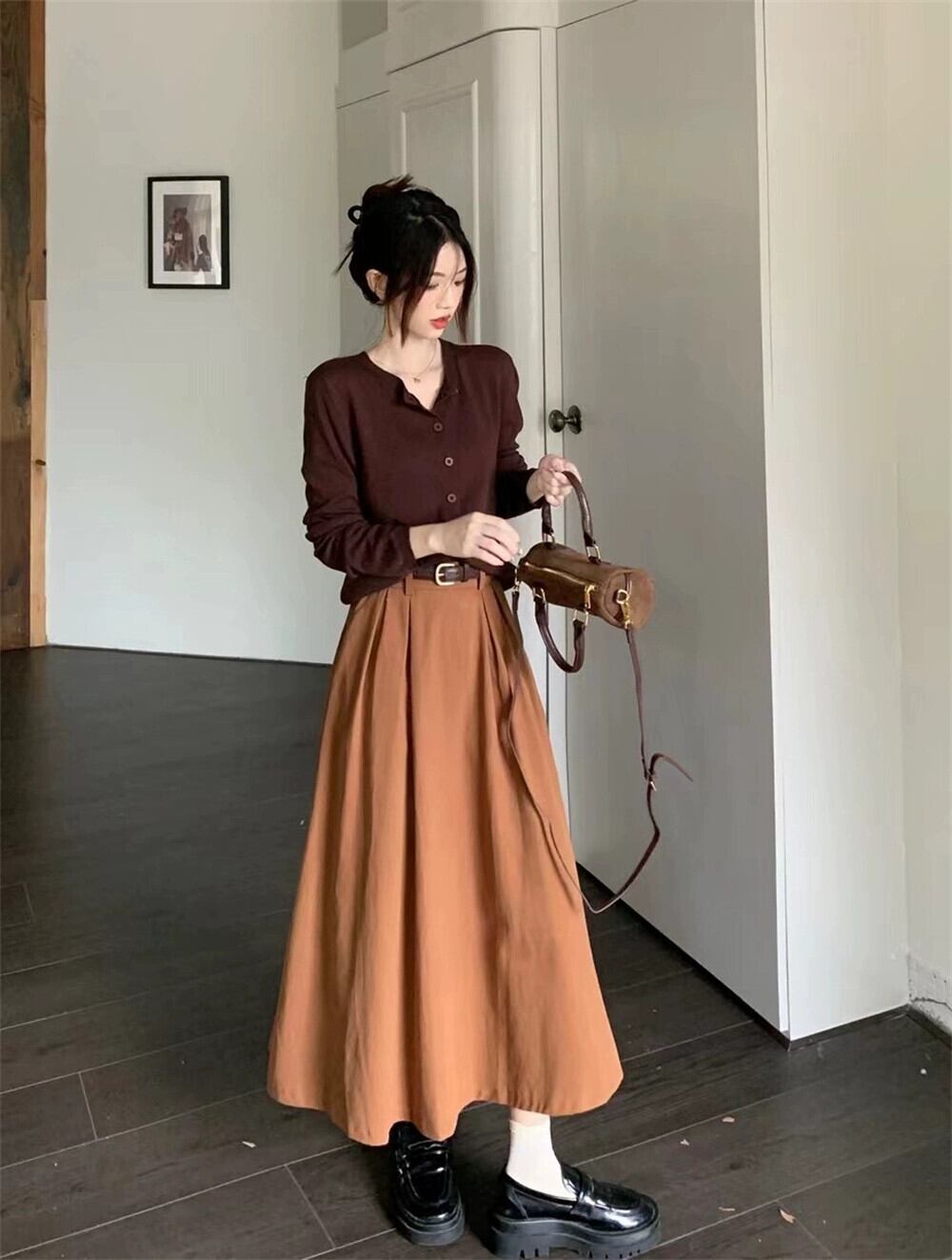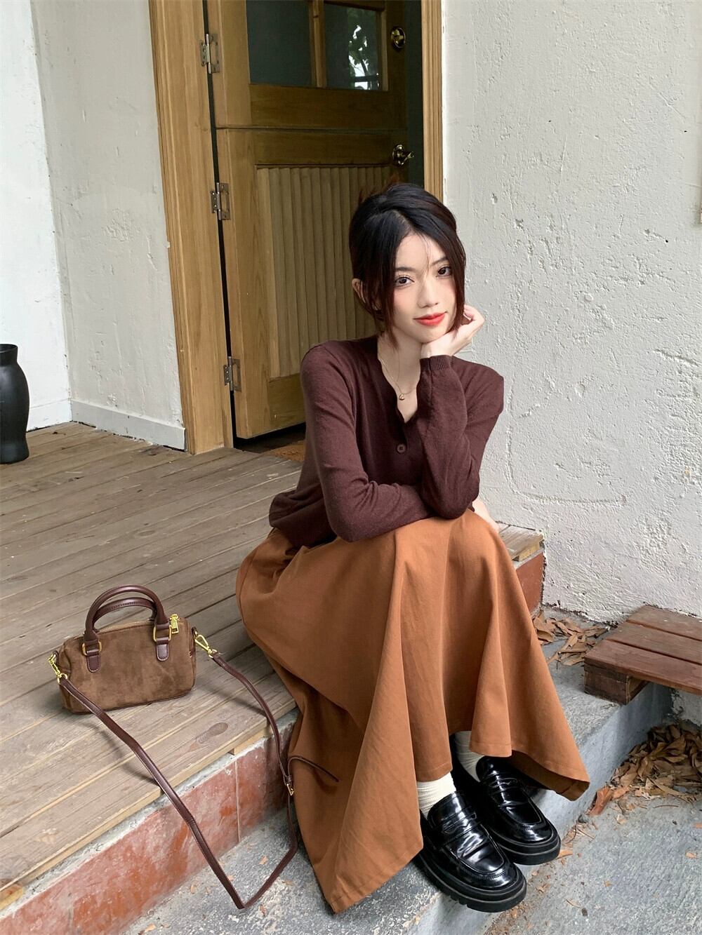 色:モカブラウンのカーディガン,キャラメルスカート(ベルトは付属しません),ブロガー募集オーダー
