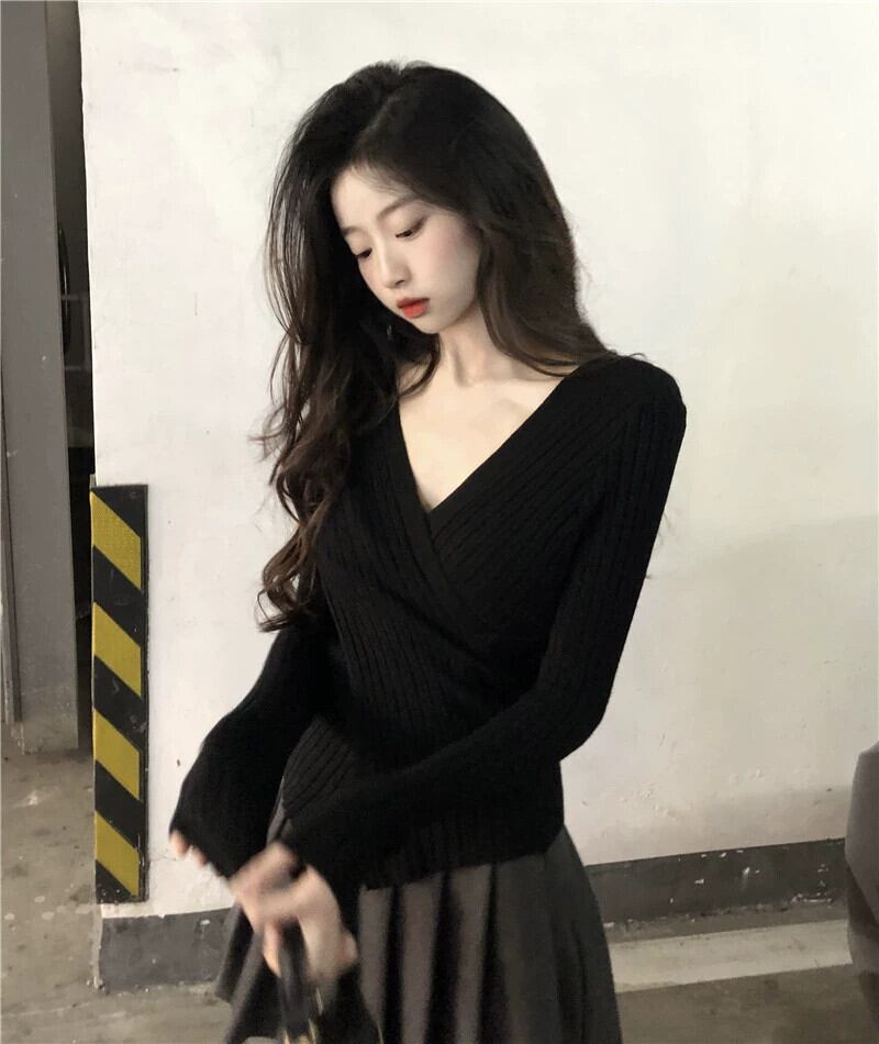 ボトリングシャツ女性 2023 春の新デザインスリム V ネックセーター不規則なクロスニットトップ スプリング 春物 Vネック 8571662831841432