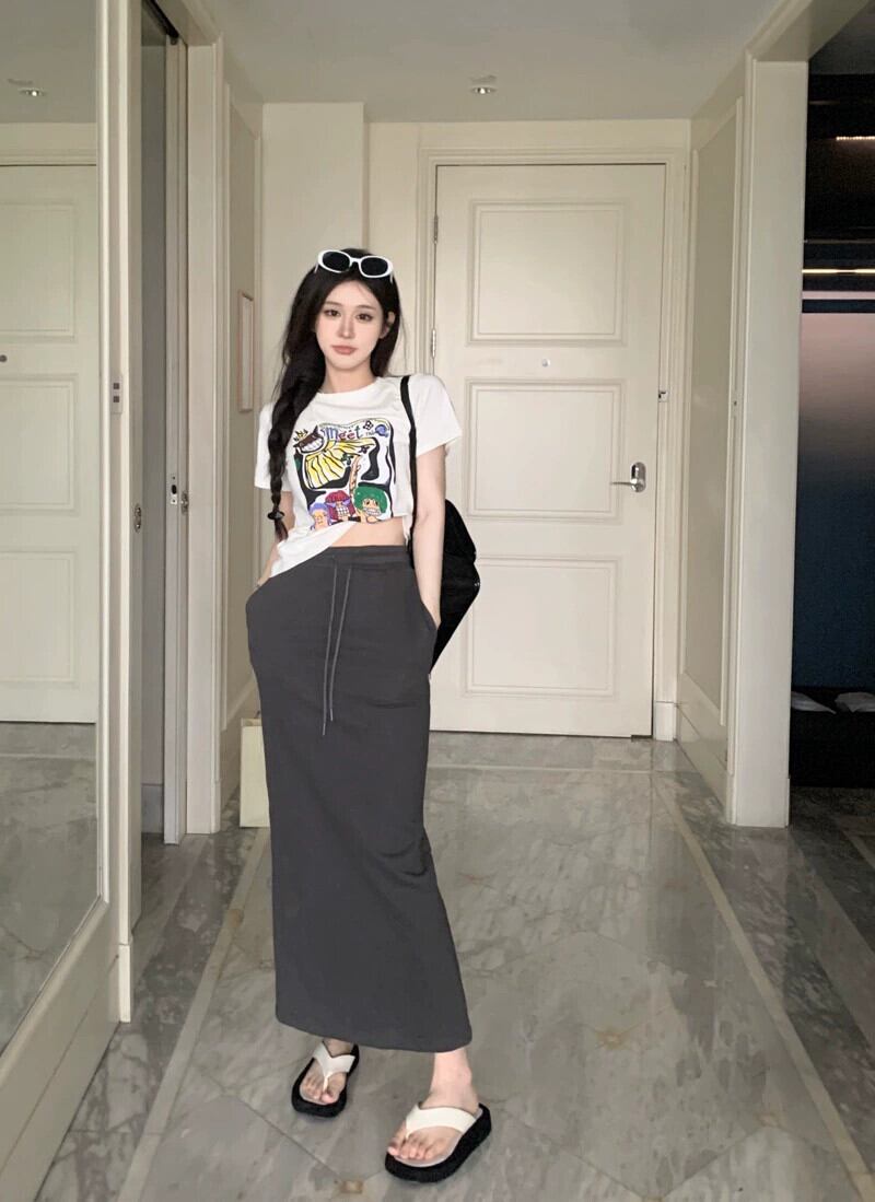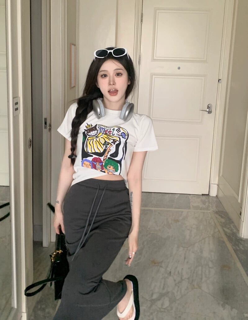 漫画の落書きプリント半袖 T シャツ女性夏のデザイン、ニッチなファッションと西洋スタイルの白い右肩ショート トップ ホワイト サマー 夏物 Tシャツ 8571645579900211