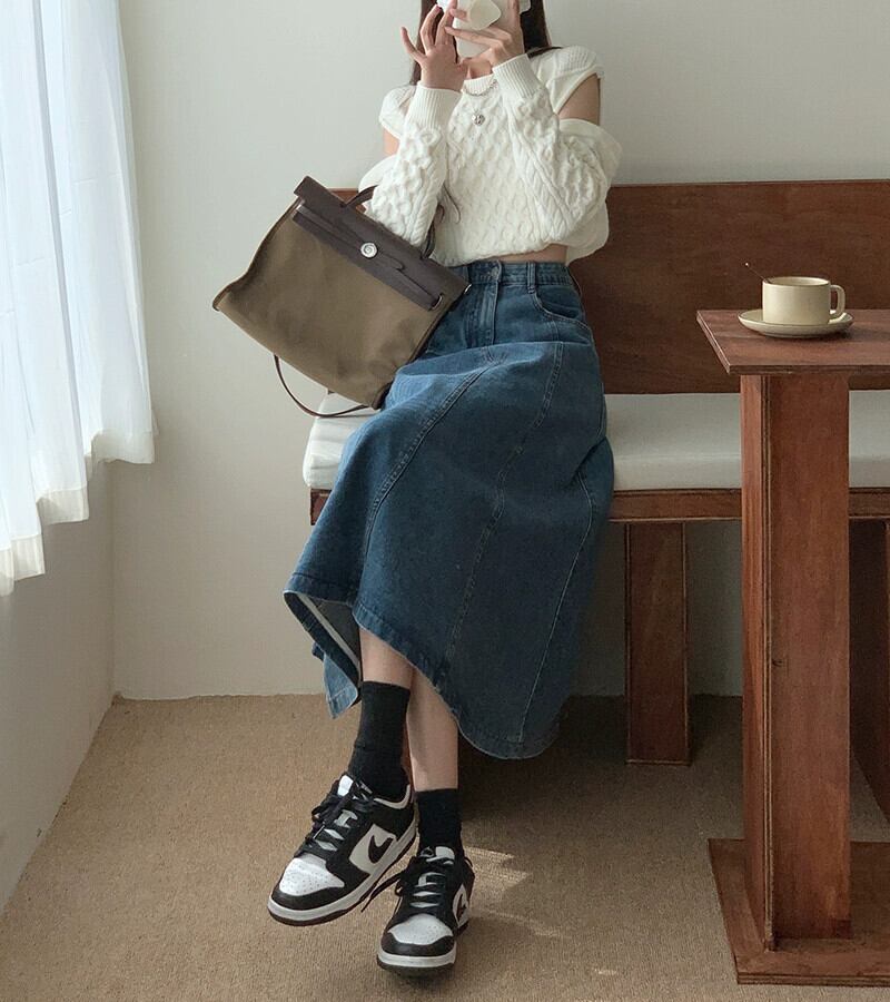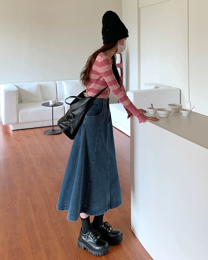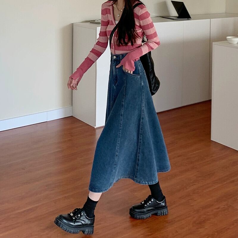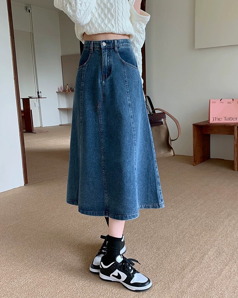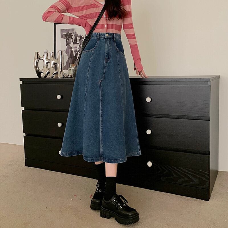 ブルーデニムスカートの女性の小柄な春 2023 新しいミッドレングスハイウエスト A ラインスカートレトロロングスカート スプリング 春物 Aライン 857166154653065