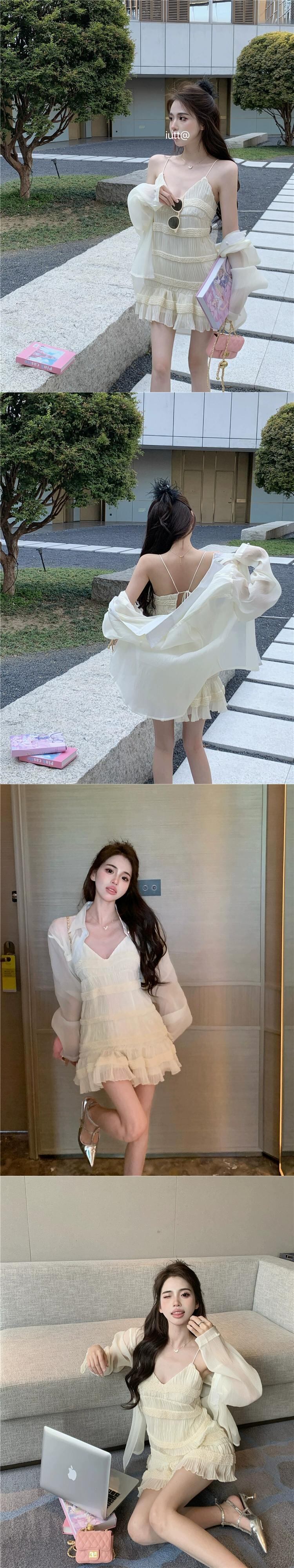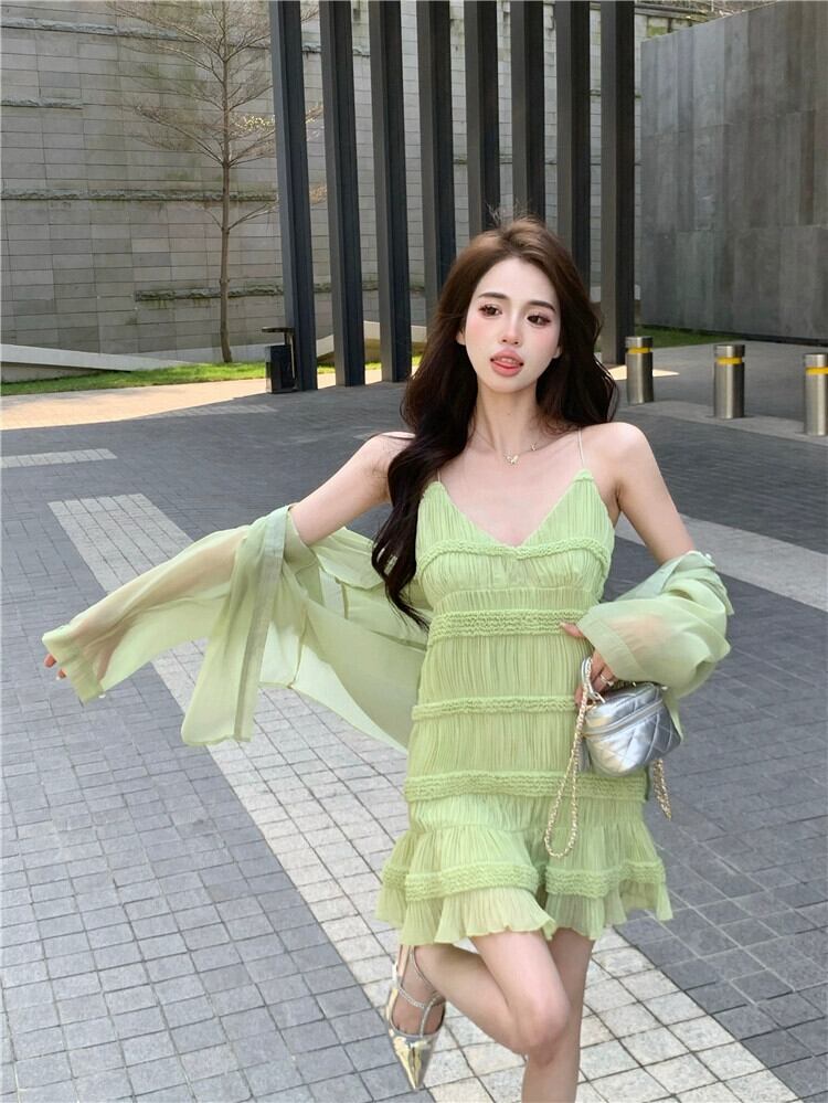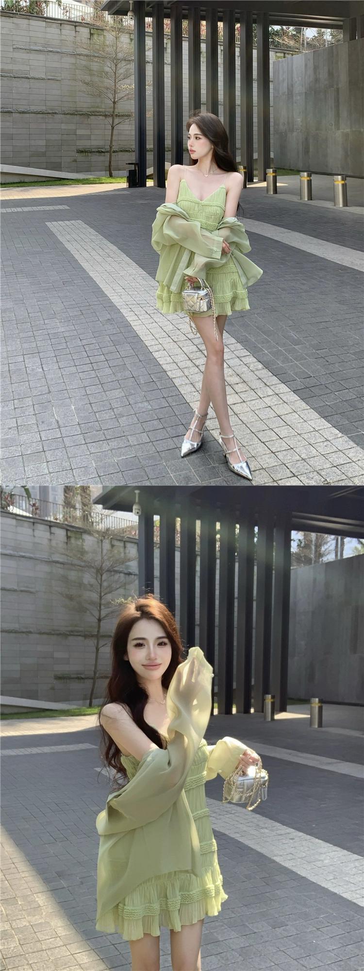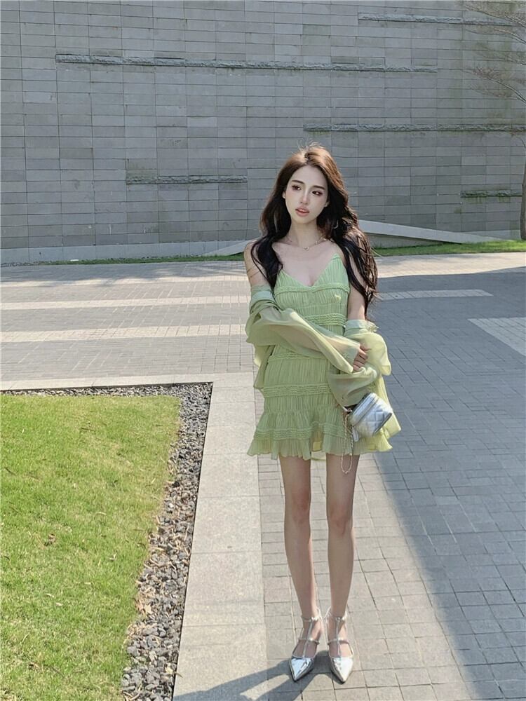 グリーンサスペンダードレスの女性の夏2023新しいニッチデザインセクシーで美しいバックレスショートスカート サマー 夏物 8571662251780379