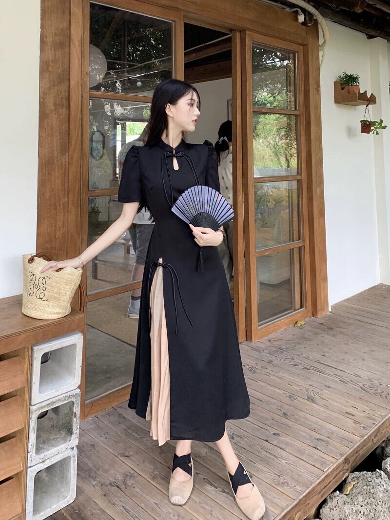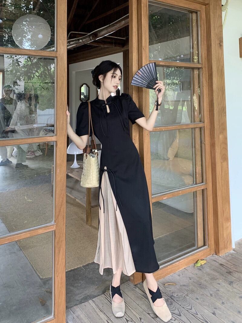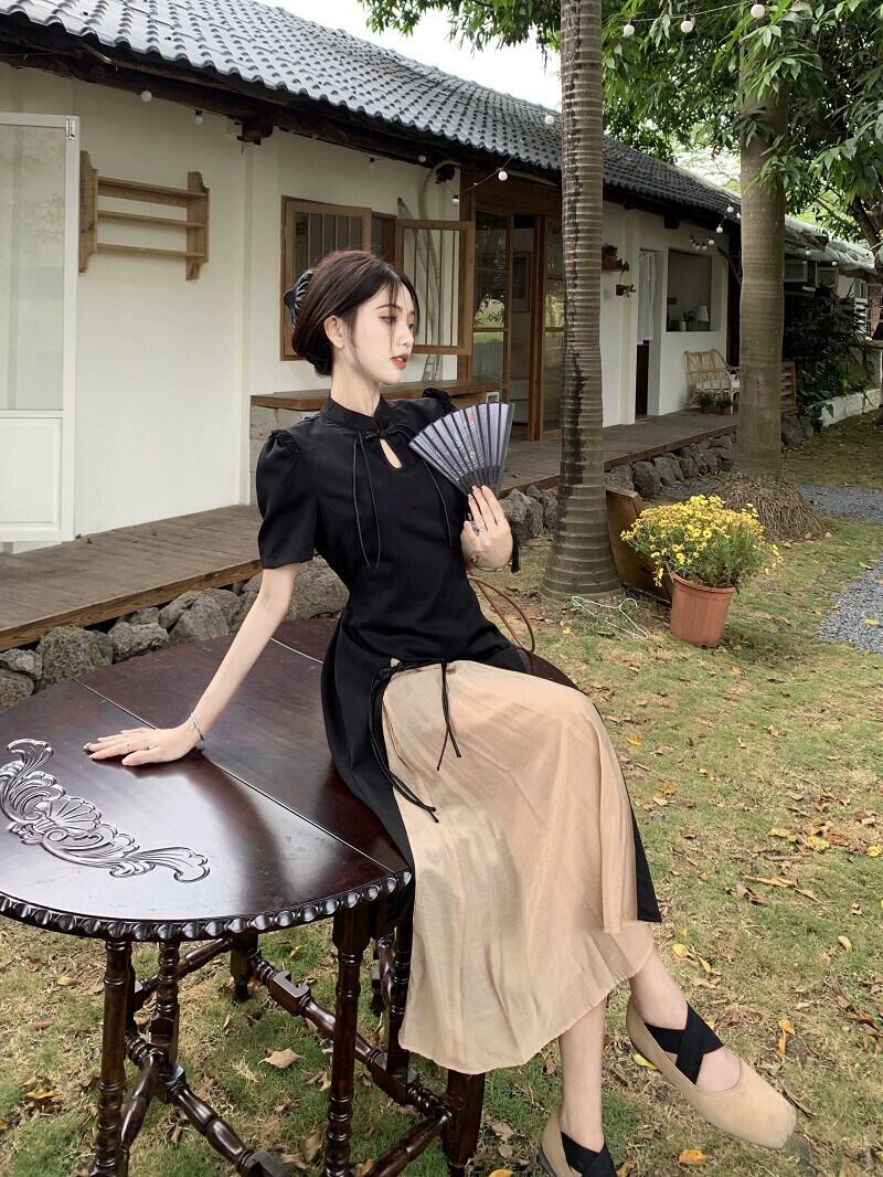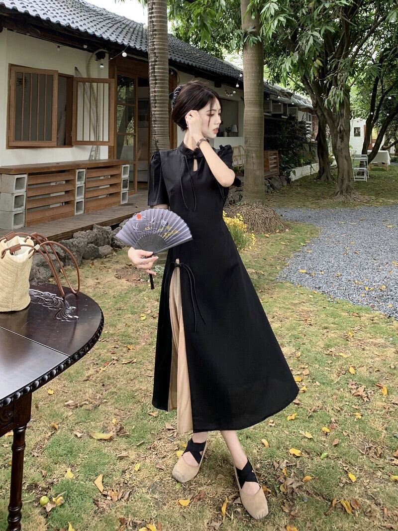 改良されたチャイナドレス黒のドレスの女性の夏の新しい中国風の優しい気質のハイエンドのスリットロングスカート ブラック サマー 夏物 8571665360166695