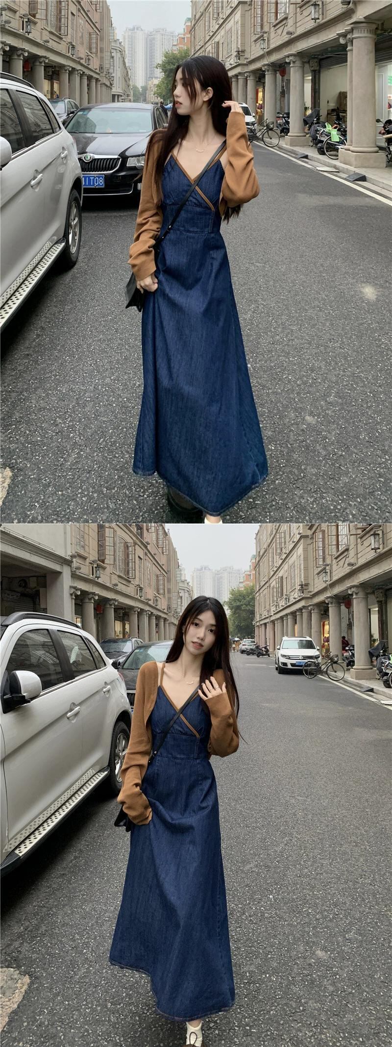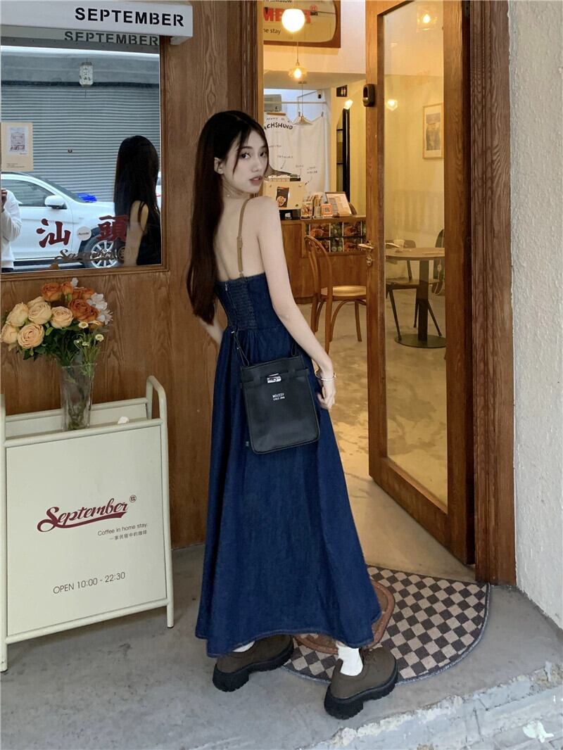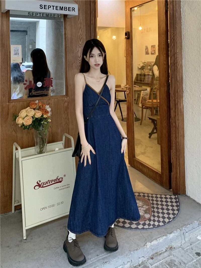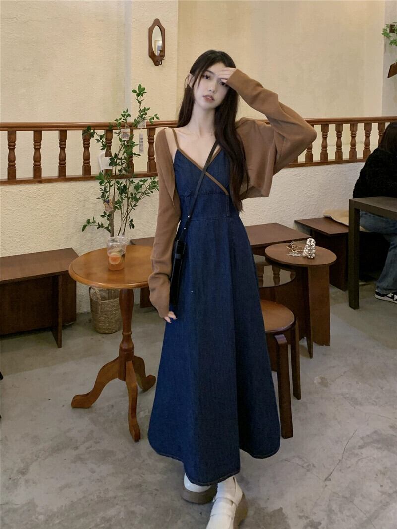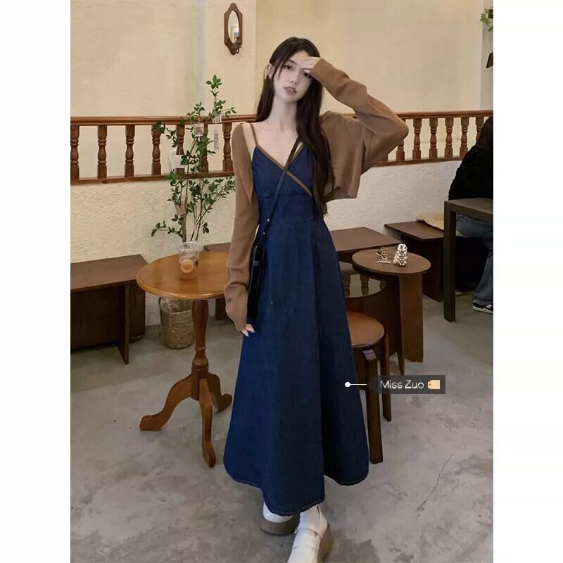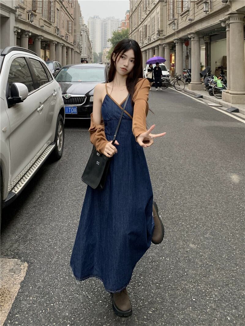 デニムサスペンダードレス女性秋 2023 新しい香港スタイルのレトロシックな優しいスタイルニッチウエストロングスカート オータム 秋物 8571658272478534