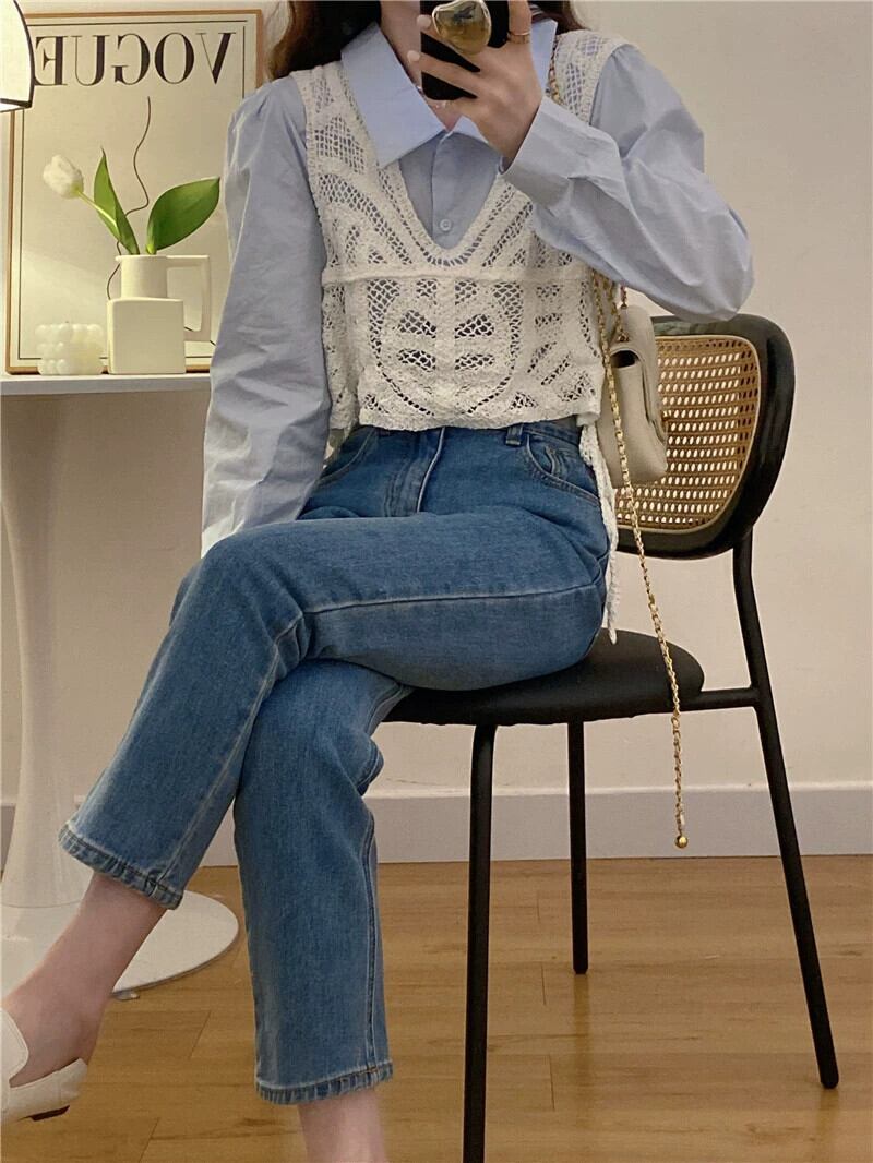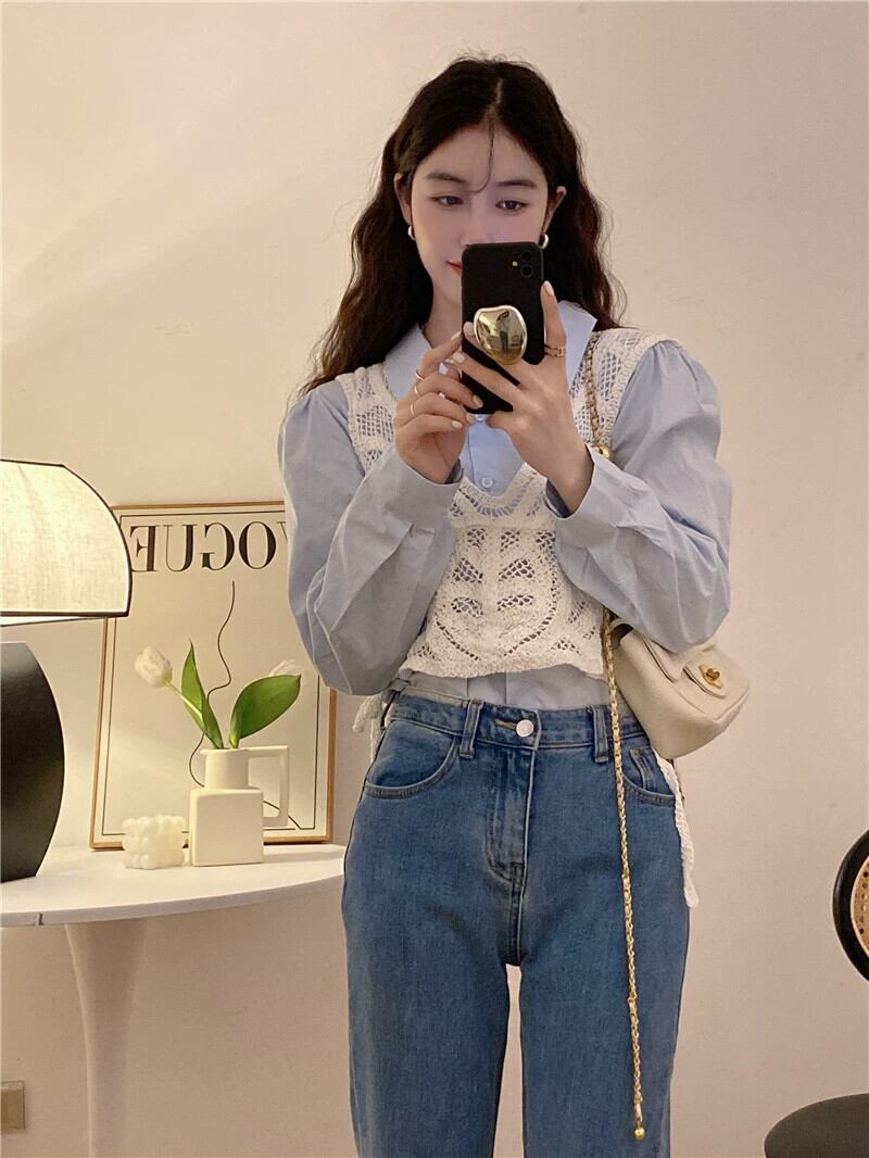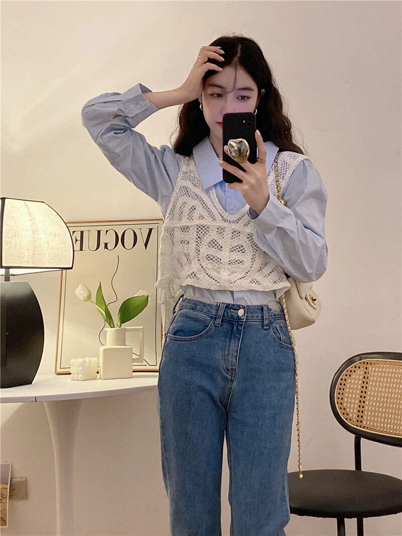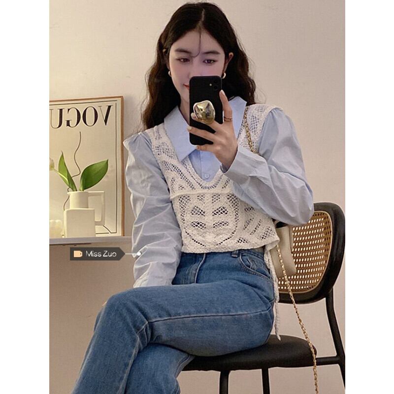 初秋の青い長袖シャツの女性、ニッチなデザインのレイヤードシャツ、ユニークでユニークなスタイルのショートトップ ロング レッド ブルー オータム 秋物 8571693144260453