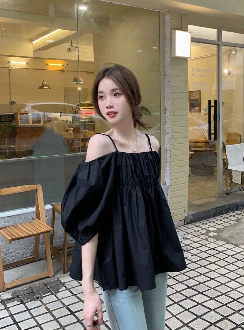 ワンショルダー ホルター トップ レディース 2023 夏の新しいスタイルのフレンチ シックな見事なプリーツ ブラック パフ スリーブ シャツ サマー 夏物 8571639342082840