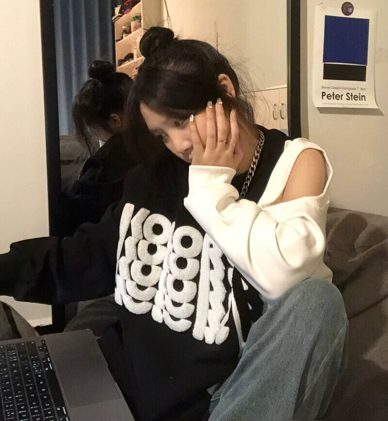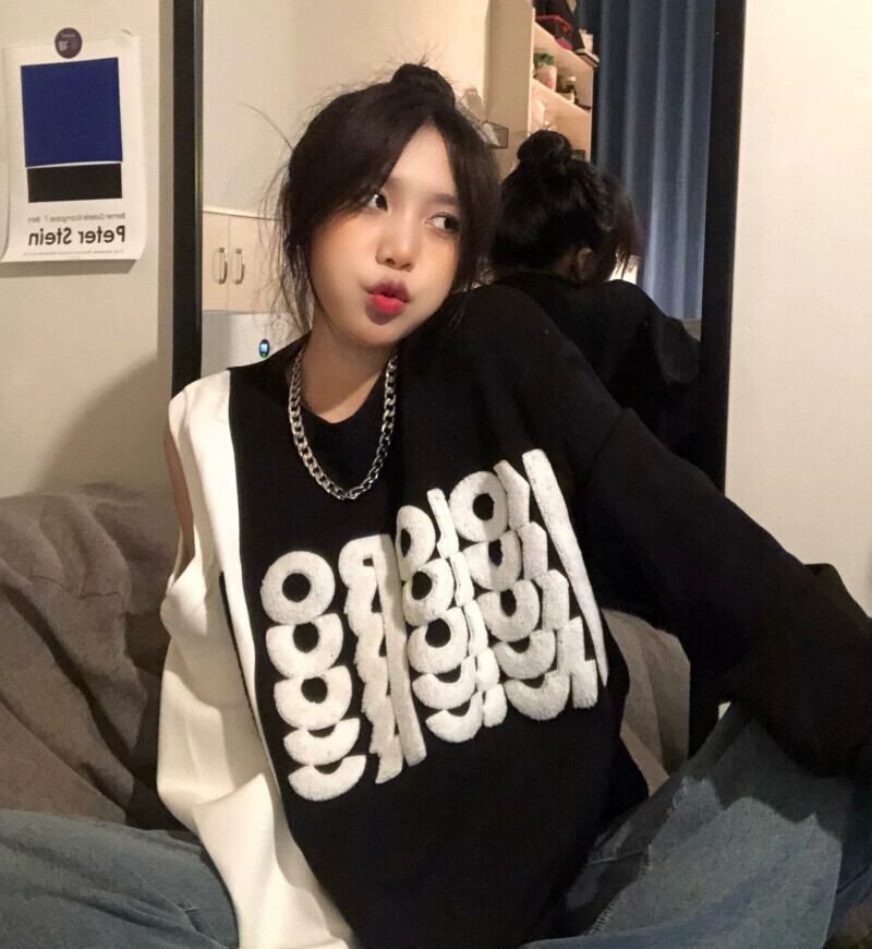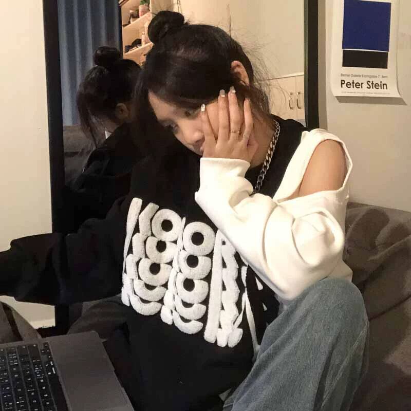 ミッドレングスオフショルダースウェットシャツレディース2023春秋の新デザインニッチアメリカンレトロラウンドネックトップ スプリング 春物 オータム 秋物 Oネック 8571645558934081