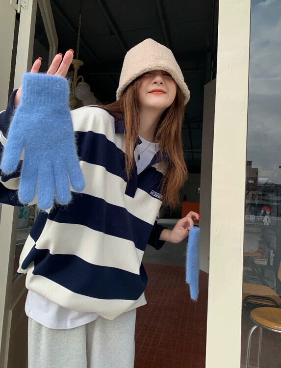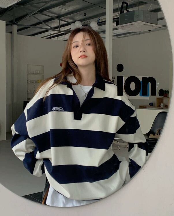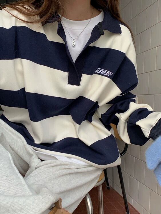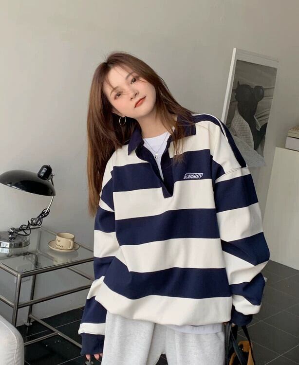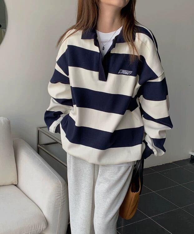 ポロ襟ストライプスウェットシャツ女性春ベルベット 2023 新デザインニッチルーズ怠惰なスタイル長袖トップ ロング スプリング 春物 8571686843821345