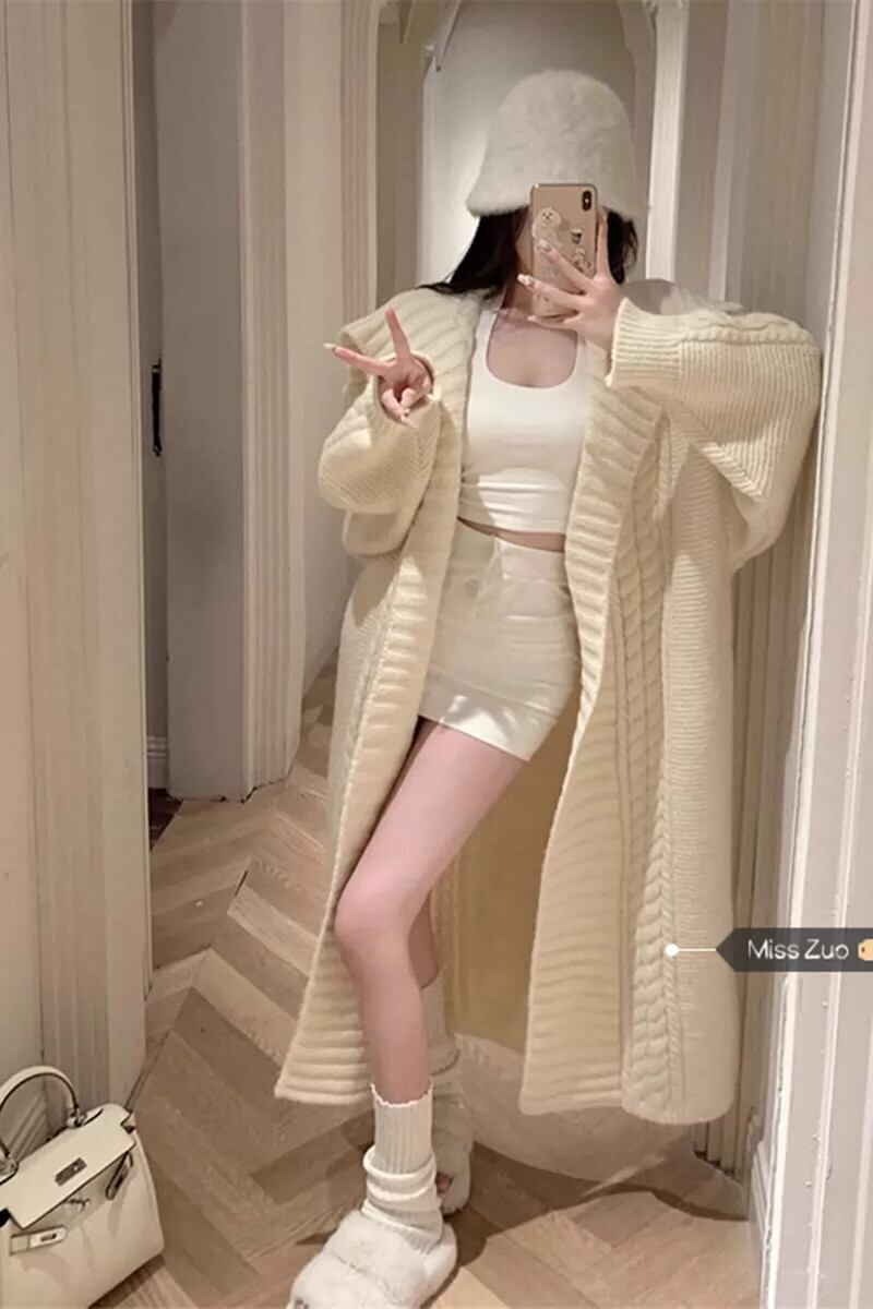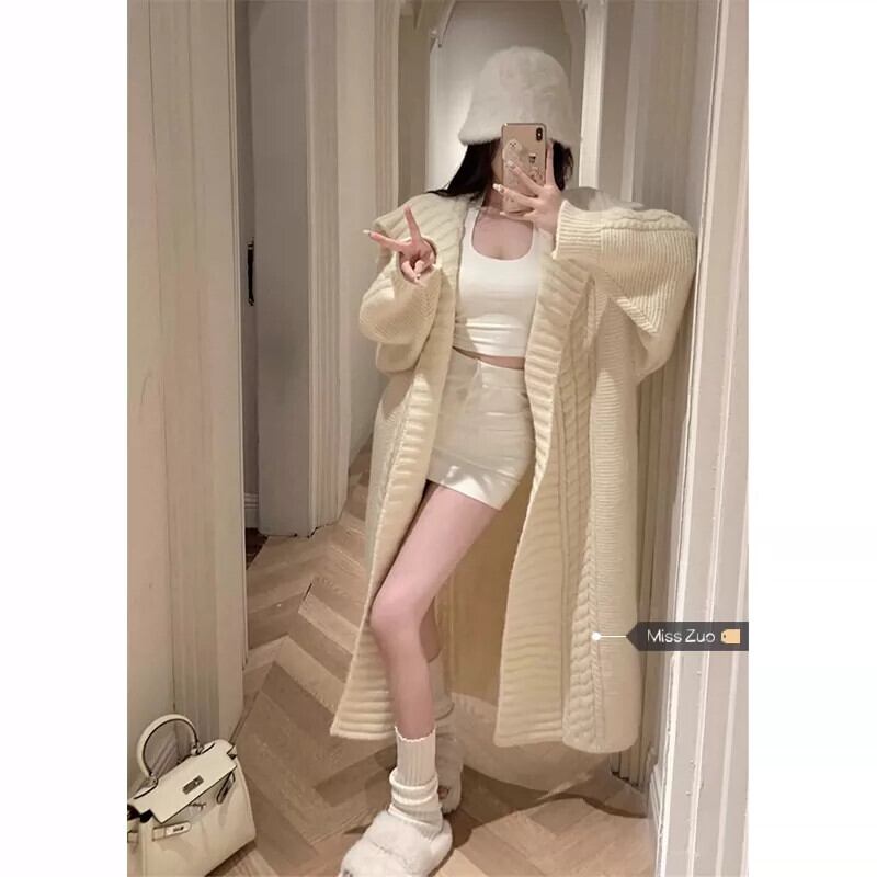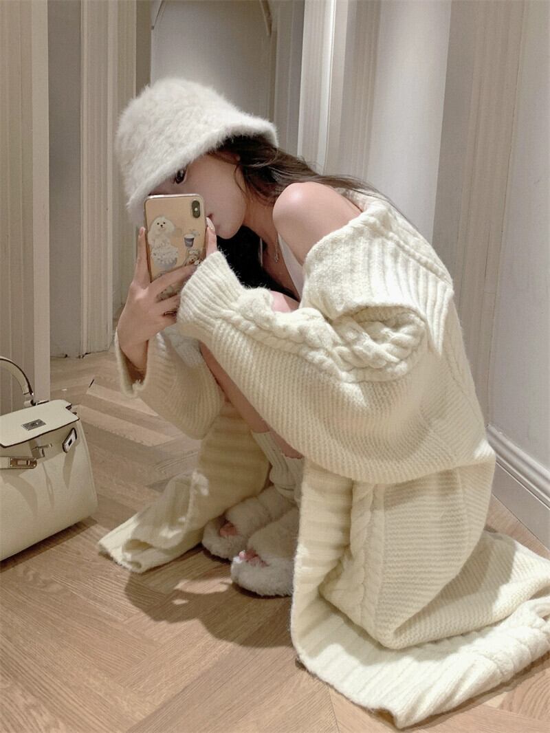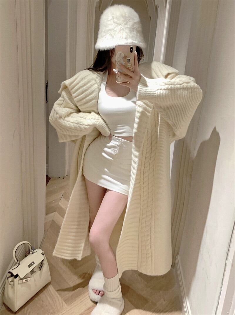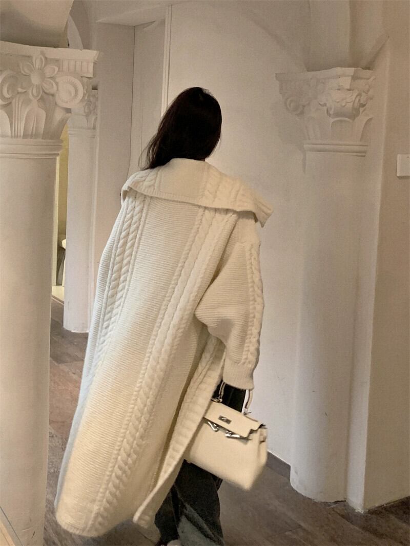 ベージュラペルセータージャケット女性秋と冬 2023 新しいハイエンド怠惰なスタイルルーズミッドレングスニットカーディガン オータム 秋物 ウィンター 冬物 857165681693880
