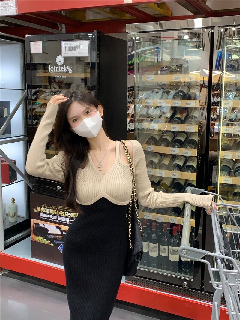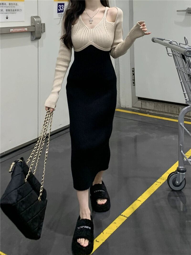 オフショルダーニットボトムドレス女性の秋の優しくシックな甘いスリムな気質のハイエンドロングスカート 大人ガーリー スウィート キュート カジュアル オータム 秋物 8571613633322209