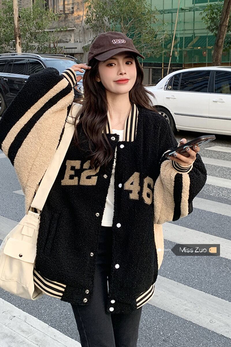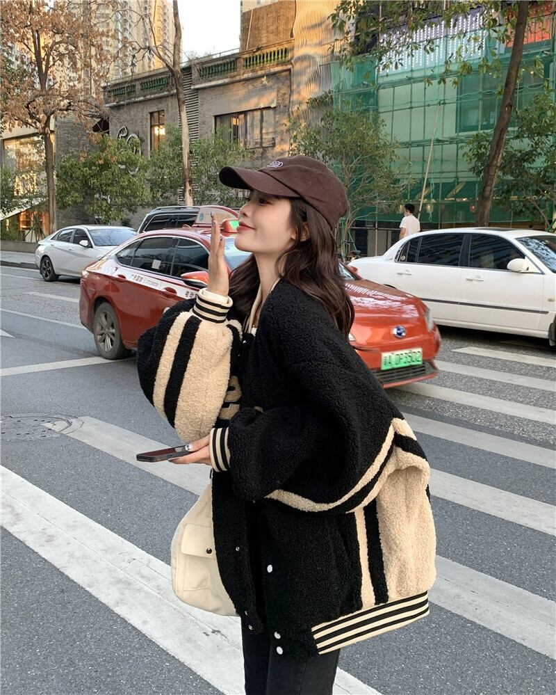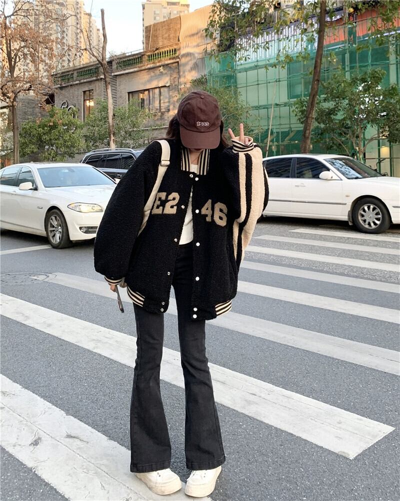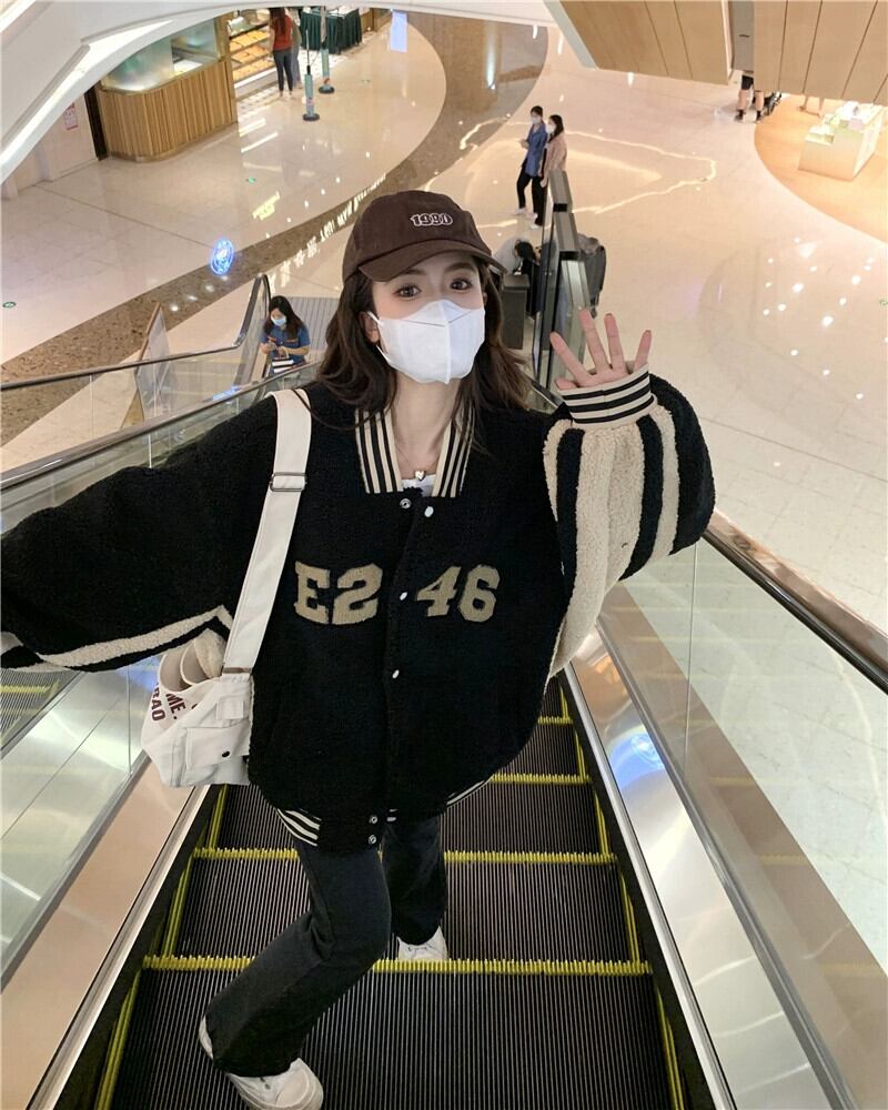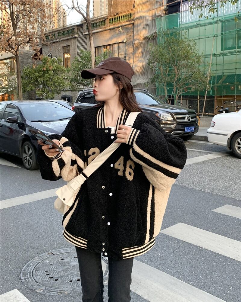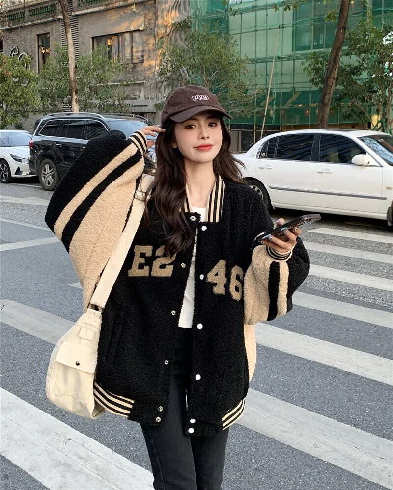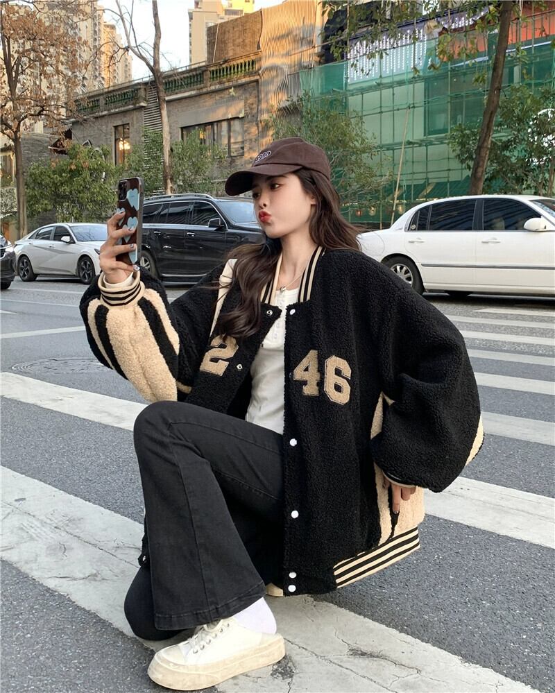 肥厚模造ラムウール野球ジャケットの女性、ハイエンドストリートスタイル 2023 秋と冬の新しい小さな黒のトップ ブラック オータム 秋物 ウィンター 冬物 8571670074613726