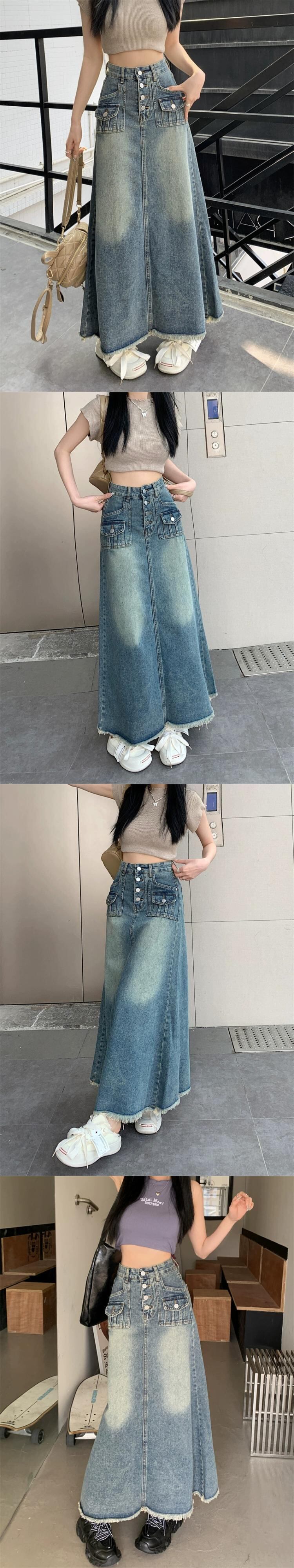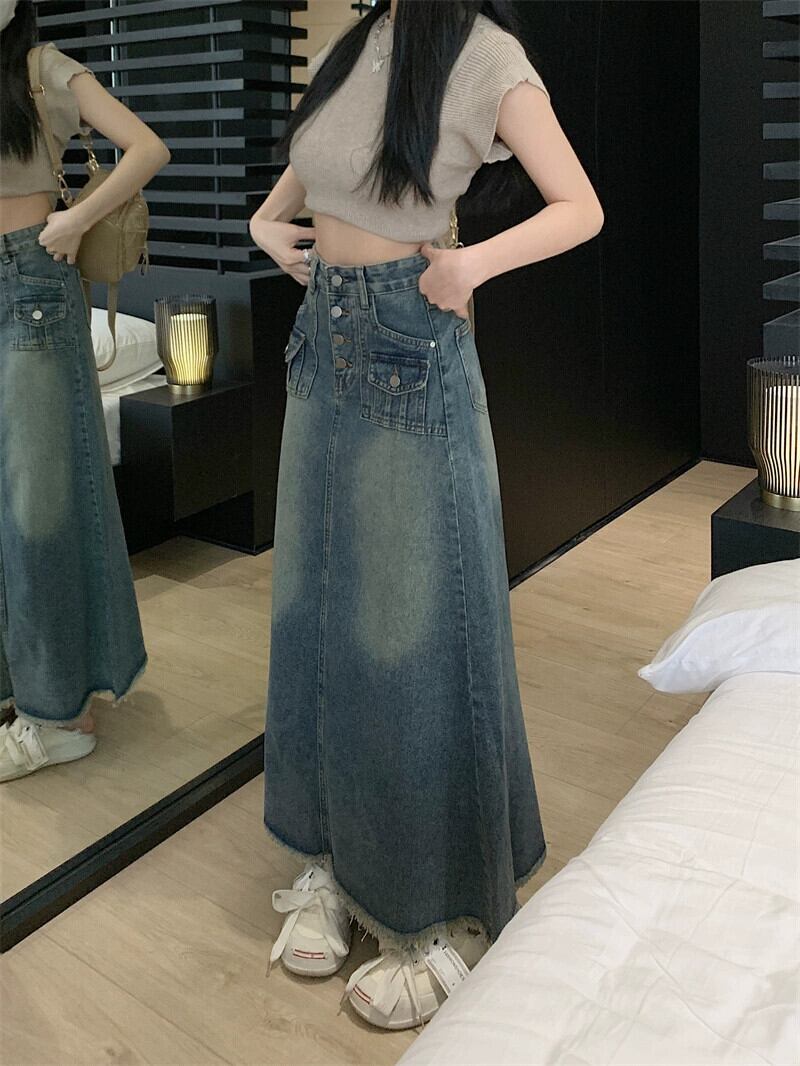 レトロデニムスカートレディースハイウエストAラインスカート2023春新作人気洋梨体型ヒップハグロングスカート スプリング 春物 857167605880785