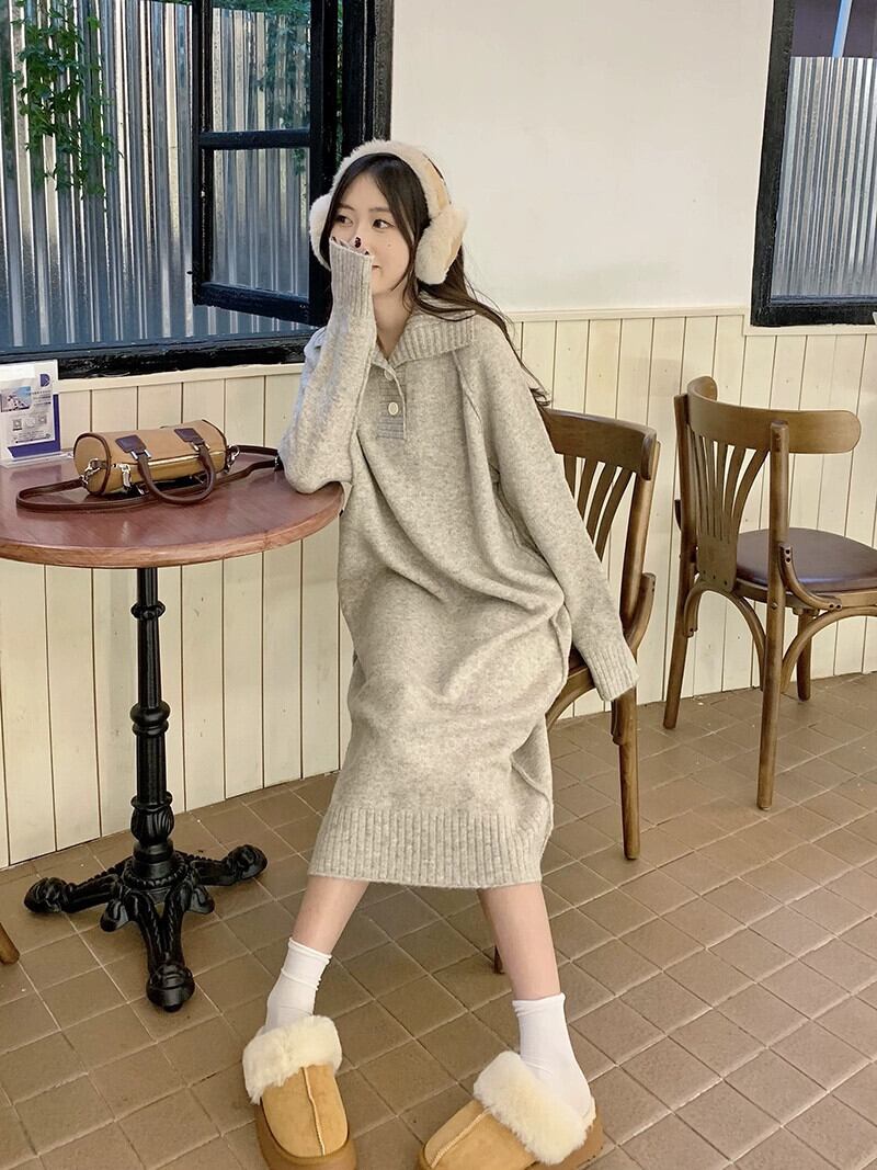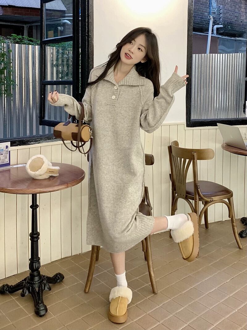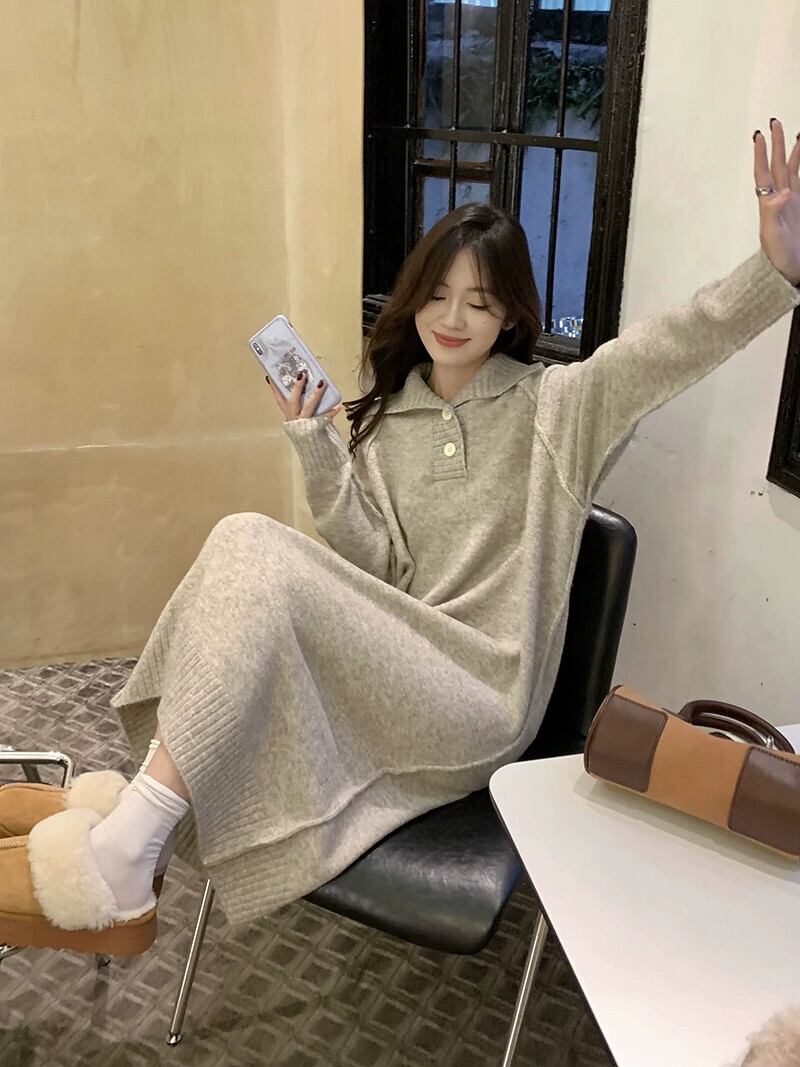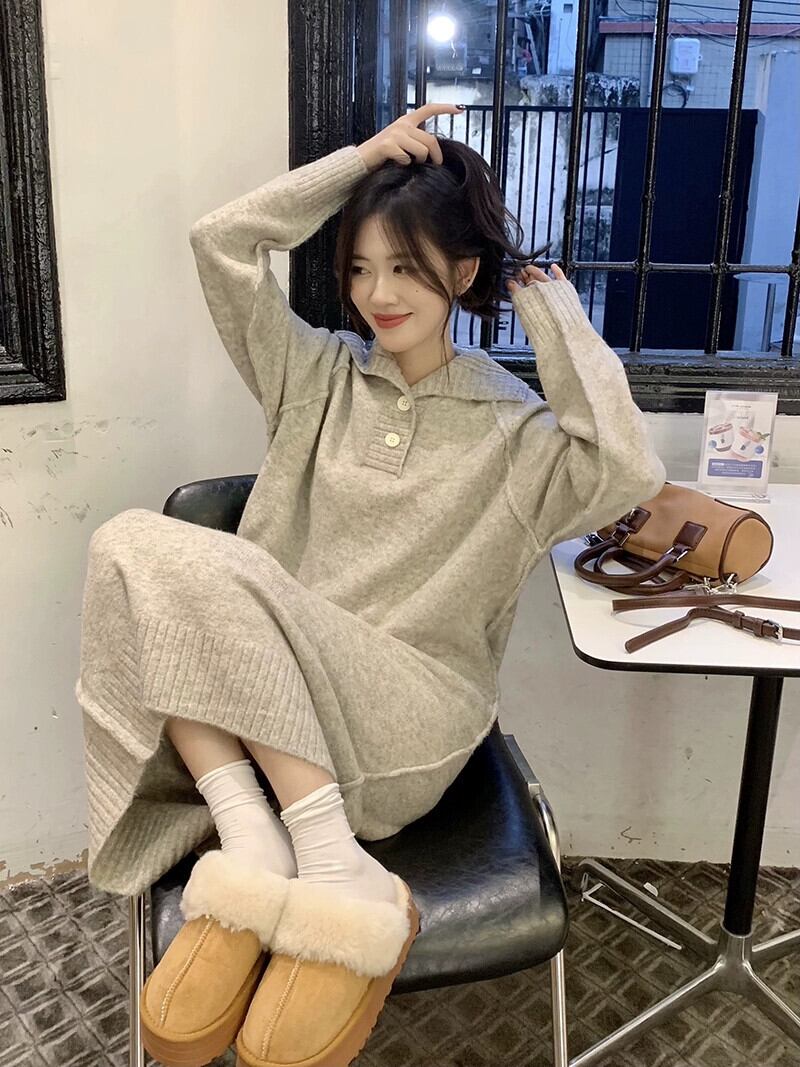 オートミールカラーのニットドレスの女性の秋と冬 2023 新しいデザインニッチセーターと底ロングスカート オータム 秋物 ウィンター 冬物 8571673409757365