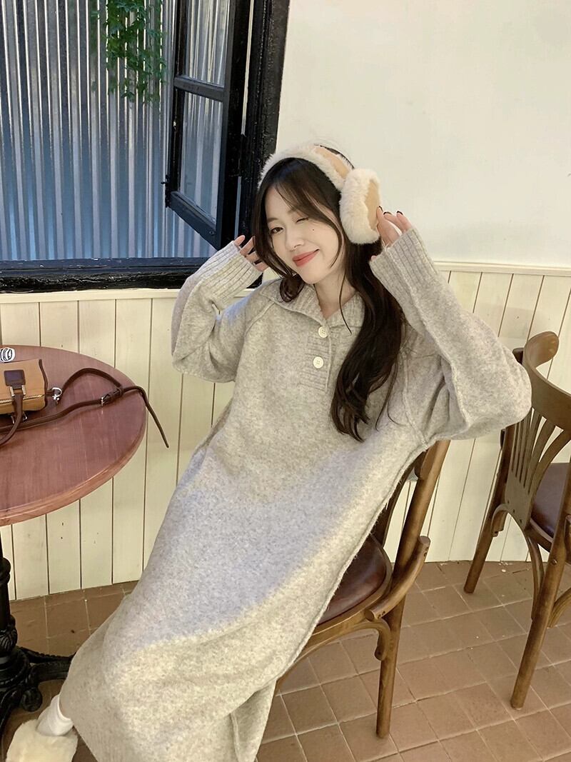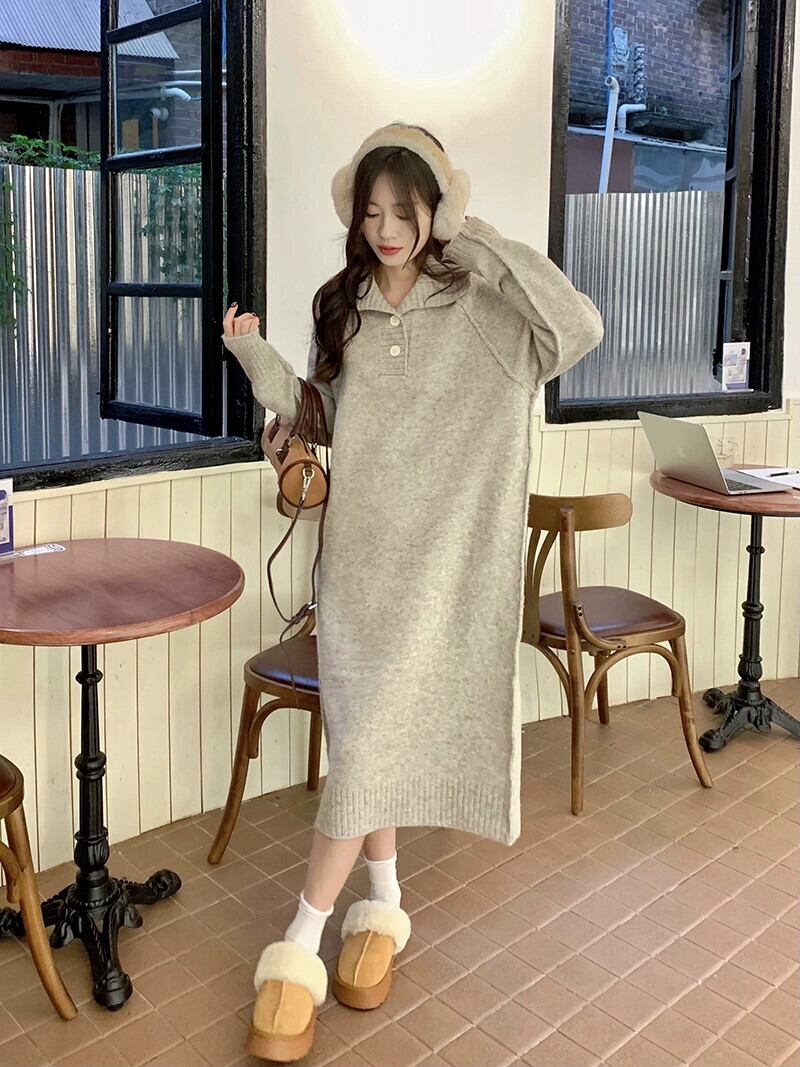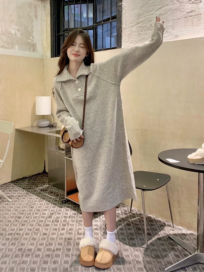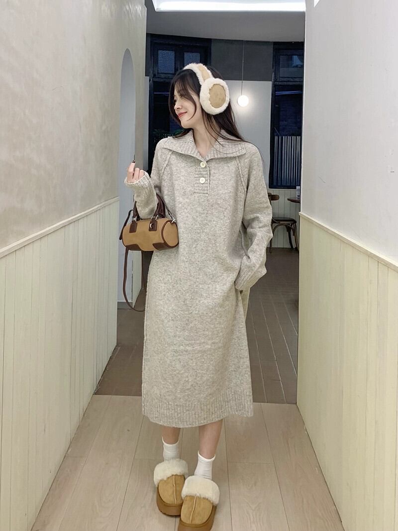 オートミールカラーのニットドレスの女性の秋と冬 2023 新しいデザインニッチセーターと底ロングスカート オータム 秋物 ウィンター 冬物 8571673409757365