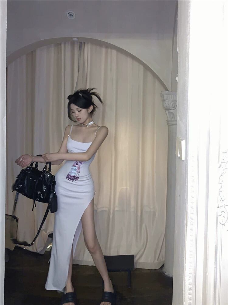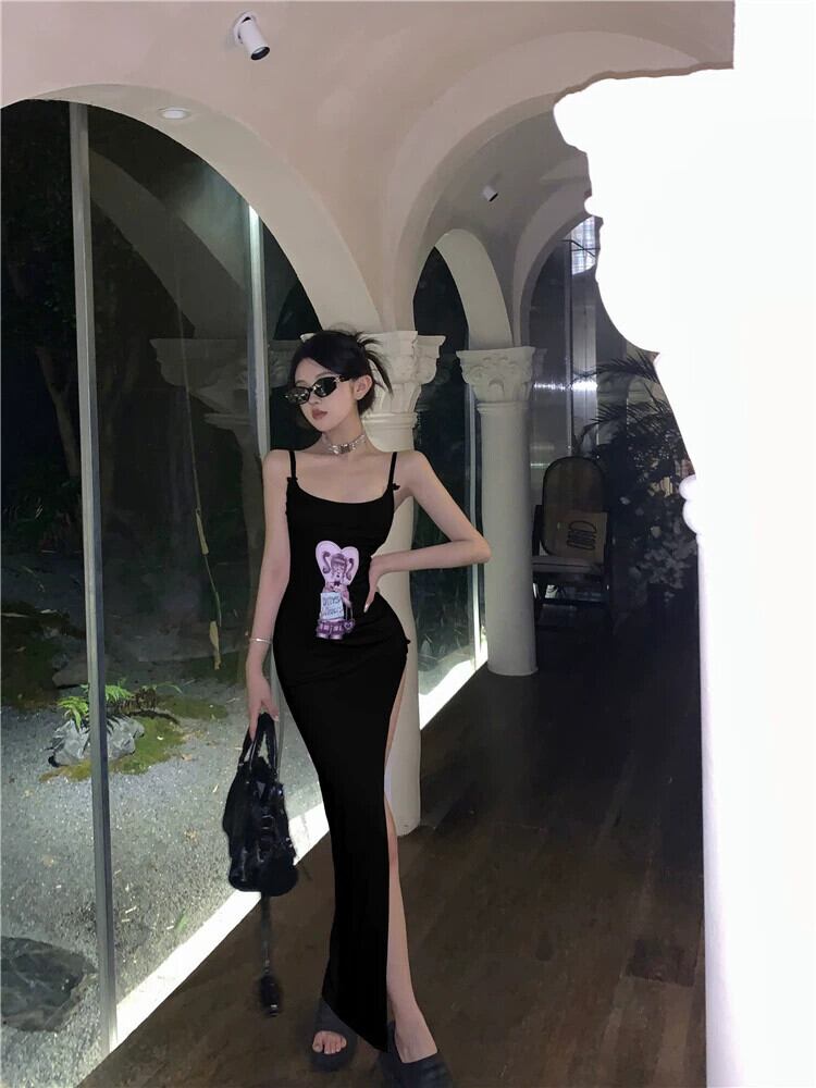 夏の黒いサスペンダードレスの女性、純粋な欲望、セクシーで大人のスタイル、美しいスリットとヒップをカバーするロングスカート ブラック サマー 夏物 ピュア 857161719952489