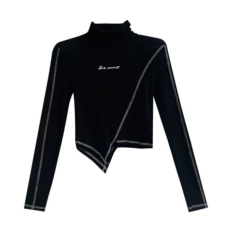 秋冬の肩パッドTシャツレディース、厚手の起毛タートルネックボトムスシャツ、不規則な半袖長袖トップ ショート ロング オータム 秋物 ウィンター 冬物 8571655064014959