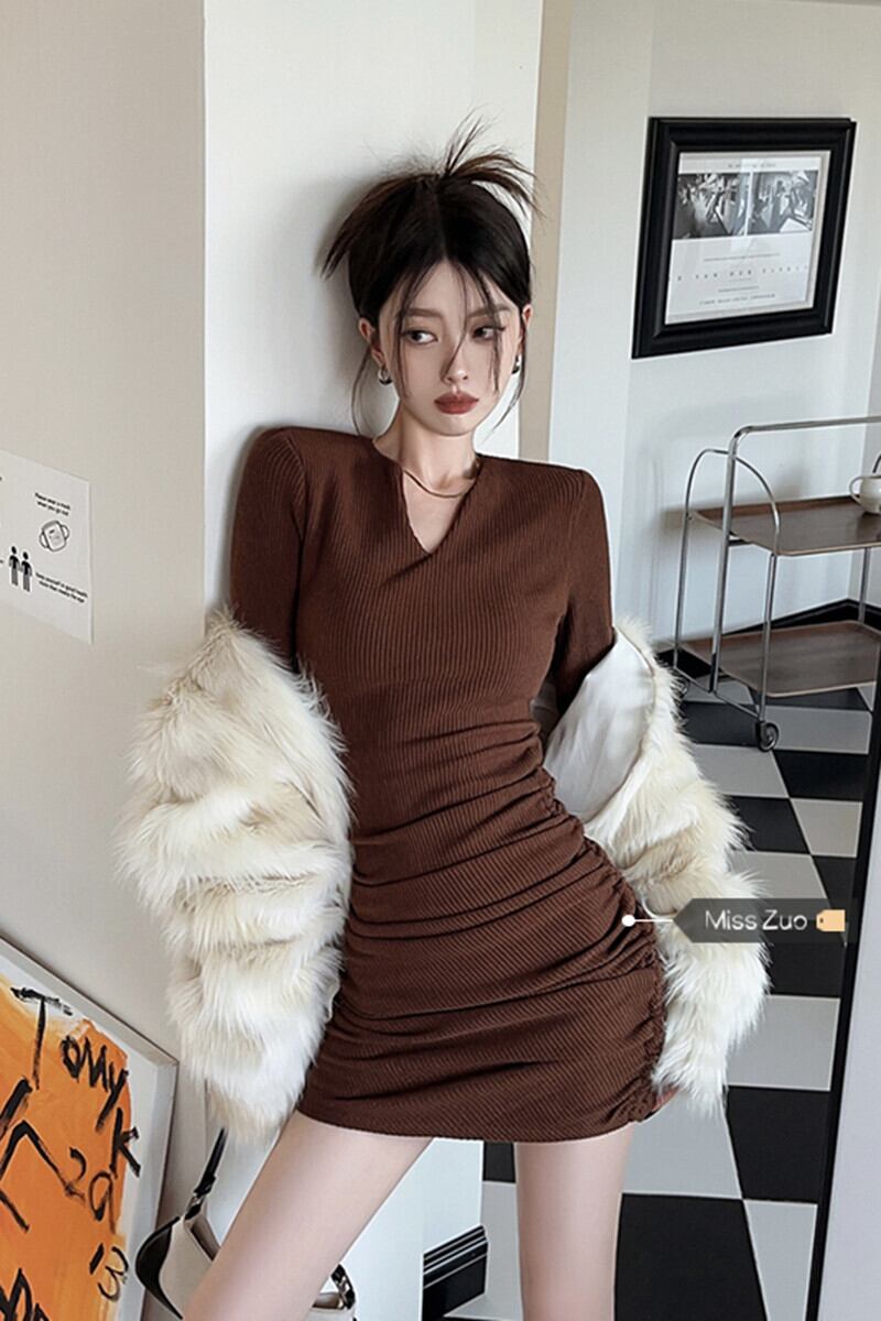 2023 年秋冬の茶色の長袖ドレスの女性の新しい痩身とヒップカバー付きショート スカート ロング オータム 秋物 ウィンター 冬物 8571630865344142