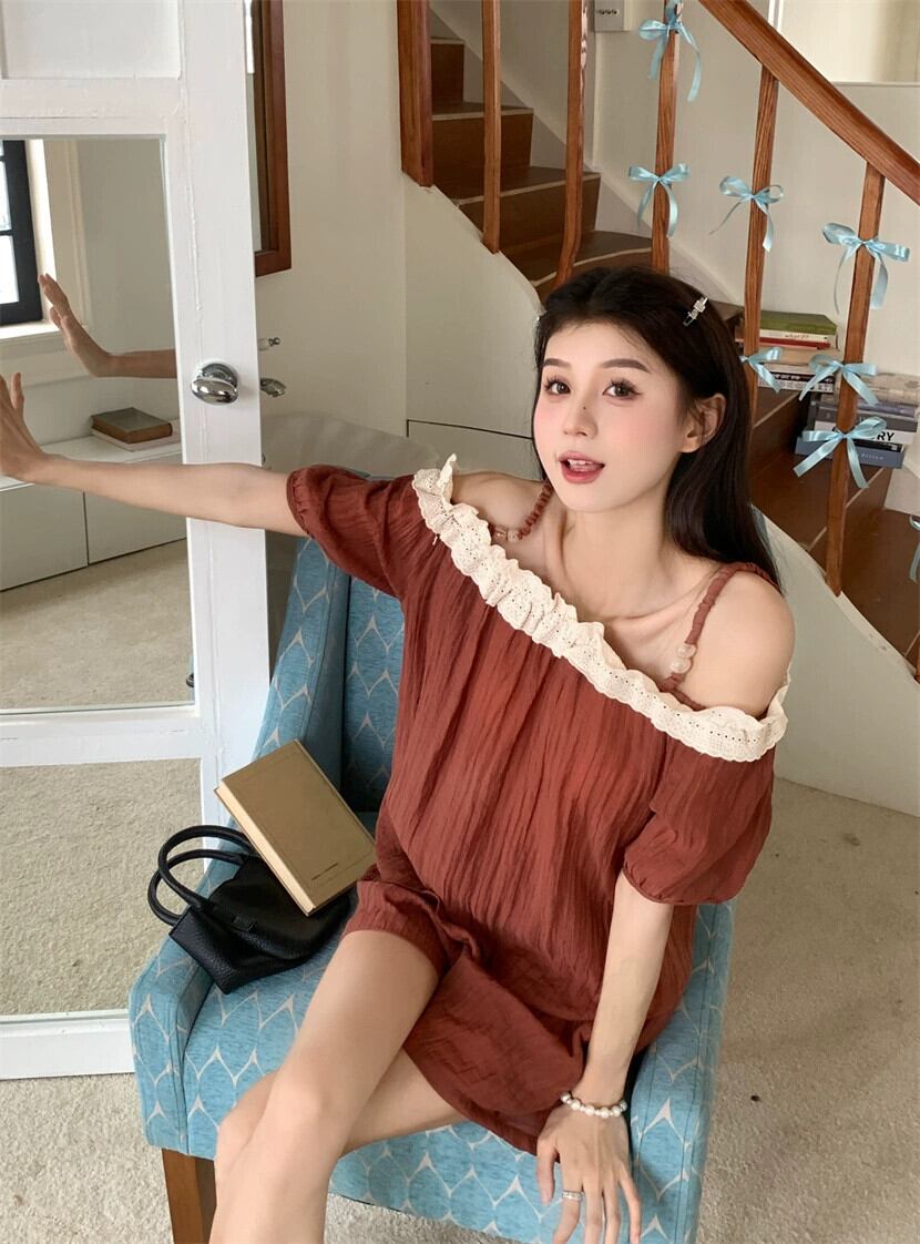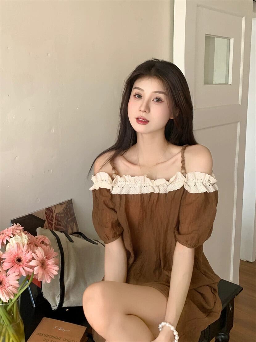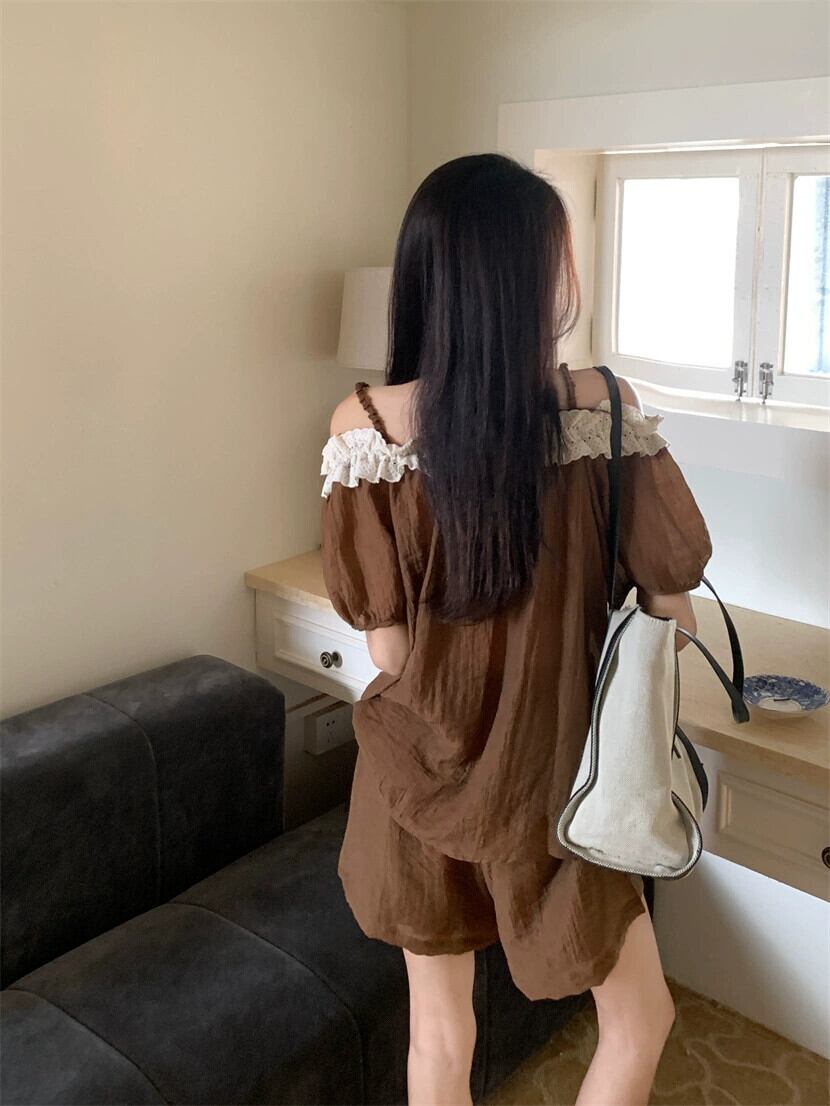 ワンショルダーサスペンダートップ女性の夏の2023新しいフレンチスイートデザインブラウン半袖シャツスーツ 大人ガーリー スウィート キュート カジュアル サマー 夏物 8571680660912711