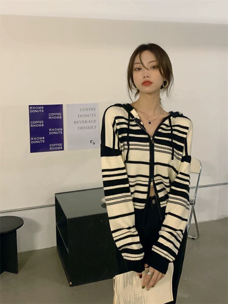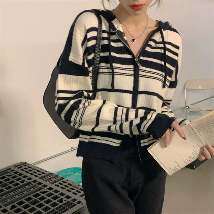 ストライプニットカーディガン女性の初秋の新しいジッパージャケットデザインニッチスタイルフード付きショートトップ オータム 秋物 857161360208666