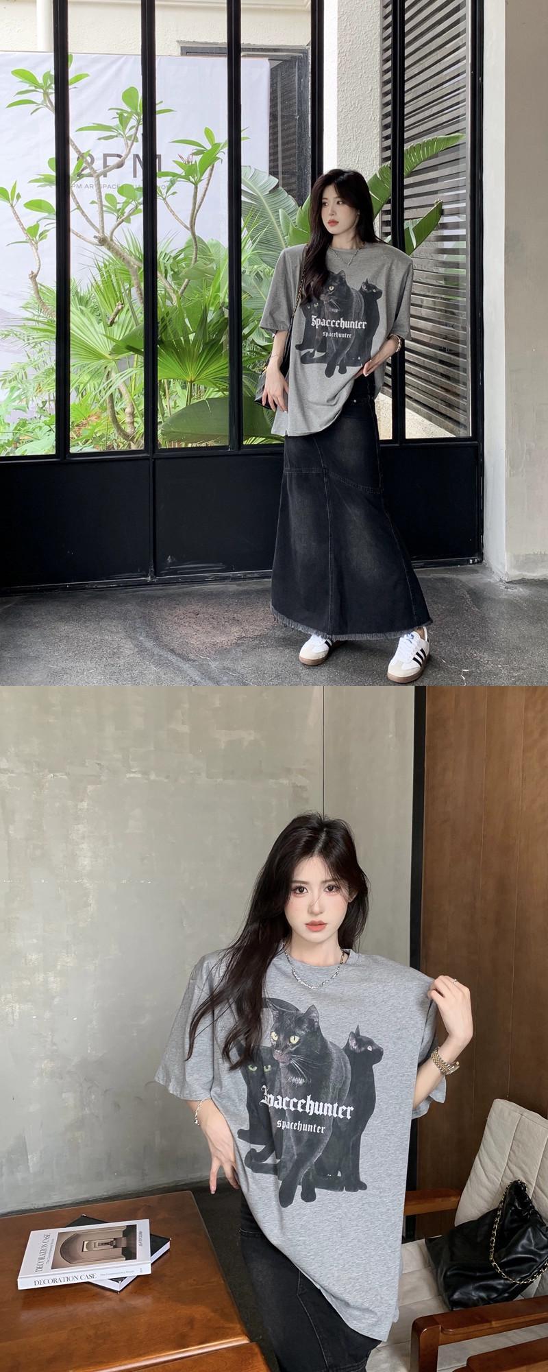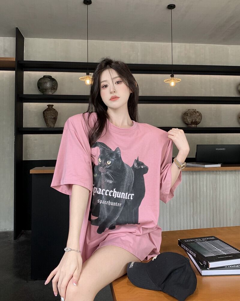 ピンクのプリント半袖 T シャツの女性の夏ヨーロッパ商品大型バージョン レトロなルーズなミドル丈のボトムス、肩パッドが欠けているトップ サマー 夏物 Tシャツ ヨーロピアン 857168429188702