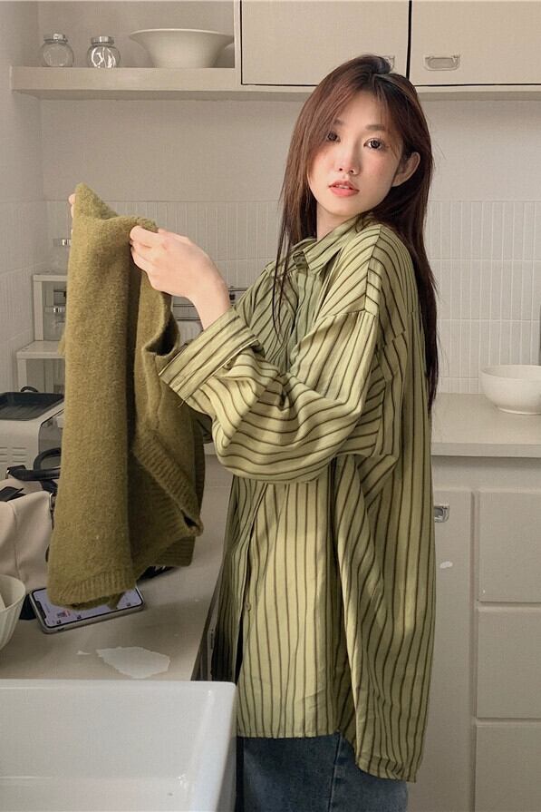 グリーンストライプ長袖シャツレディースデザインレイヤードシャツ2023初秋の新しいユニークなユニークなトップ ロング レッド オータム 秋物 8571658447074736