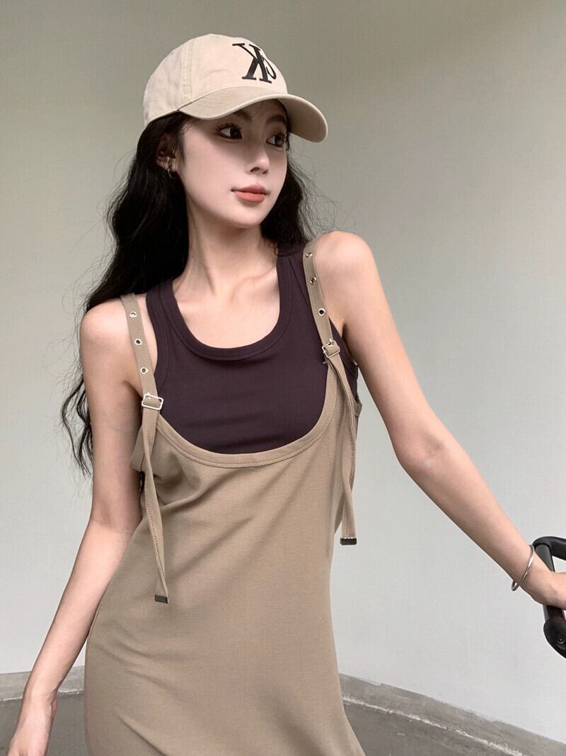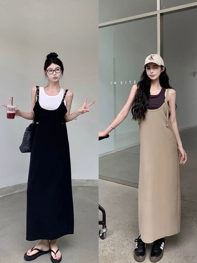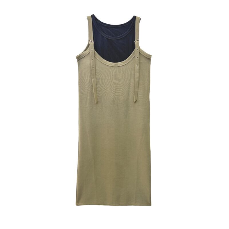 カーキサスペンダースカートレディース2023夏新作香港スタイルレトロシック痩身スリットロングスカート サマー 夏物 8571624675376696