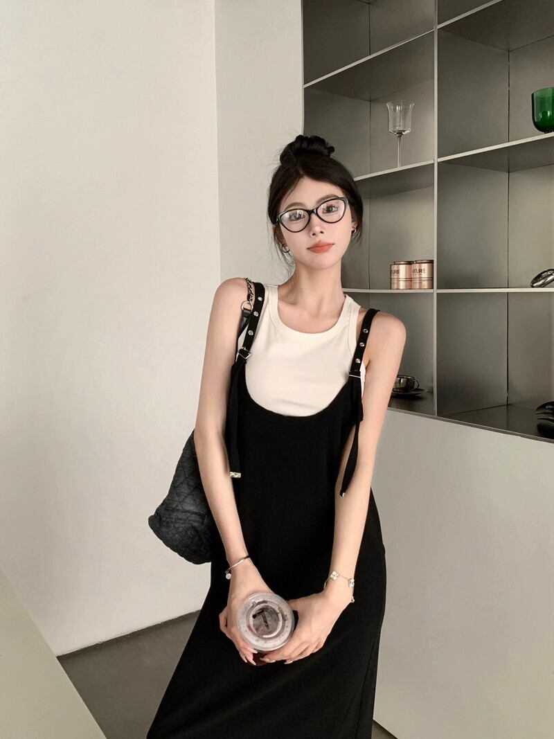 色:グレーのベスト,カーキストラップドレス,白いベスト,ブラックサスペンダースカート