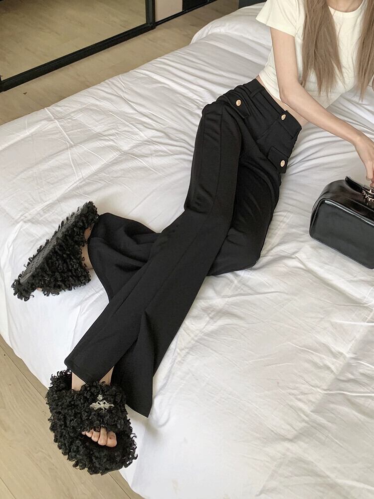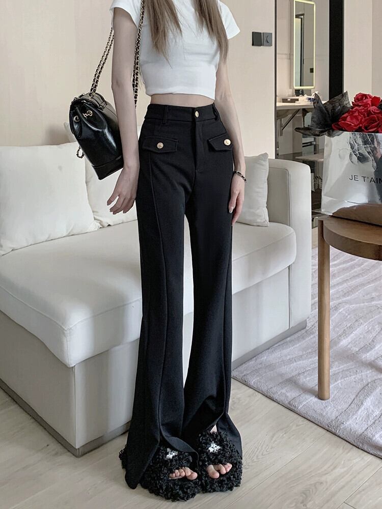 黒のスリットベルボトムの女性 2023 夏の新しいフロアモップパンツ小柄な今年の人気のカジュアルパンツ ブラック サマー 夏物 8571674029032638