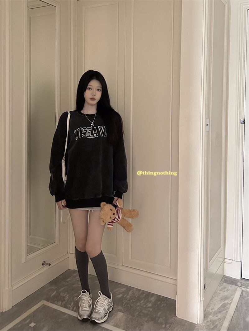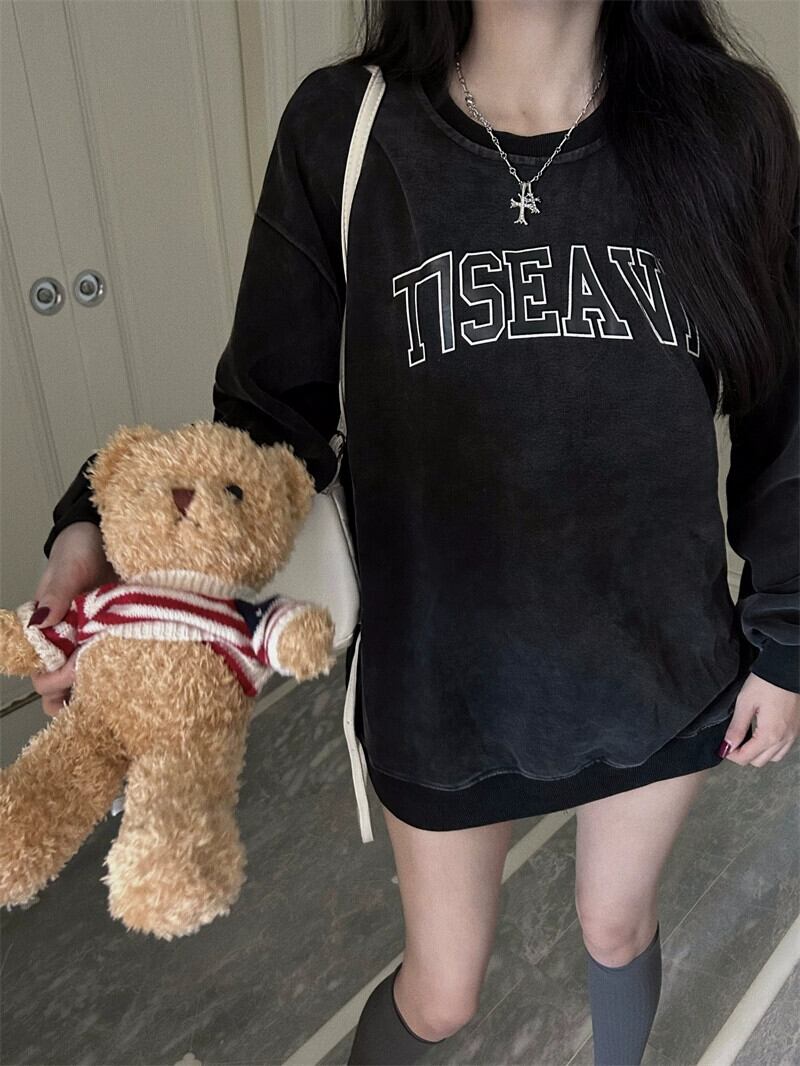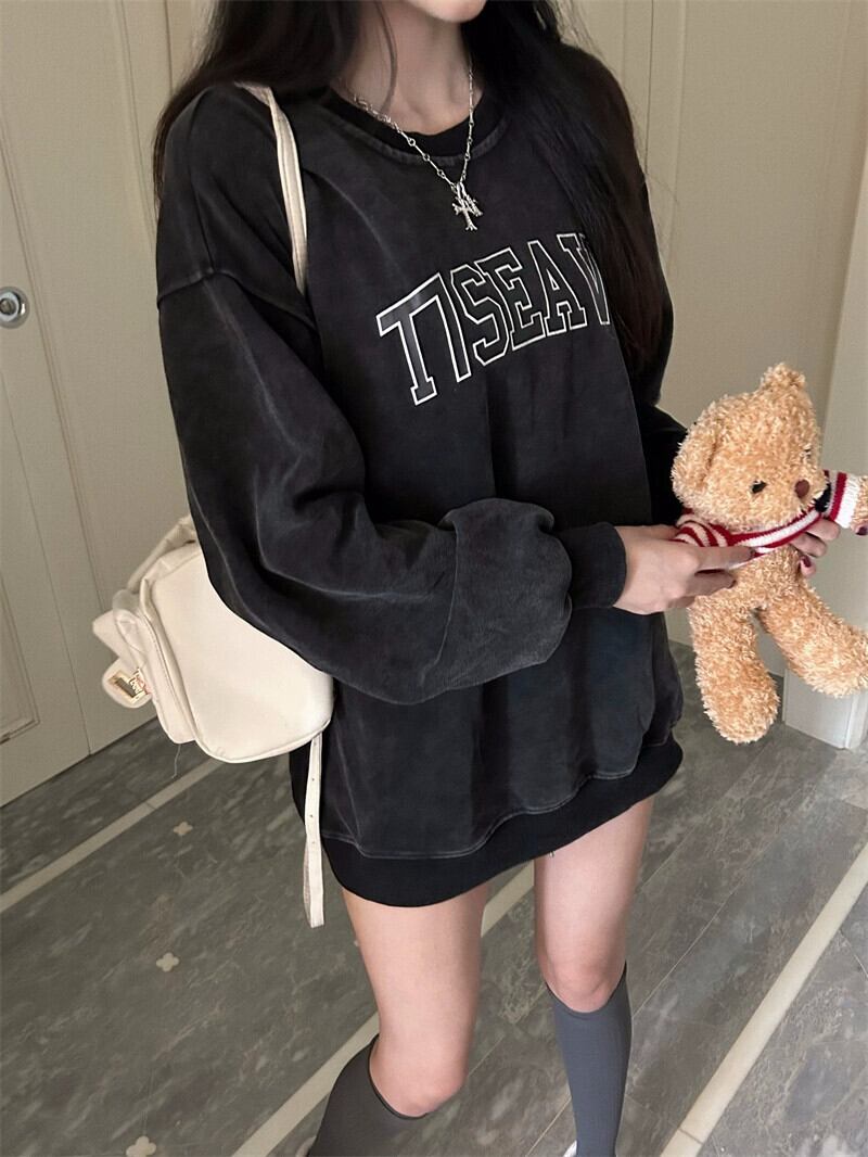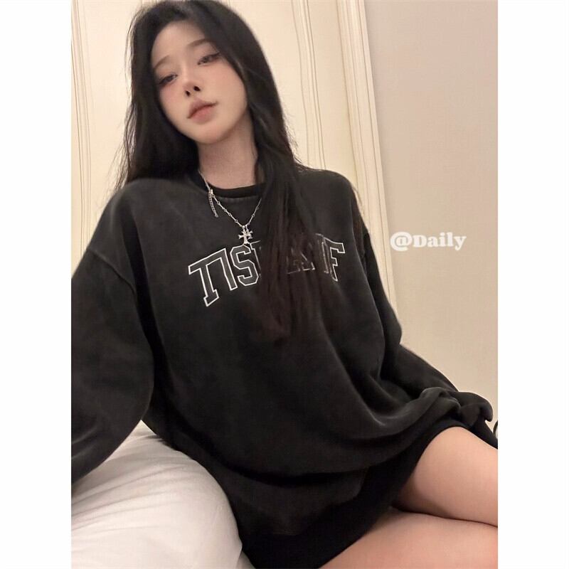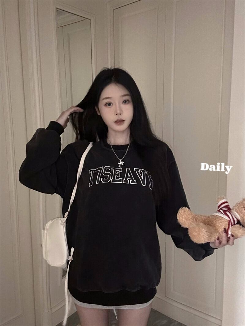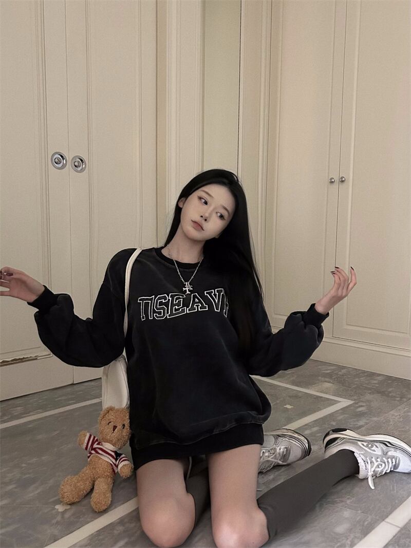黒のラウンドネックスウェットシャツの女性の 2023 秋の新しいアメリカンレトロトレンディなブランドゆるい怠惰なスタイルのミッドレングストップ ブラック オータム 秋物 Oネック 8571653080232679