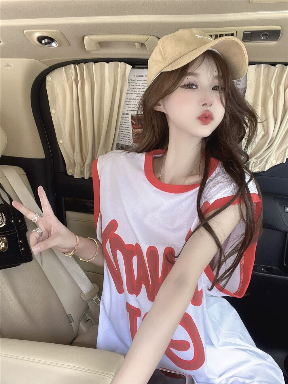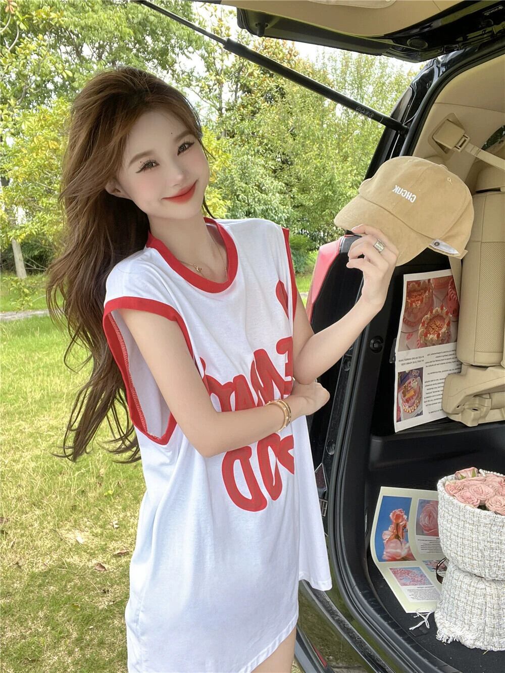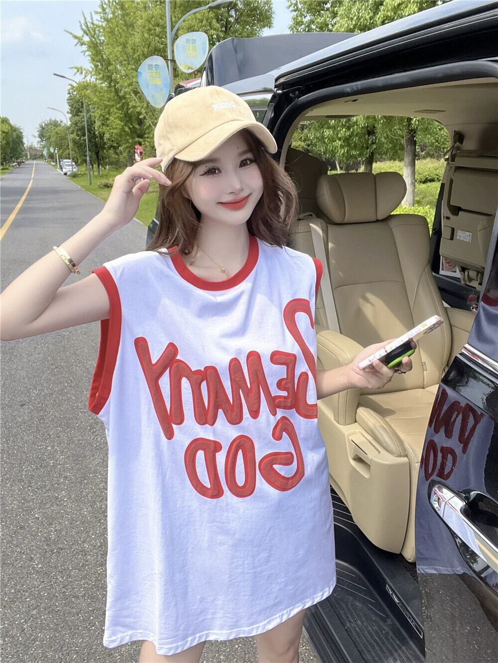 白いノースリーブ Tシャツベスト女性夏フォームレタープリントアメリカンストリートスタイルミッドレングスボトムストップが欠けています ホワイト サマー 夏物 8571688681205044