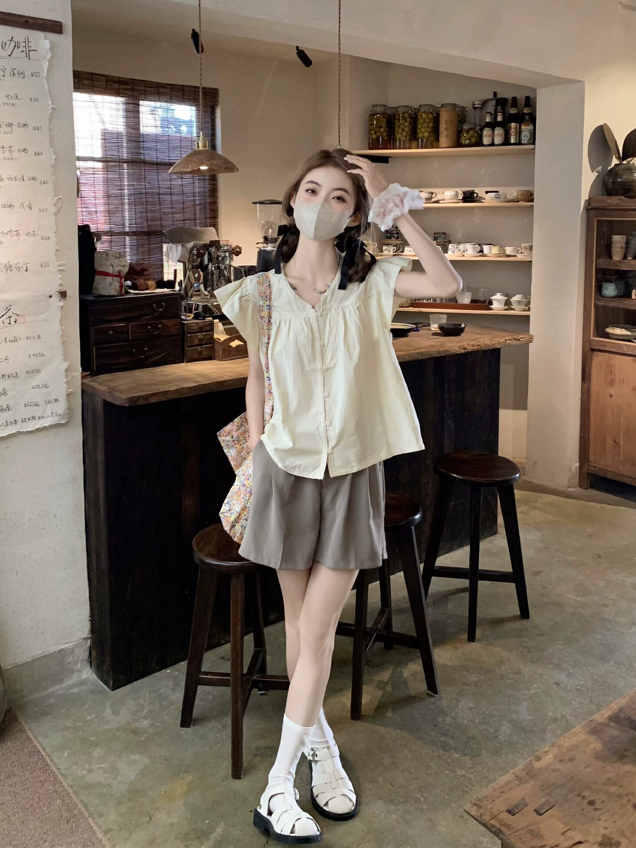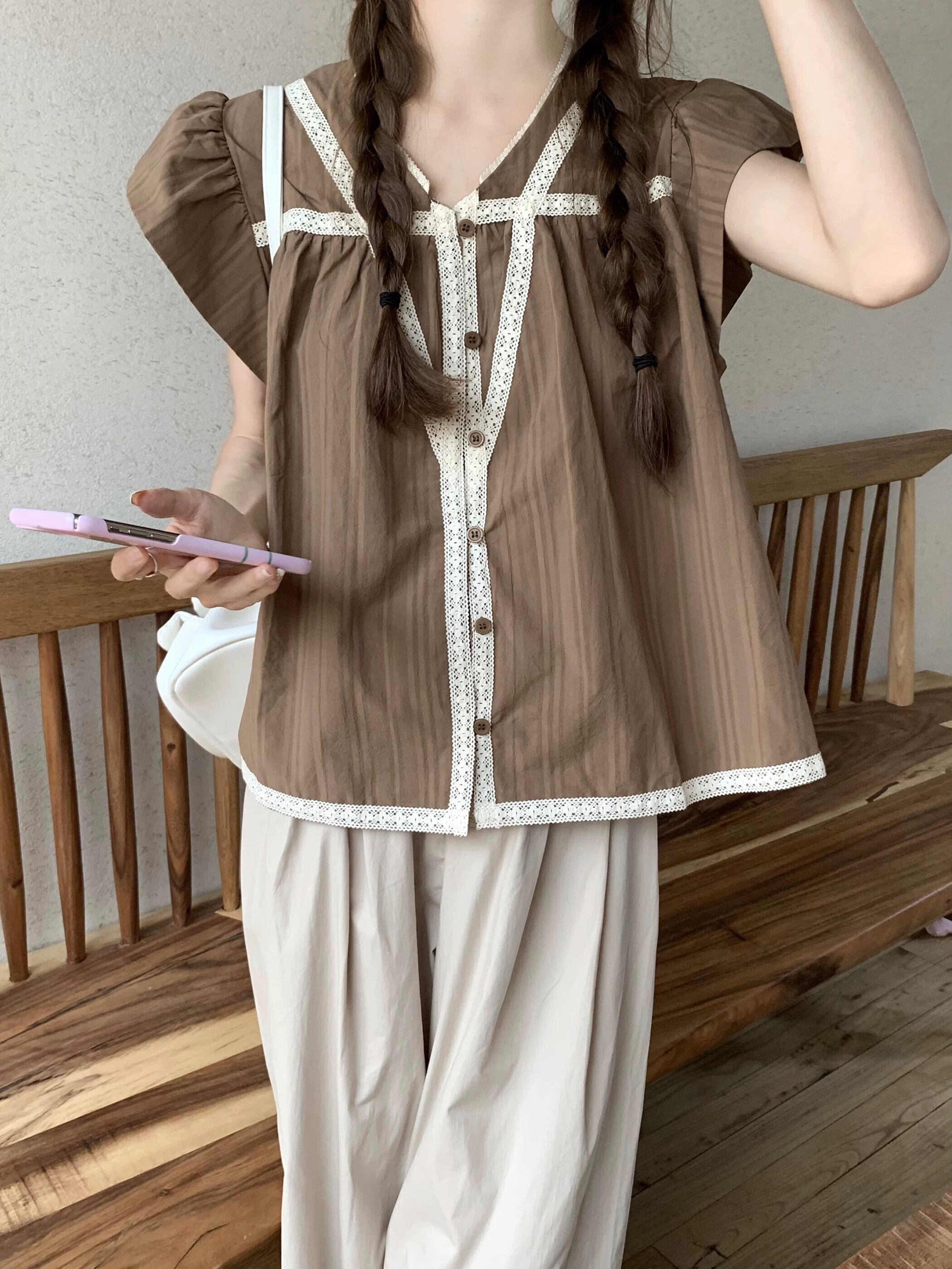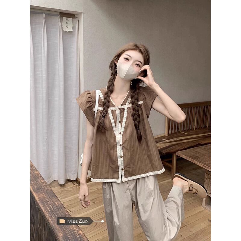 小さなフライングスリーブ V ネックトップ女性の夏の 2023 新しいフレンチスタイルの甘くてシックな美しいレースのコーヒーカラーのシャツ 大人ガーリー スウィート キュート カジュアル サマー 夏物 Vネック 8571623409316046