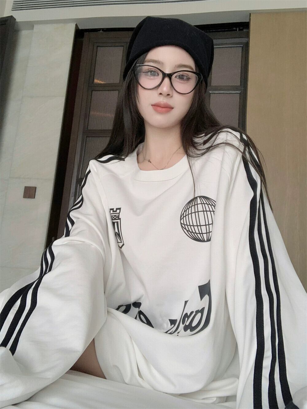 ホワイトラウンドネックスウェットシャツレディース秋アメリカンレトロトレンディブランド怠惰なスタイルの 3 つのストライプのミッドレングスお尻をカバーするトップ オータム 秋物 Oネック 8571648314367481